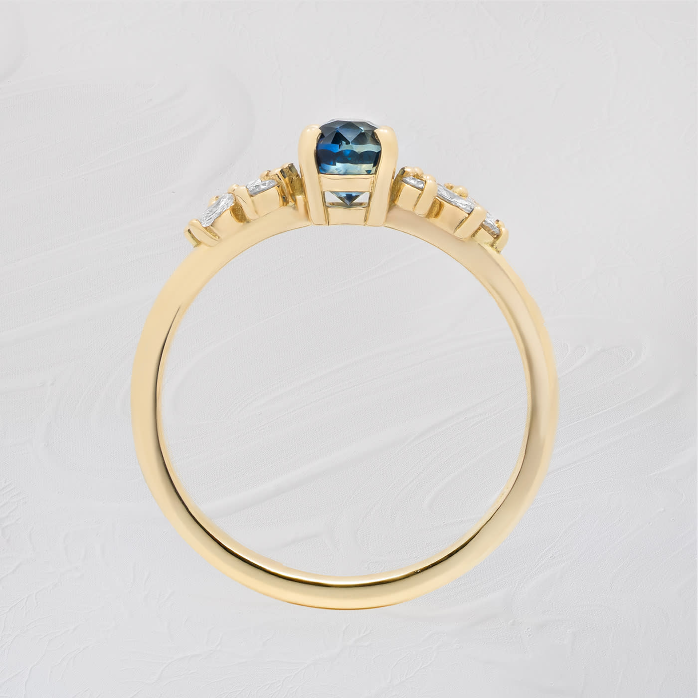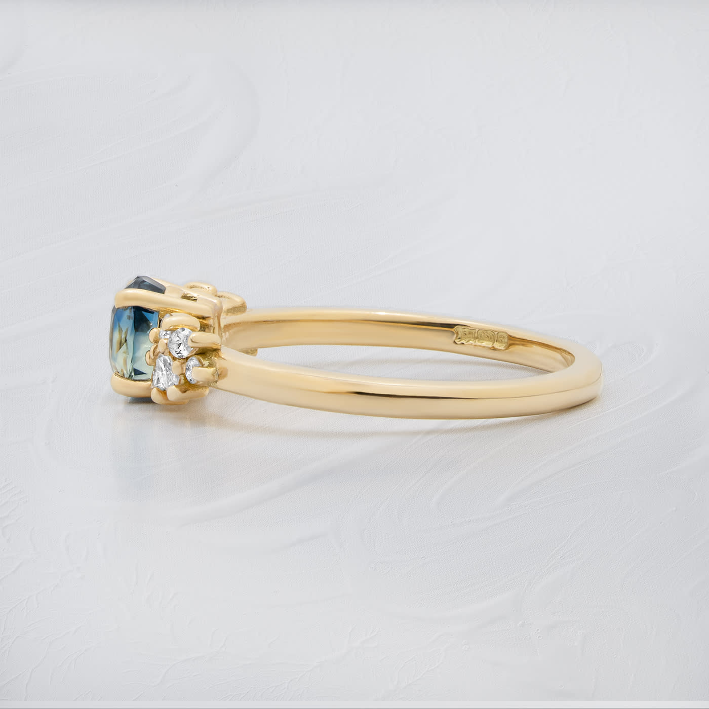 This brand new ring features a mesmerizing oval cut ocean teal sapphire, set with a mixture of marquise and round cut diamonds in a flowing, floral inspired pattern, all in 18ct yellow gold. The ring is designed to be low profile from the finger.