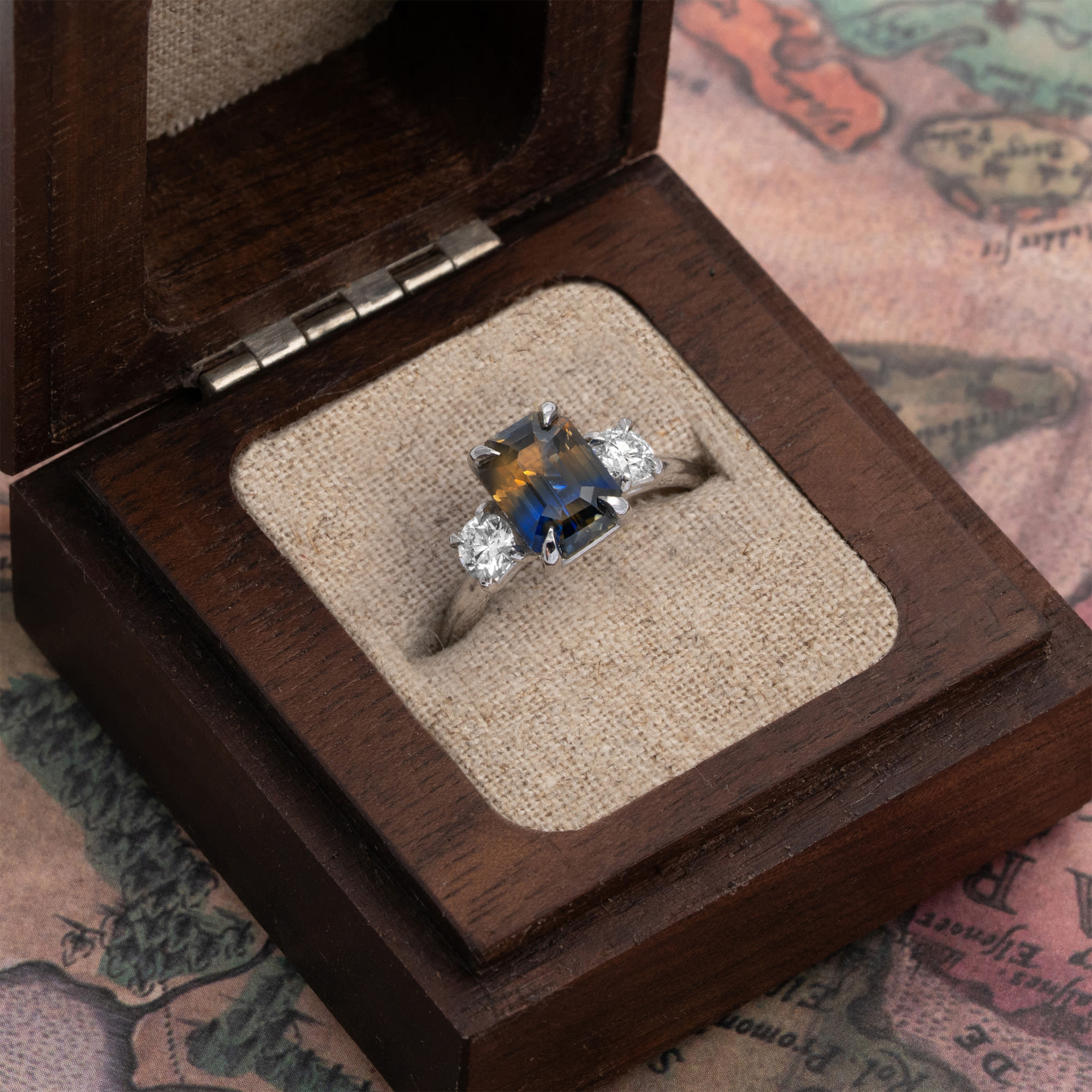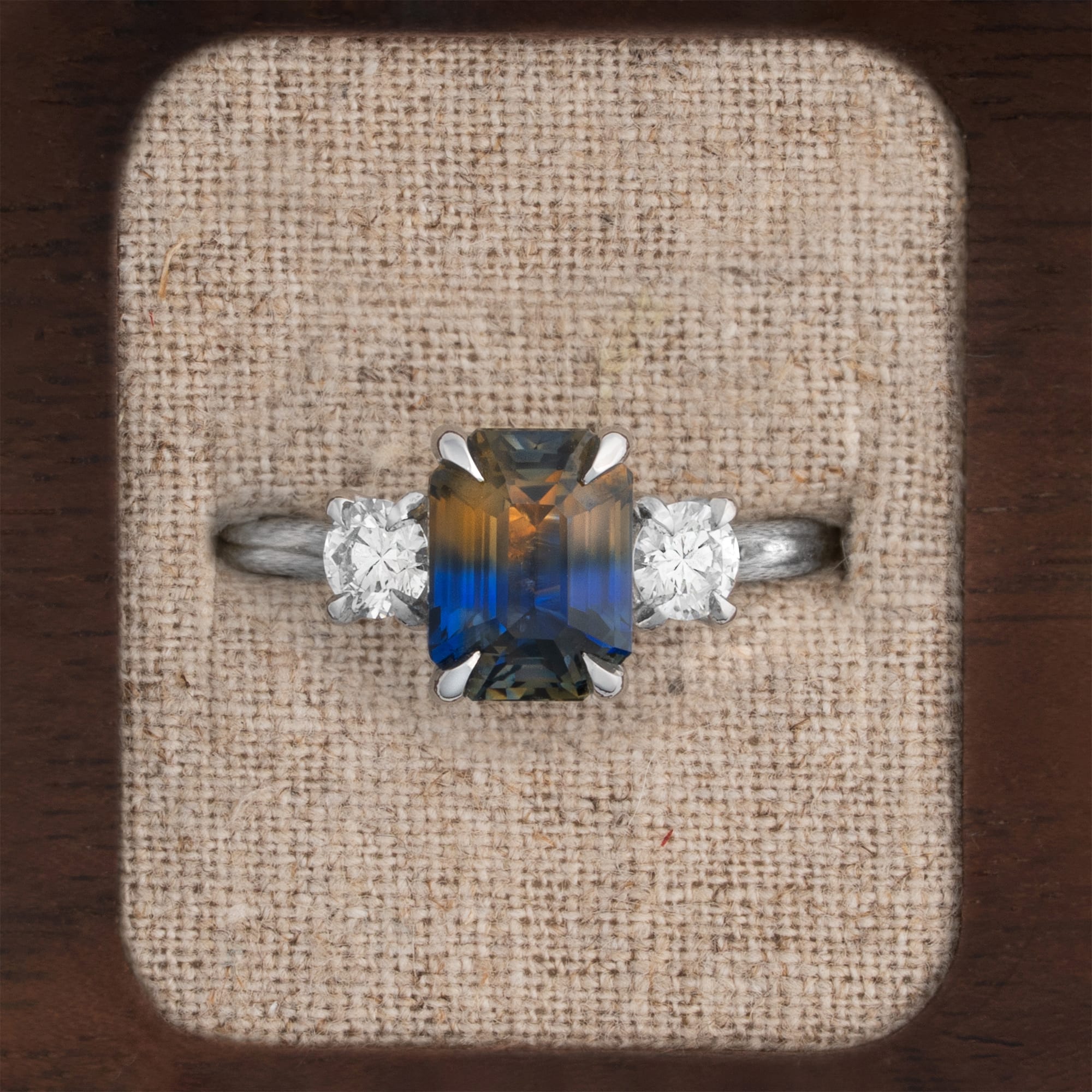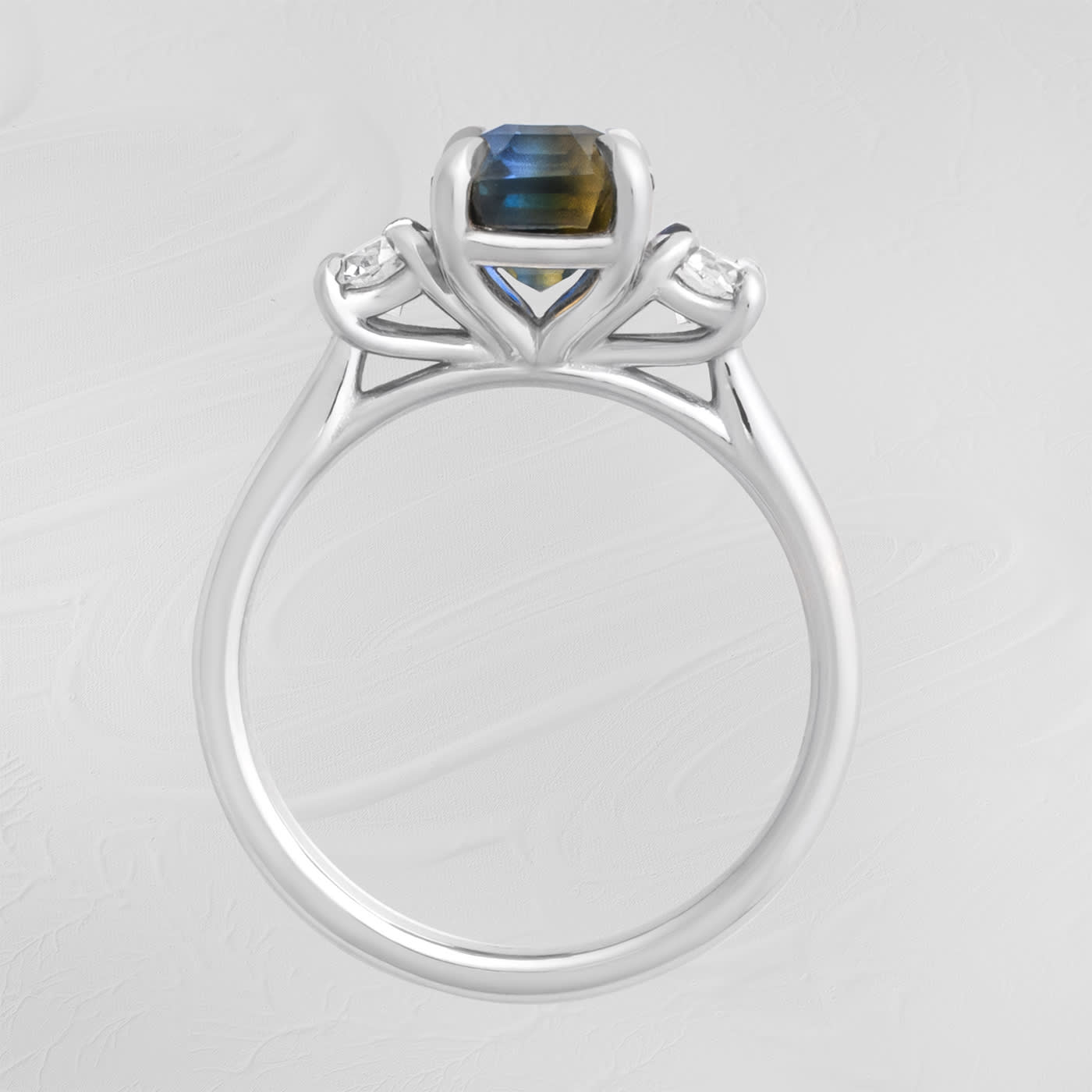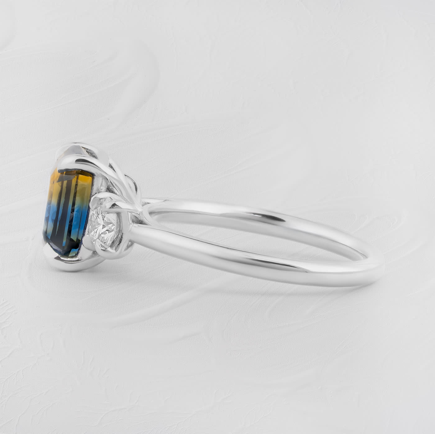 This trilogy engagement ring is set in an intricate platinum mount, featuring an extremely unique, unheated, bi coloured sapphire. The sapphire displays an almost even horizontal split between golden orange and royal blue, making it exceptionally rare. The central sapphire is flanked by two lab-grown, round brilliant cut diamond accent stones. The platinum mount provides a secure and durable setting for this fine jewellery piece.