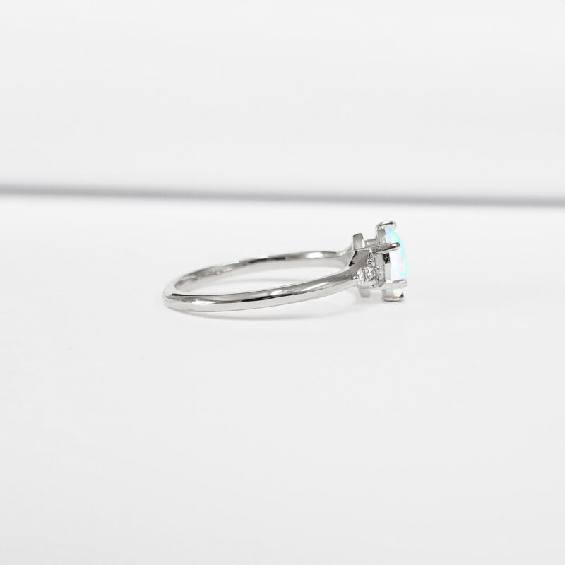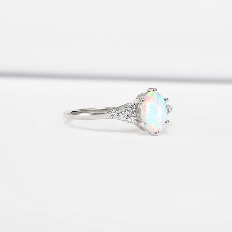 This brand new stunning ring features a central oval cut Australian Opal, flanked by eight brilliant cut diamonds in a stunning mount!