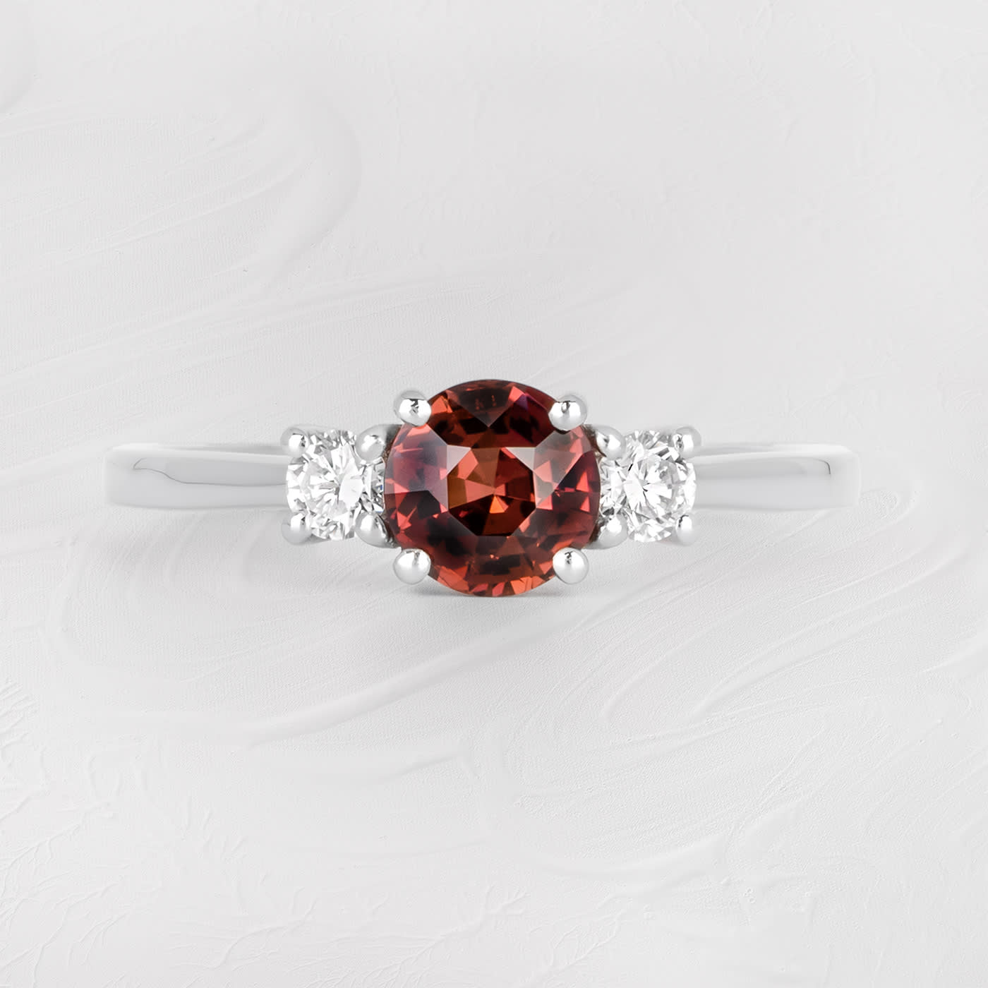 This brand new stunning ring features a central round cut natural reddish orange sapphire, that has been prong set with two lab grown diamonds, in a sleek and elegant low profile mount.