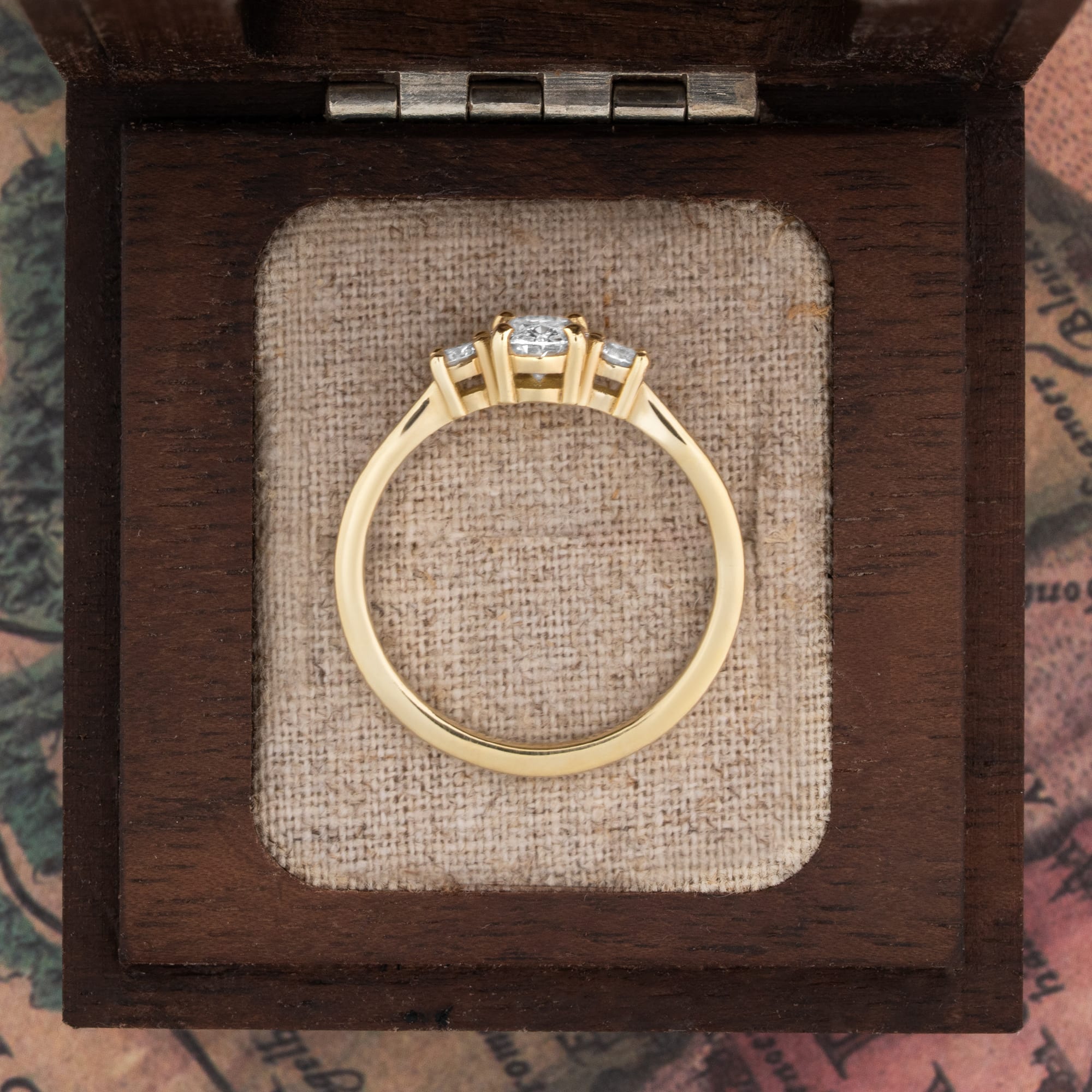 Description: This trilogy engagement ring features a central 0.70ct oval lab-grown diamond set between two round brilliant lab-grown accent diamonds. The low-profile setting and 1.8 mm band thickness contribute to a comfortable and functional design. This fine jewellery piece balances the distinct shapes of the centre stone and side stones for a classic profile.