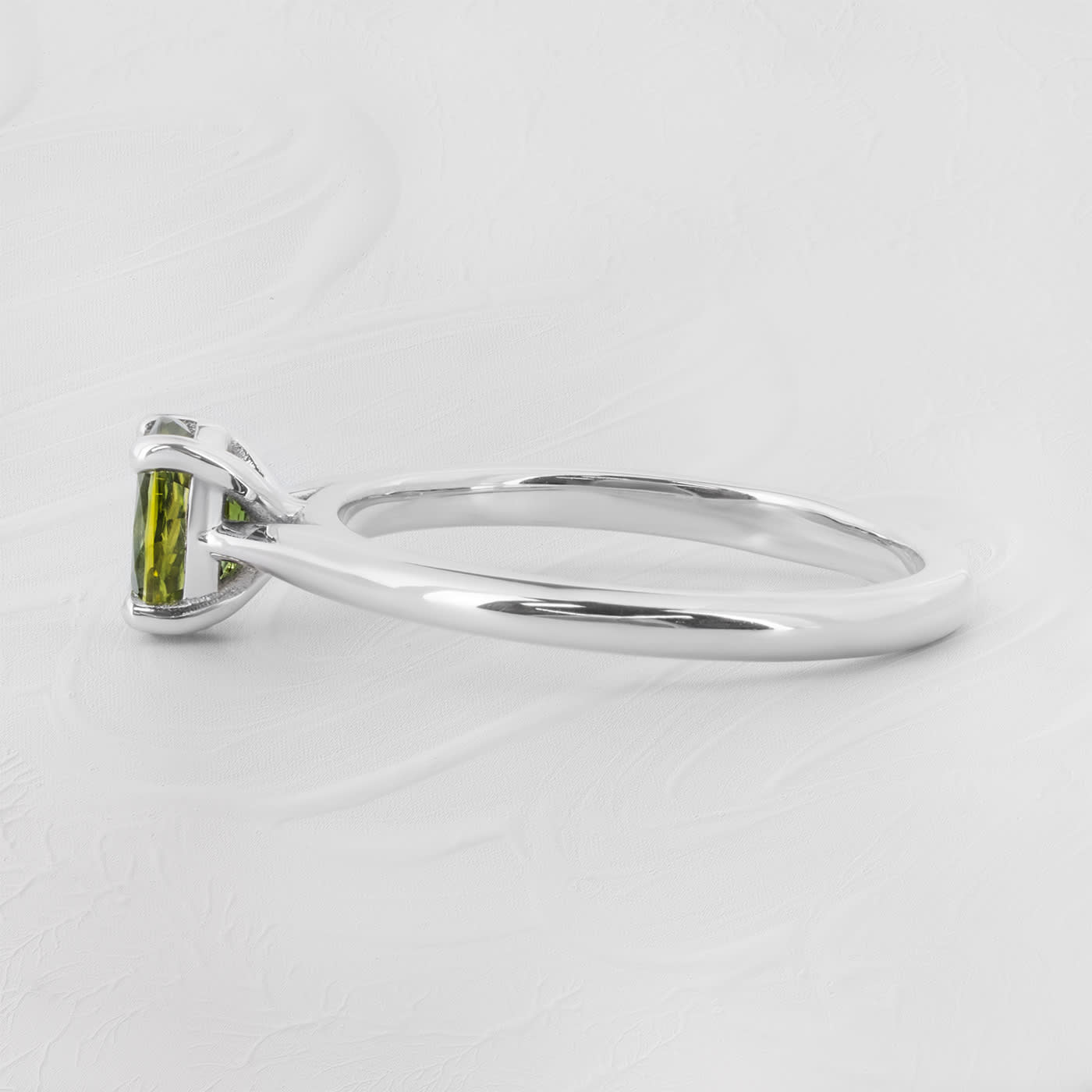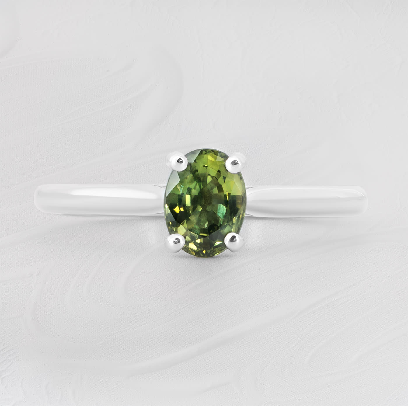 This beautiful new ring features a central 0.86 carat natural green sapphire. It has been 4 talon set in a classic platinum solitaire setting.