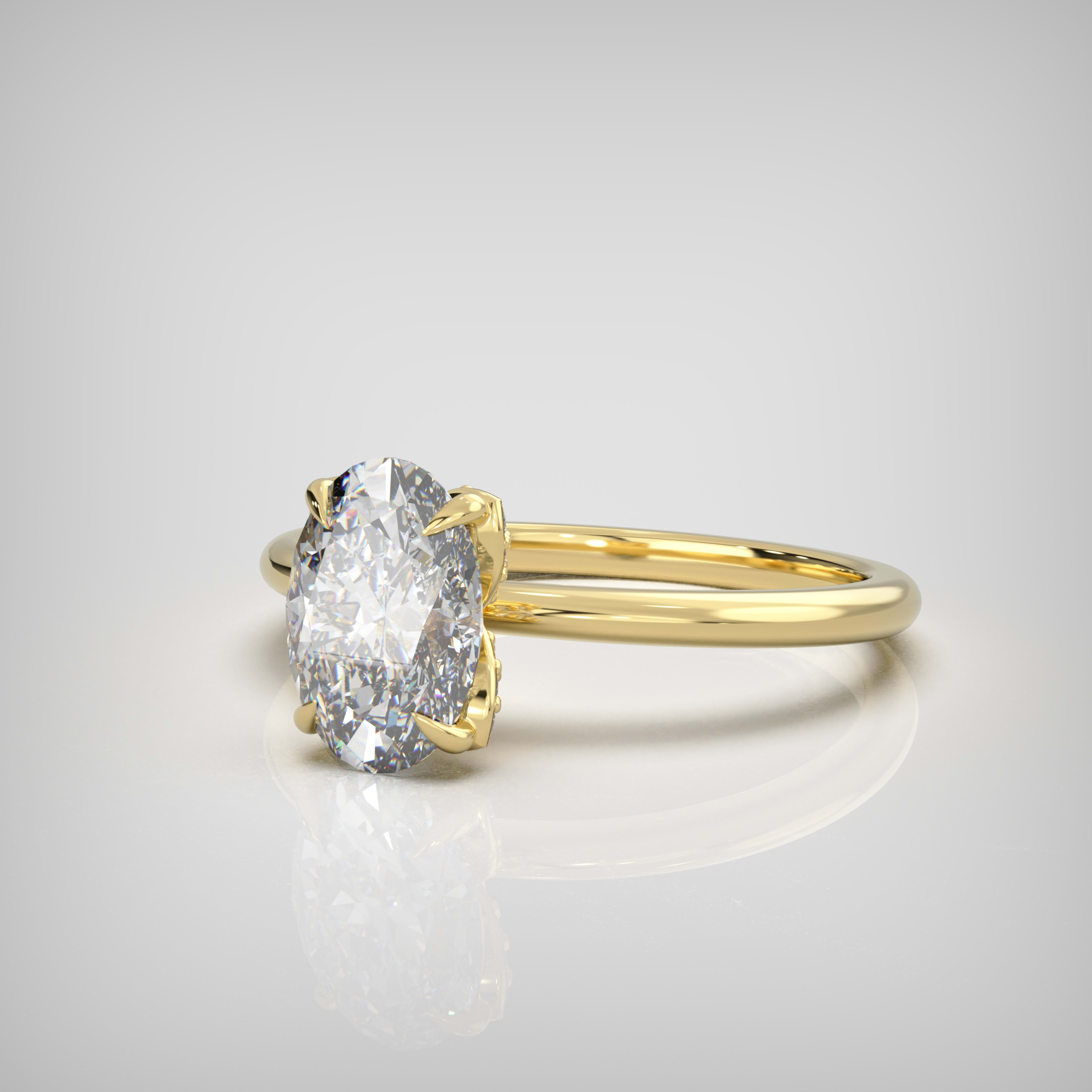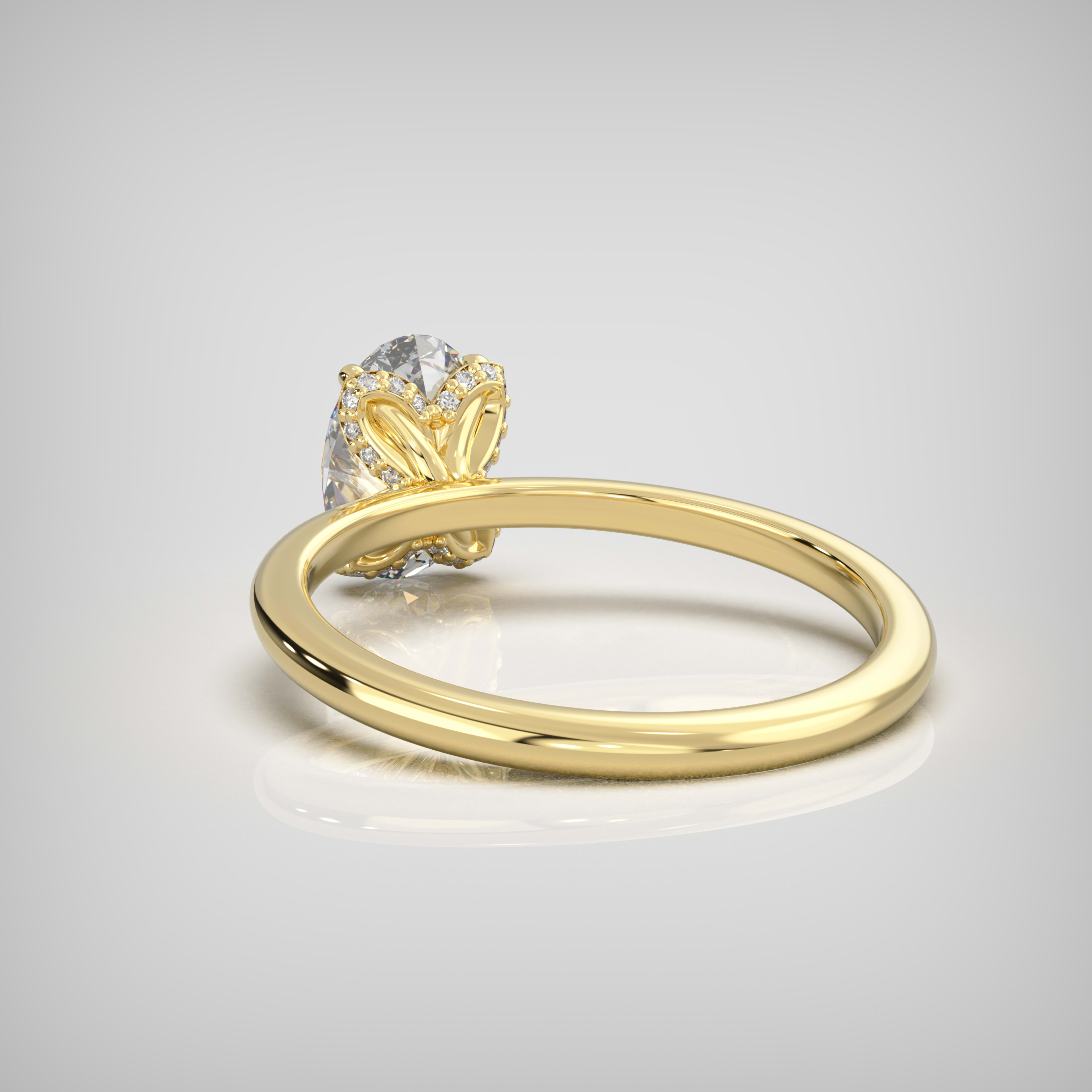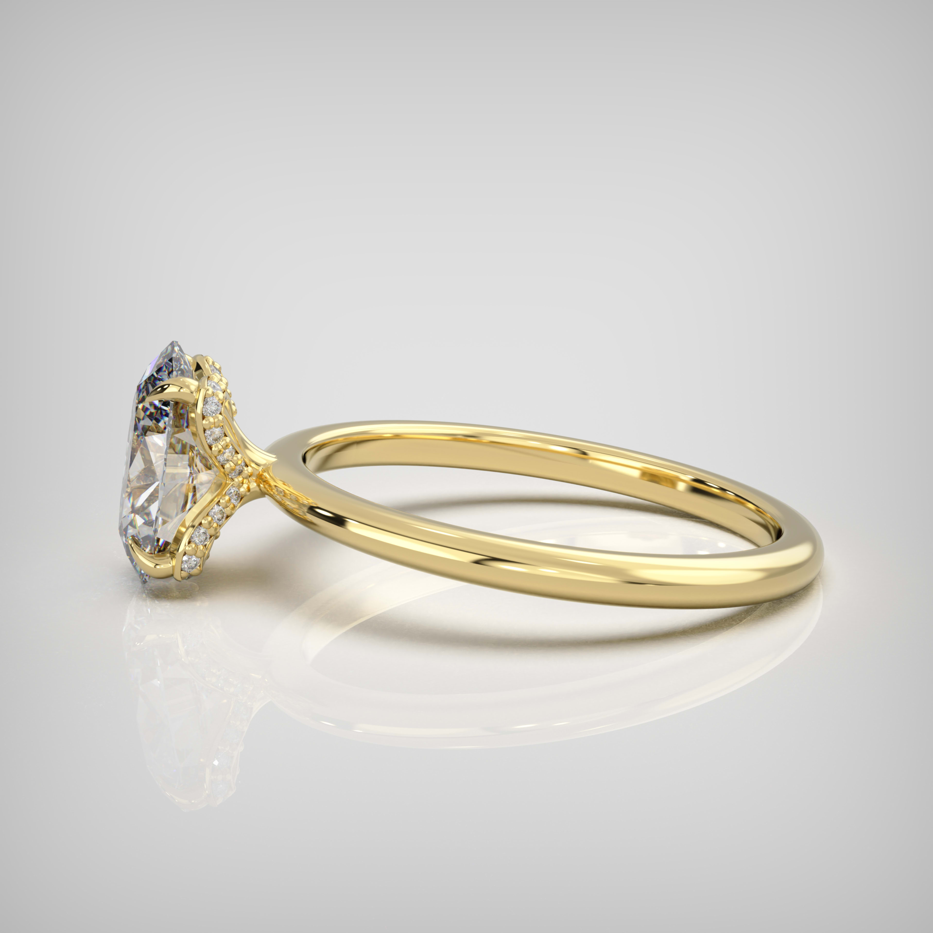 This elegant ring features a central 1.5 carat oval cut lab grown diamond, that has been talon set with a secret floral inspired hidden diamond halo underneath!