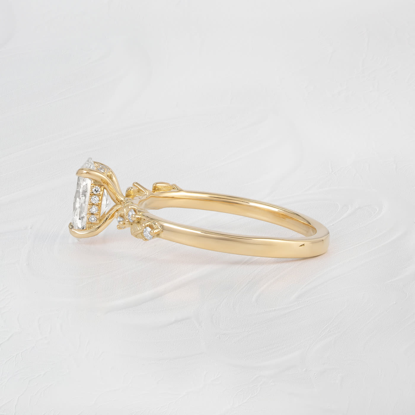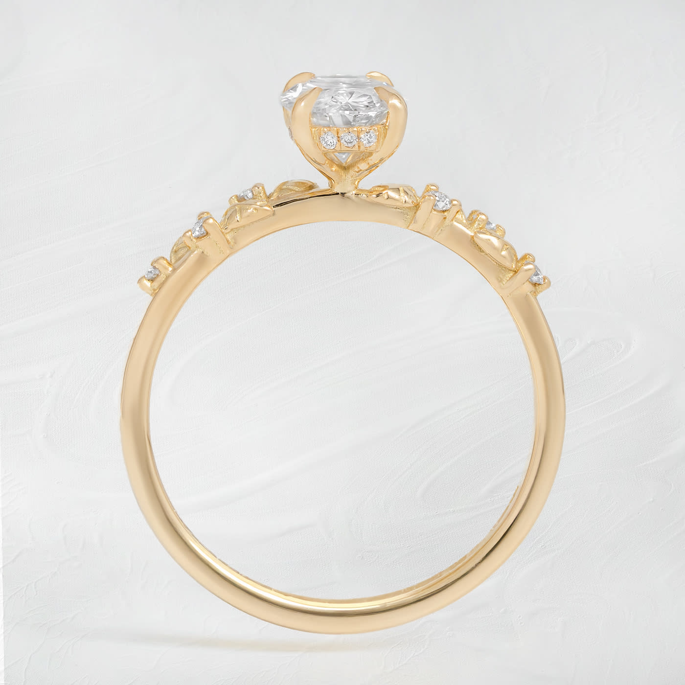 The shoulders are studded with miniature leaves and diamonds.