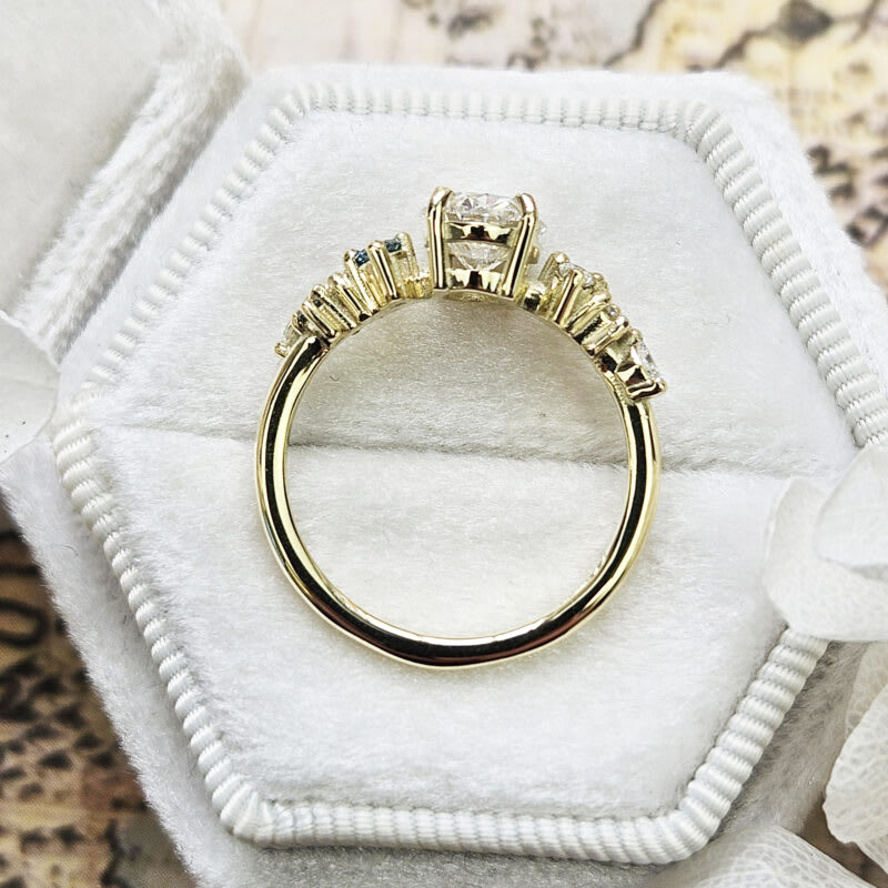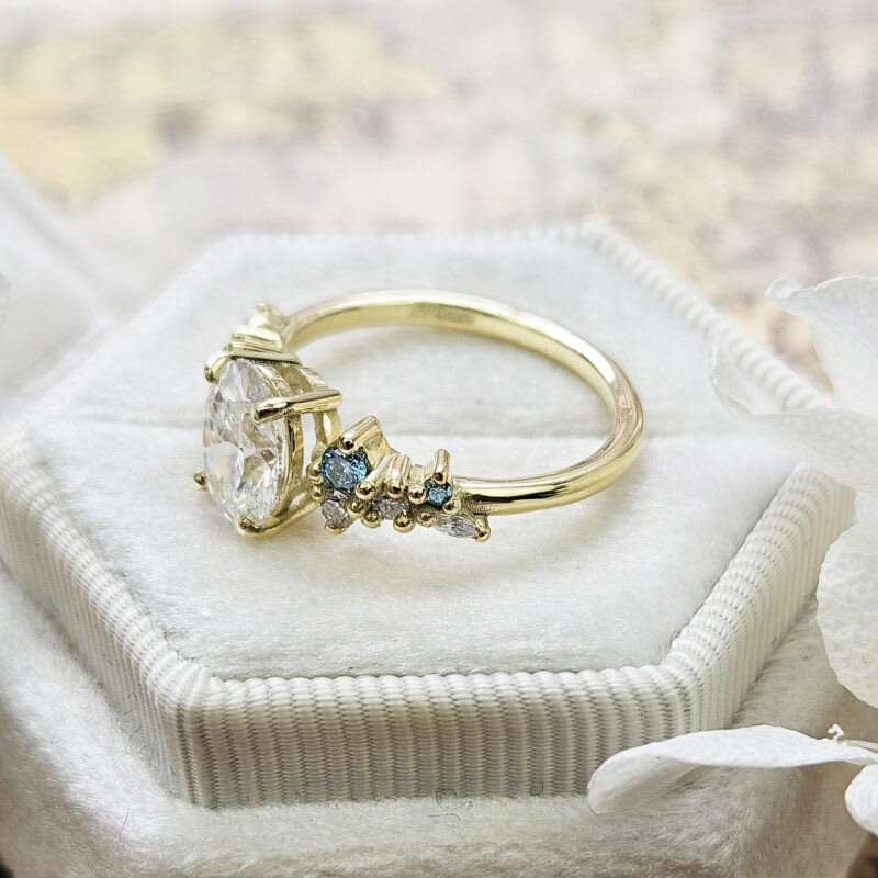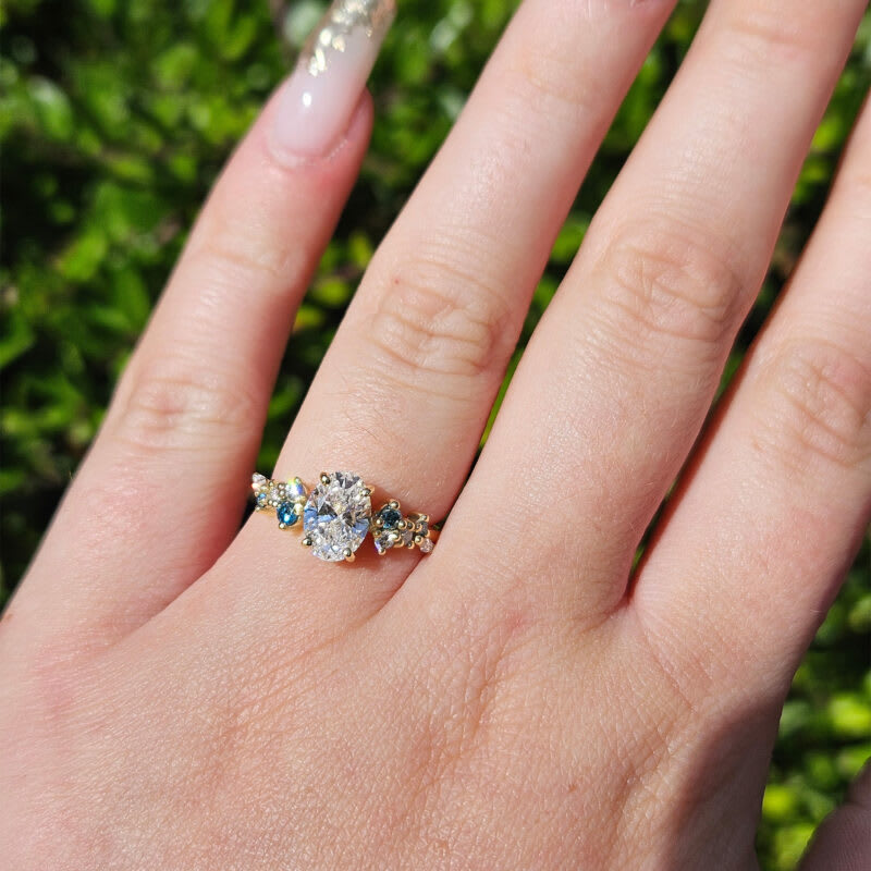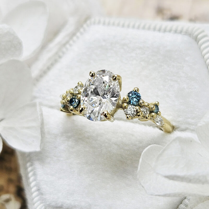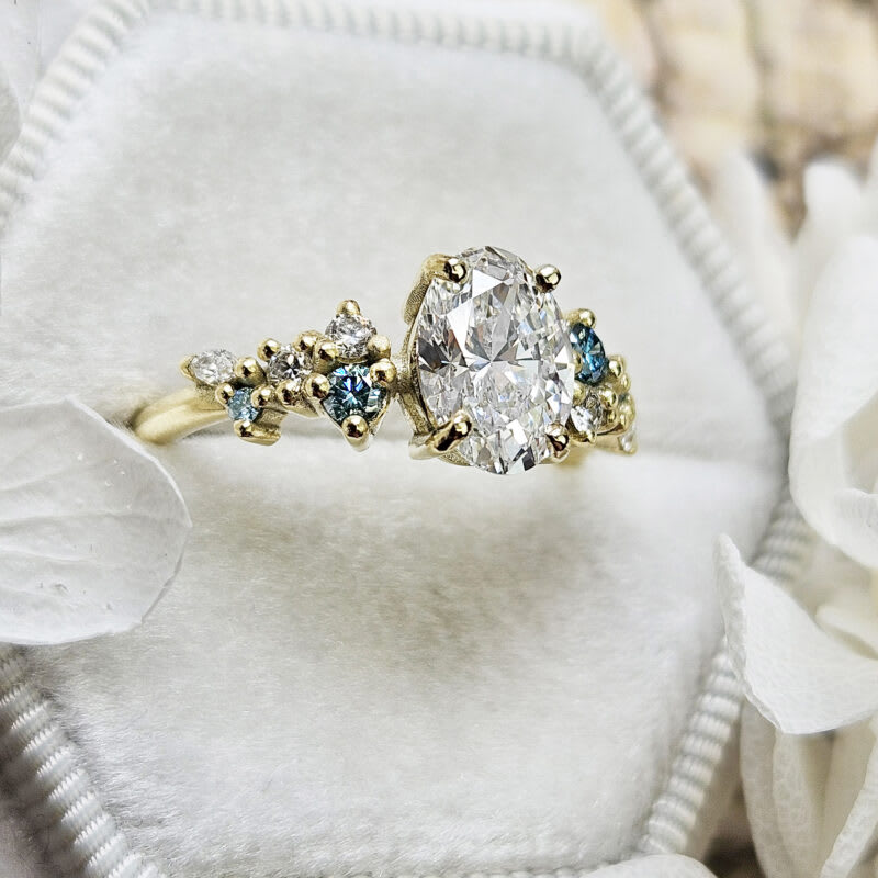This brand new ring features a central oval cut grown diamond. It is set with a mixture of round and marquise cut white and aqua blue accent diamonds in a unique, low profile, floral inspired 14ct yellow gold mount!