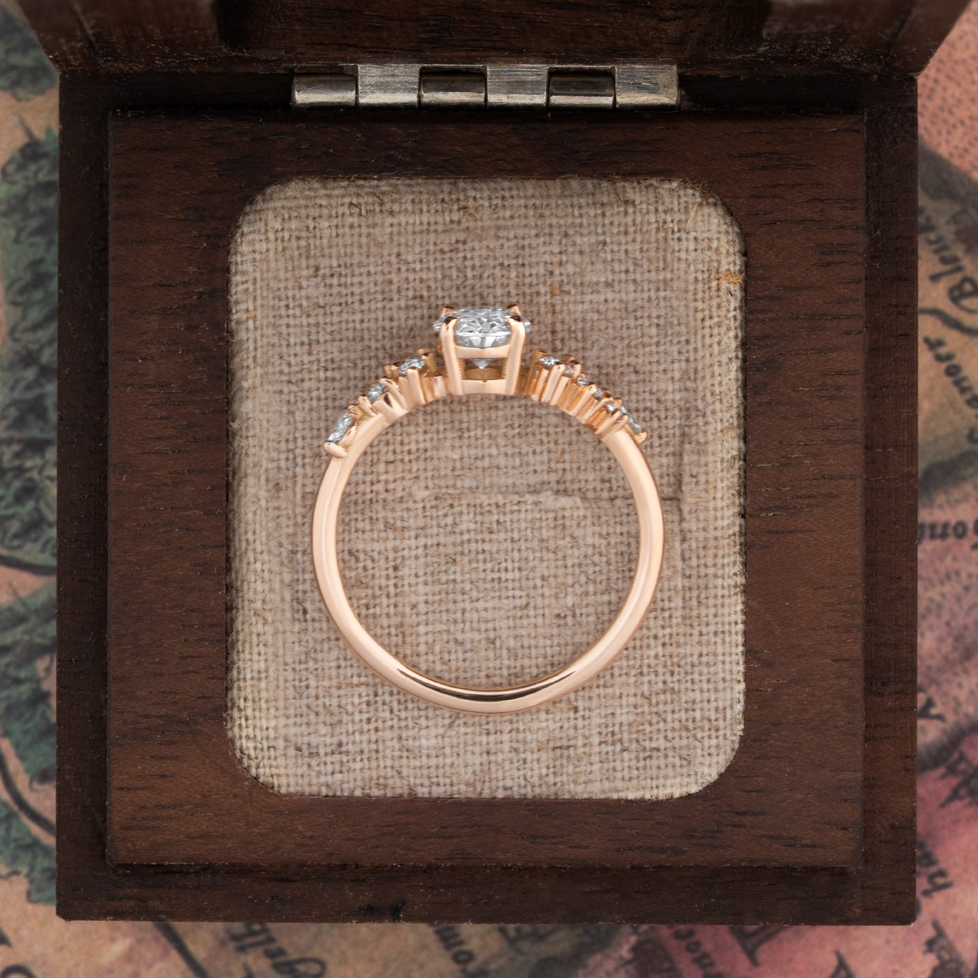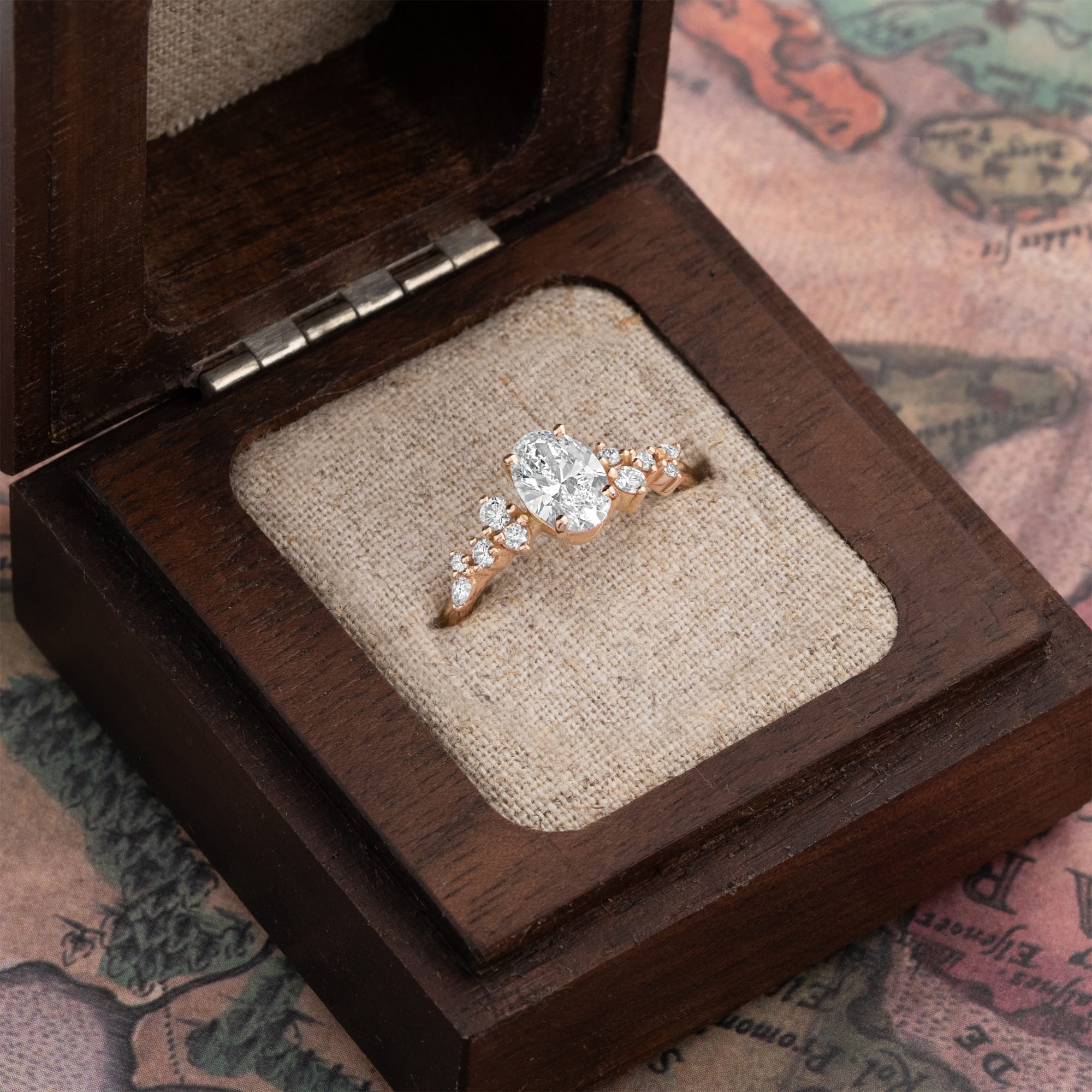 Description: This engagement ring features a central 1.20ct oval cut lab-grown diamond set in an 18ct rose gold mount. The low-profile design incorporates a floral-inspired cluster of marquise and round lab-grown accent diamonds totaling 0.23ct. This fine jewellery piece is classified as a cluster/asymmetric ring.