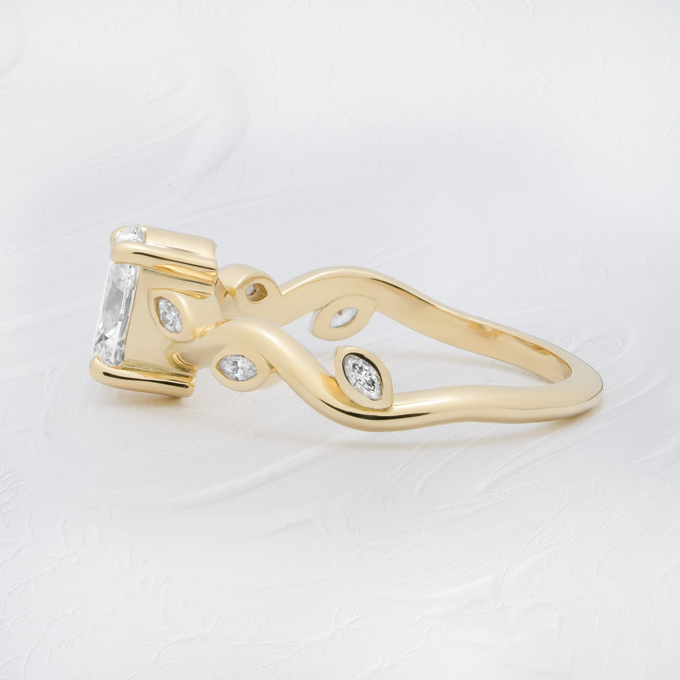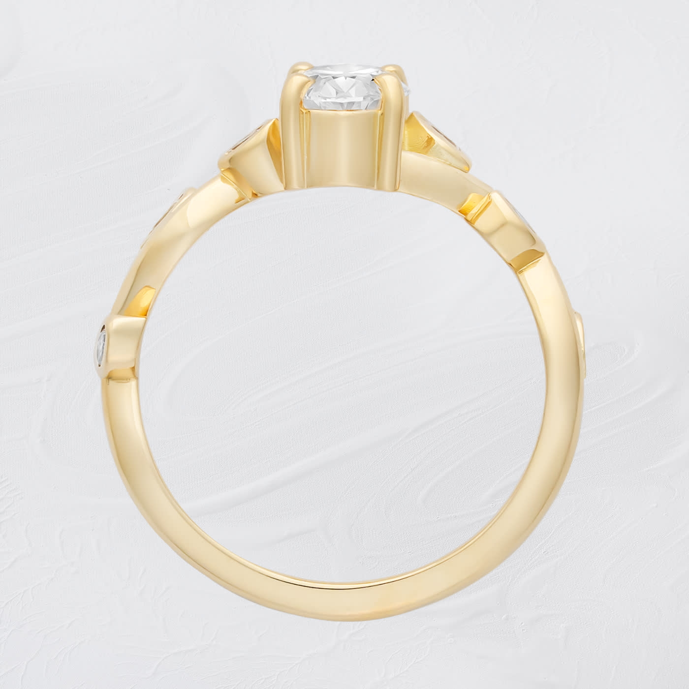 This elegant ring features a central 1ct oval cut lab grown diamond, that has been 4 prong set in a classic basket setting. The weaving band of the ring has been adorned with rubover-set marquise cut diamonds to resemble leaves on a vine!