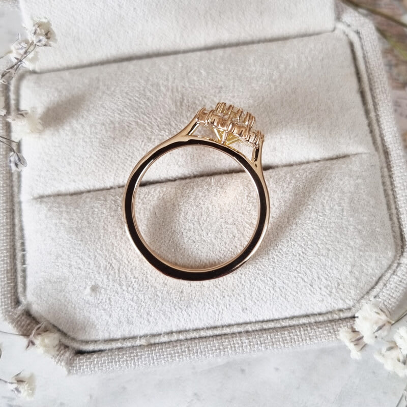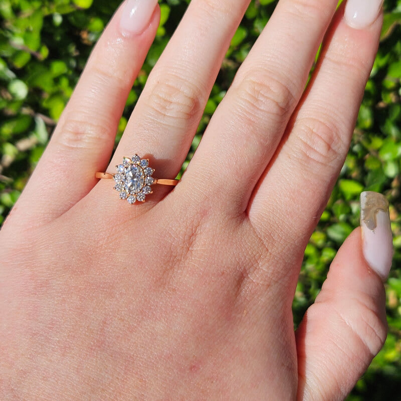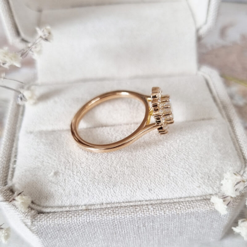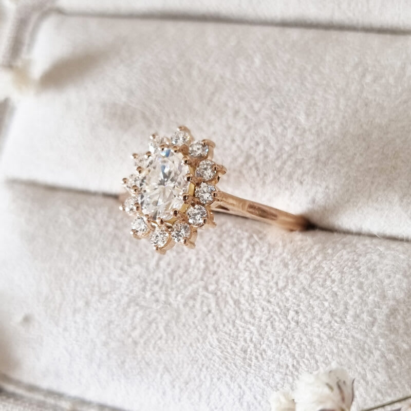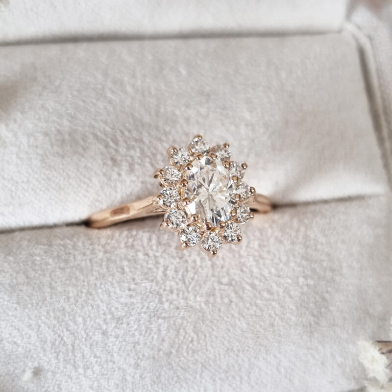 This brand new stunning ring features a central oval cut moissanite, that has been surrounded with a halo of round brilliant cut lab grown diamonds, in a low profile 18ct rose gold mount!