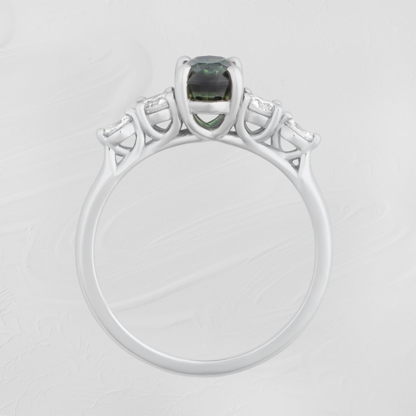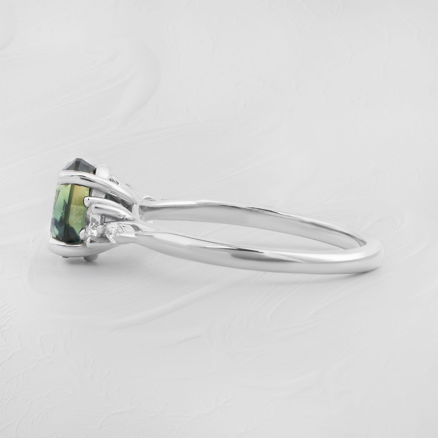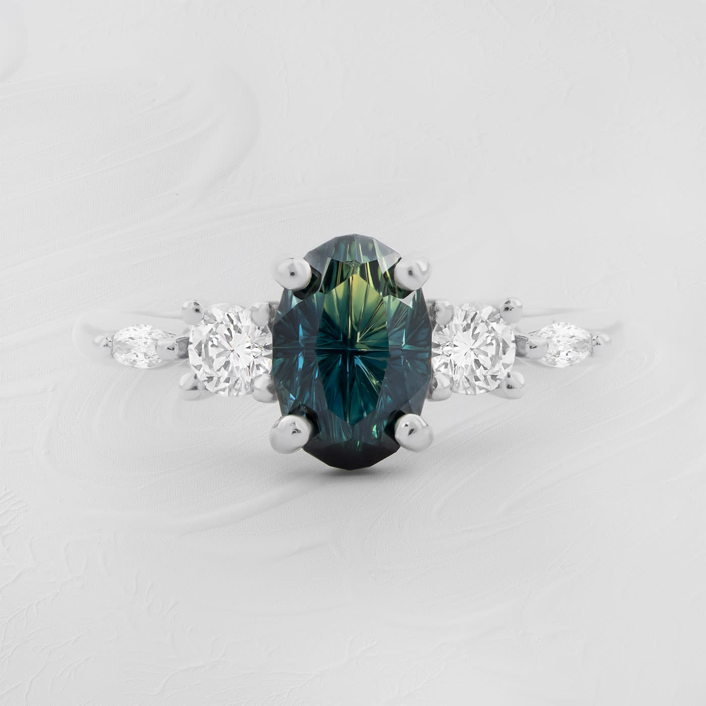 This five-stone engagement ring features a central 1.62ct oval starbrite parti sapphire, cut by John Dyer, secured in a trellis setting. The center stone is flanked by two round and two marquise lab-grown accent diamonds, totalling 0.26ct. The fine jewellery piece is constructed in platinum.