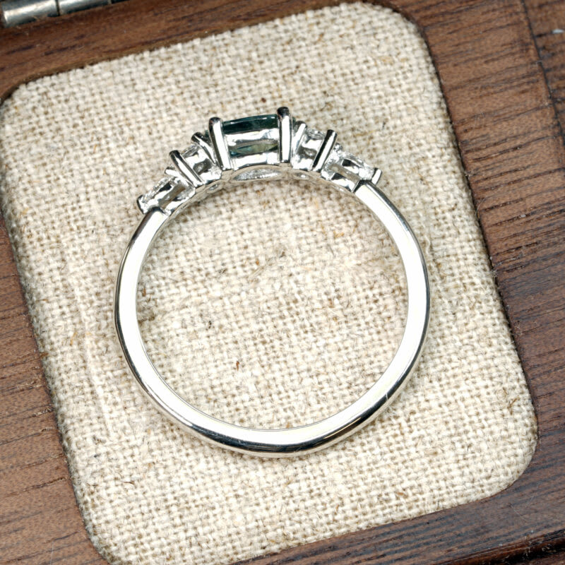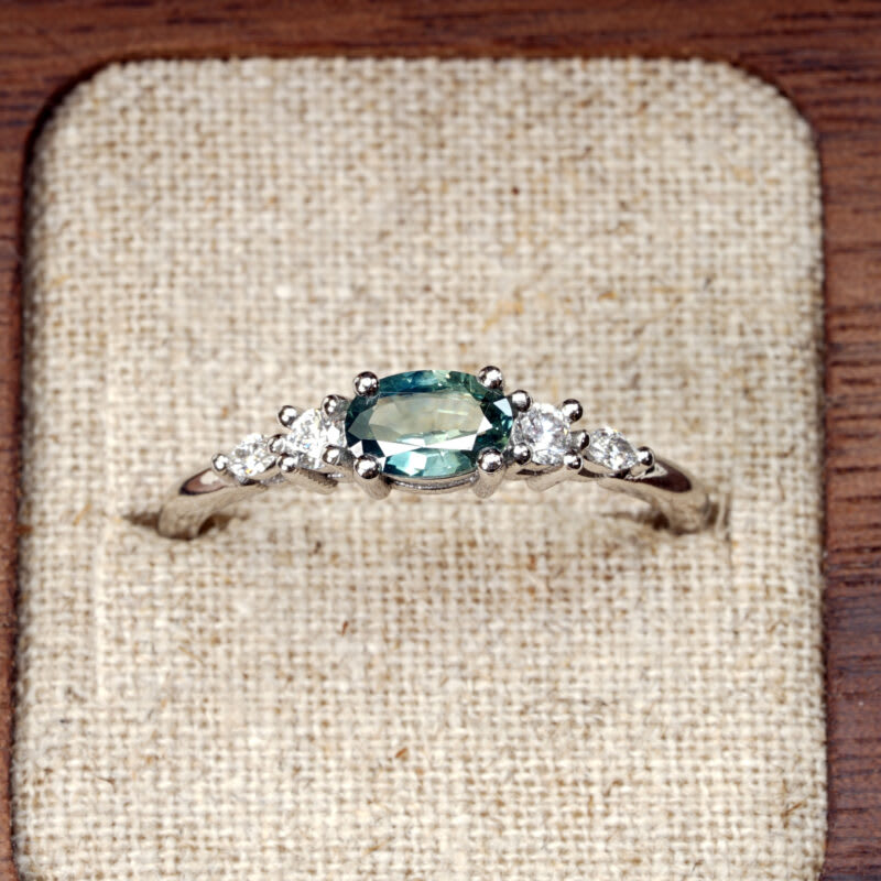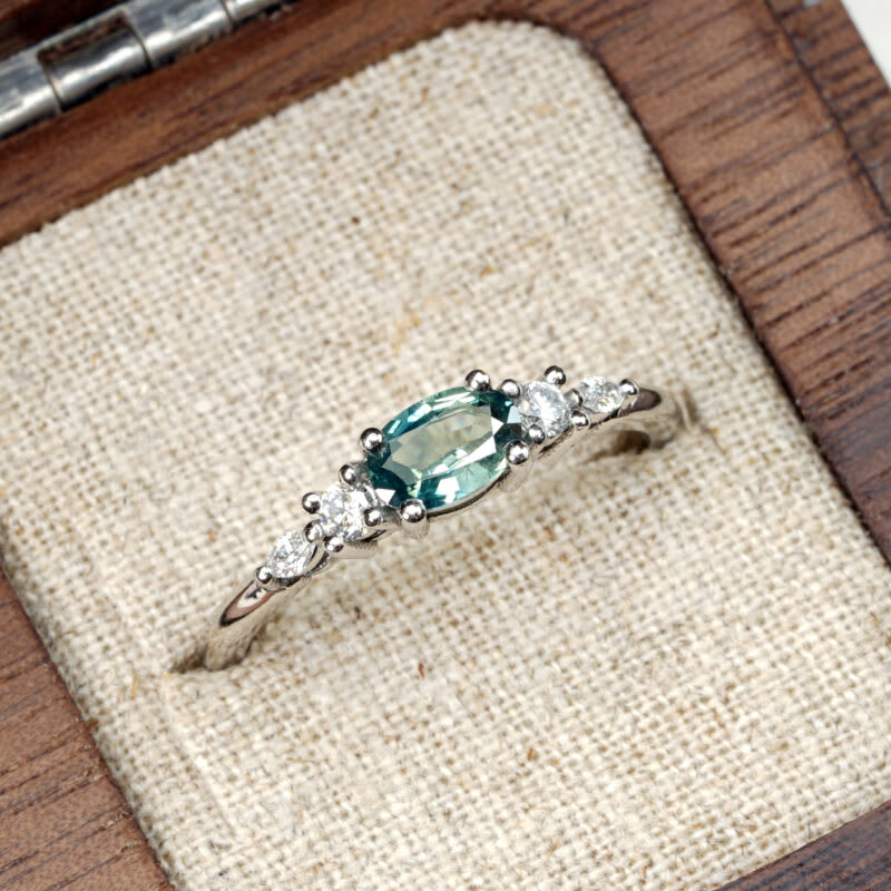 This brand new stunning ring features a central oval cut teal sapphire, that has been horizontally prong set with graduated accent diamonds, in a sleek and elegant low profile mount.
