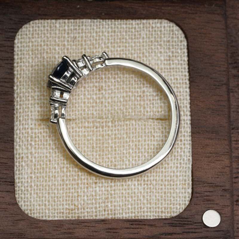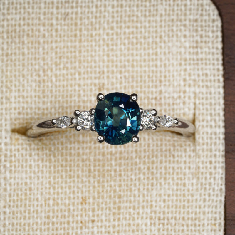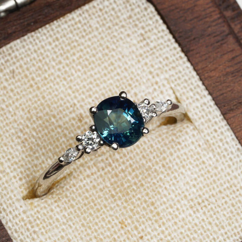 This brand new stunning ring features a central 1.19ct oval teal sapphire, that has been prong set with graduated accent diamonds, in a sleek and elegant low profile mount.