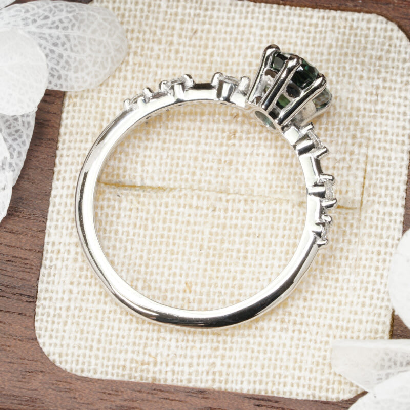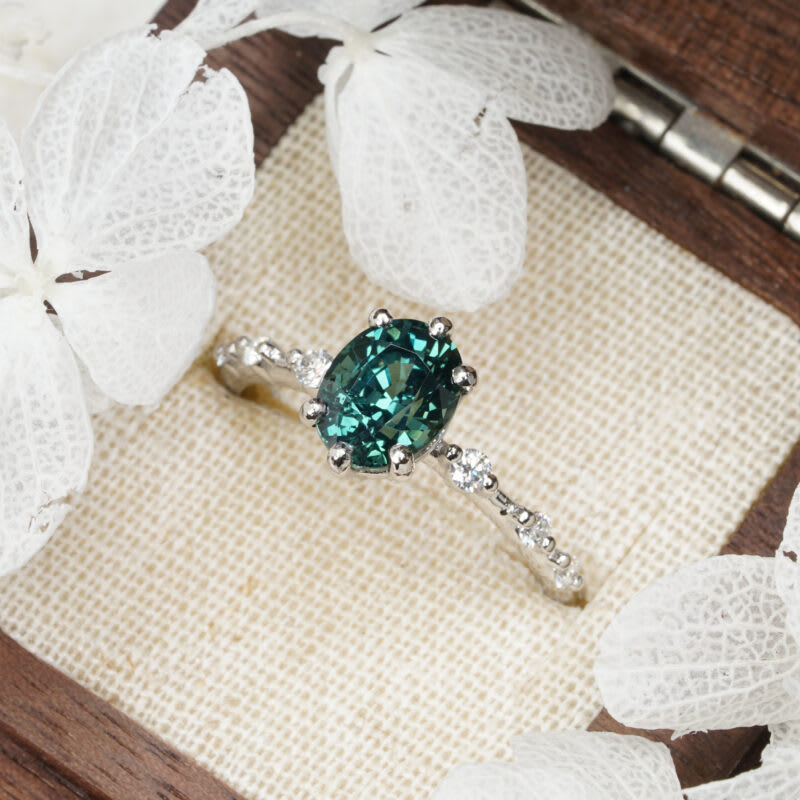 This brand new stunning ring features a central natural 2.03ct oval teal sapphire. The sapphire sits in a 6 prong solitaire basket setting. On either side sit graduating accent round diamonds, adding a beautiful, understated sparkle to the platinum band!