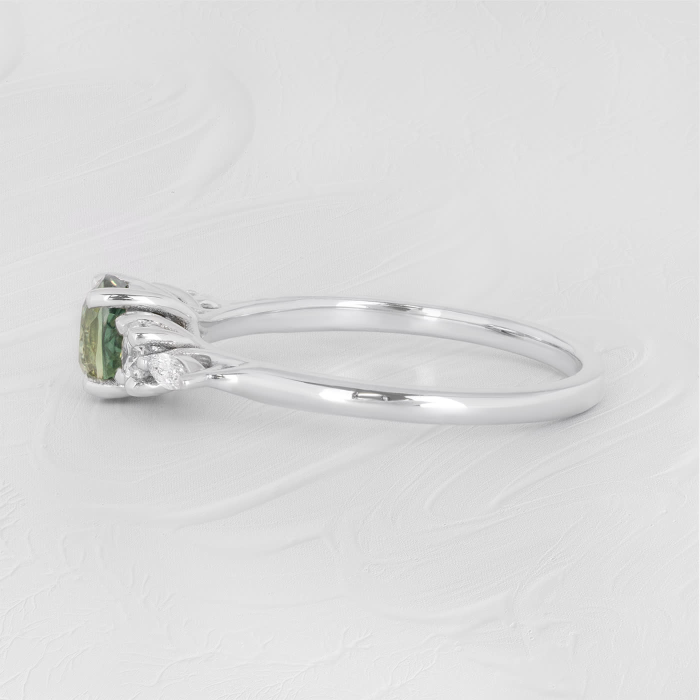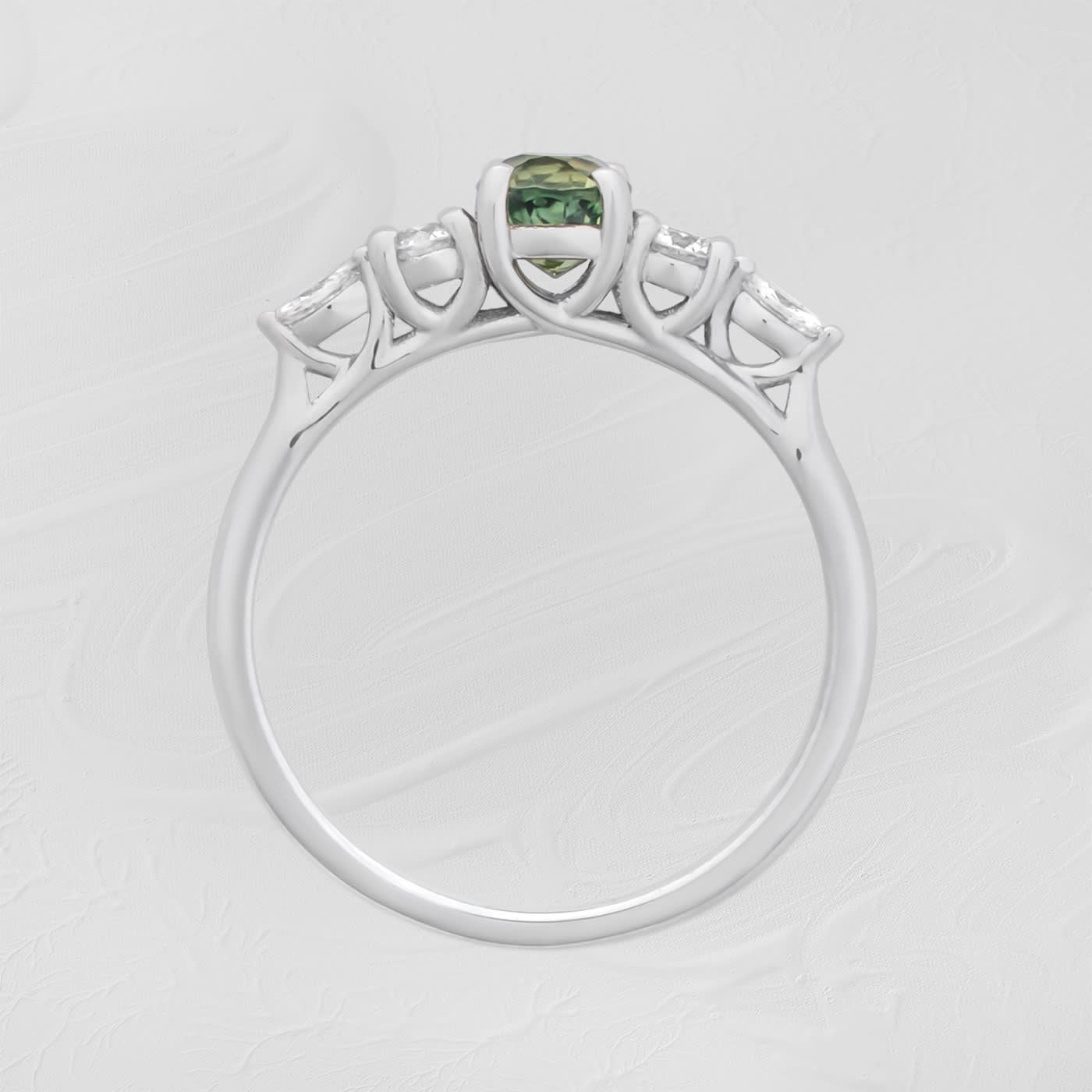 A gorgeous new teal sapphire and diamond ring in our stunning trellis detail setting, featuring a central 0.81ct oval teal sapphire, flanked with round and marquise diamonds all in white gold.