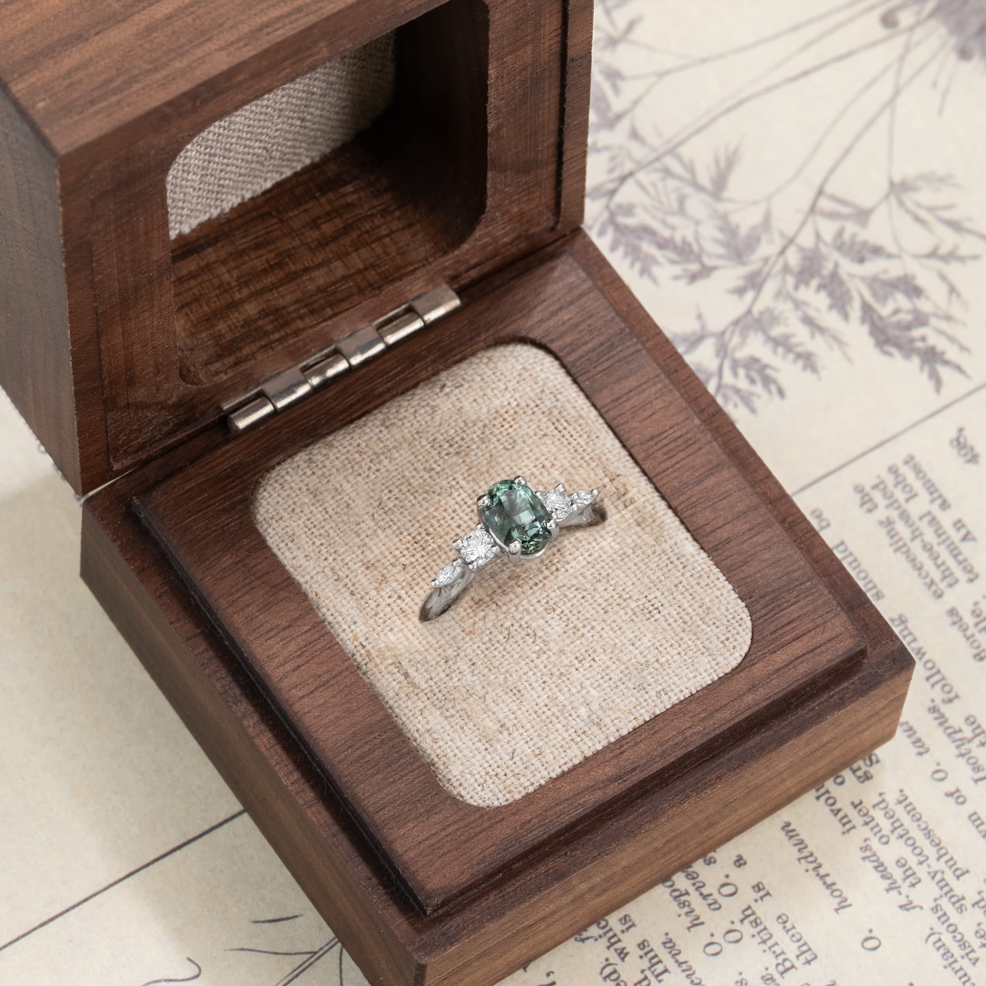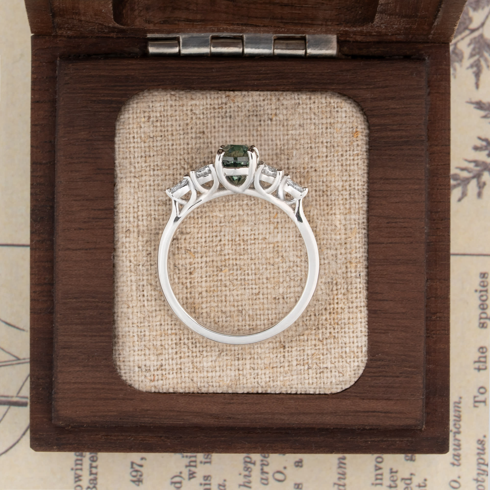 Description: This five-stone engagement ring features a central 1.51ct, unheated, oval teal sapphire secured in a trellis setting. The center stone is flanked by two round and two marquise lab-grown accent diamonds, totalling 0.26ct. The fine jewellery piece is constructed in platinum.