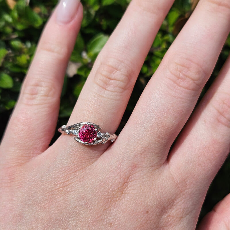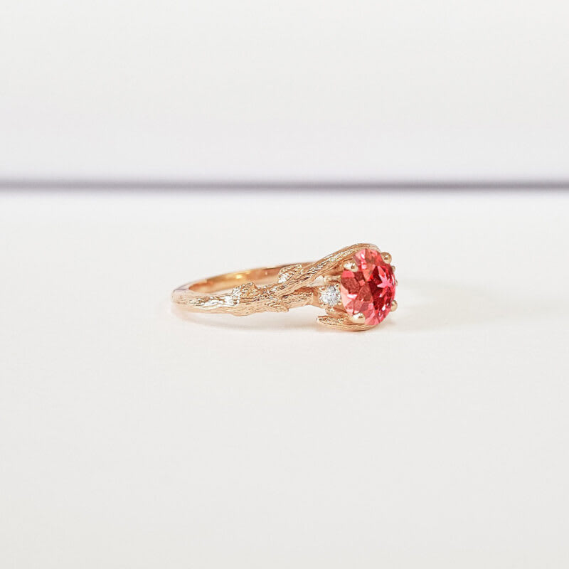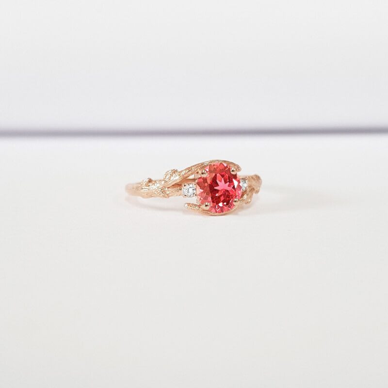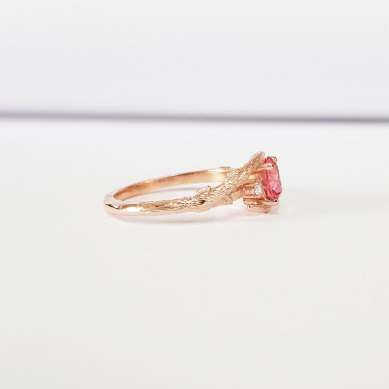 This brand new stunning ring features a central brilliant cut lab grown padparadscha sapphire, flanked by two diamonds and set in a custom tree mount with tiny golden leaves!