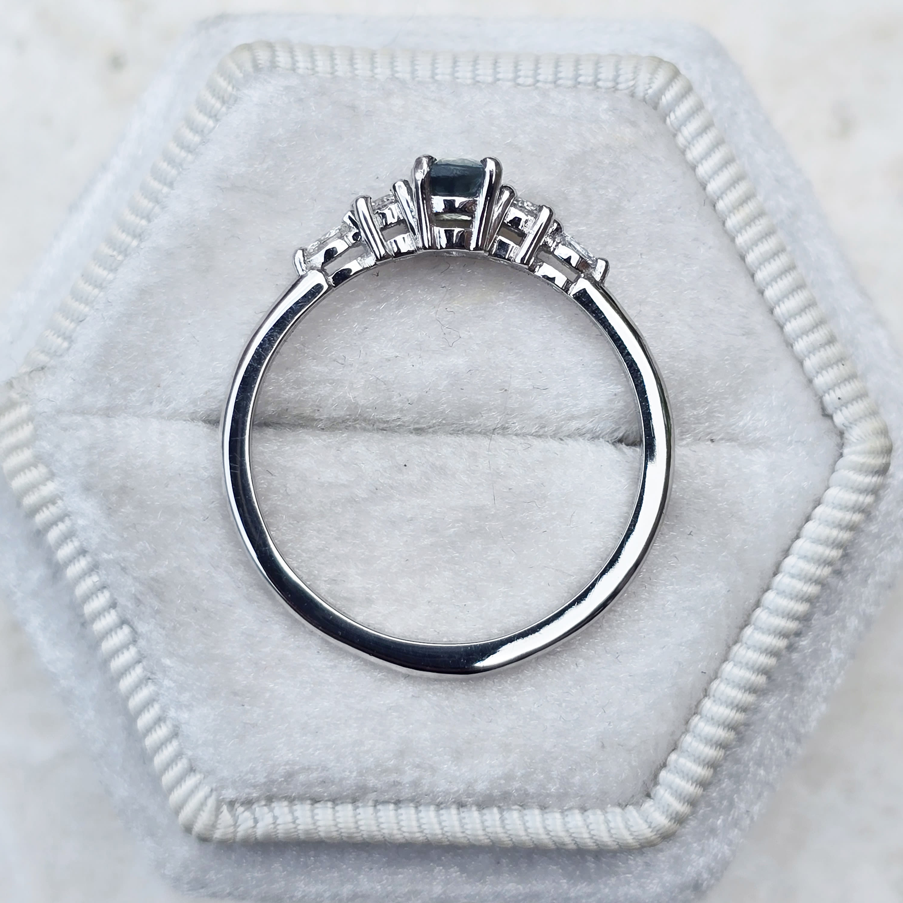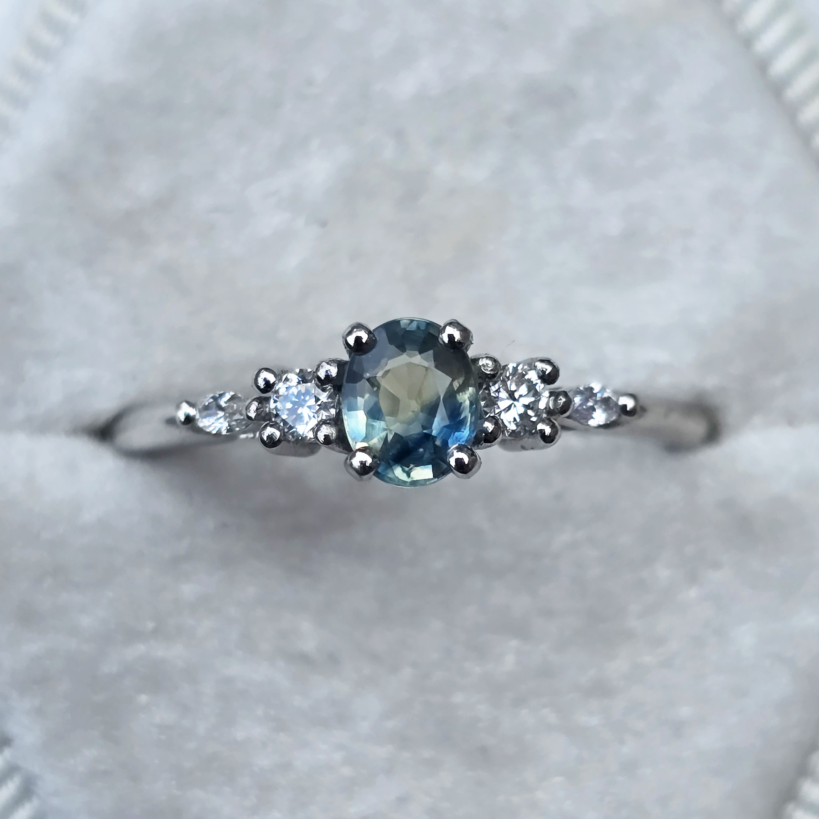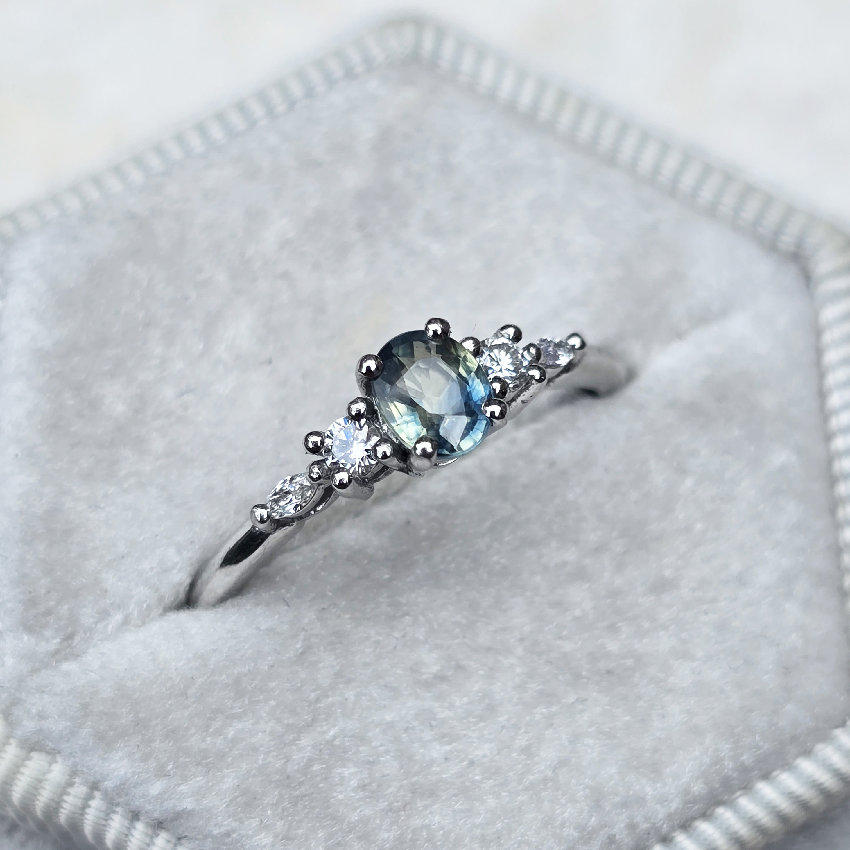 This elegant ring features a central 0.62ct oval parti sapphire. The sapphire has been 4 prong set with two round brilliant and two marquise lab diamonds in a classic 5 stone platinum setting!