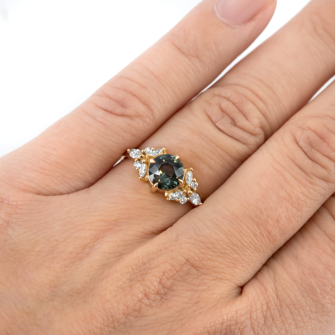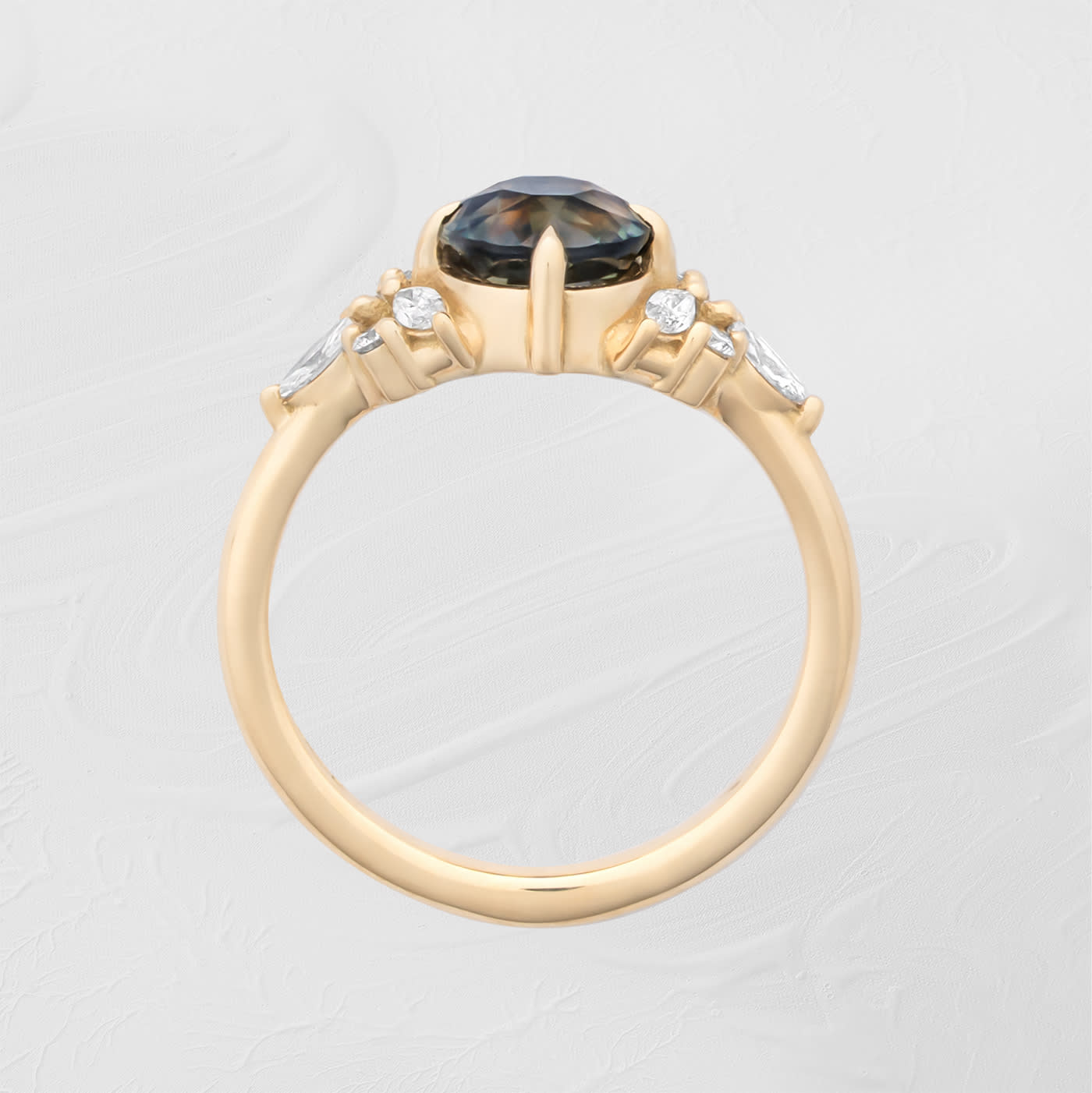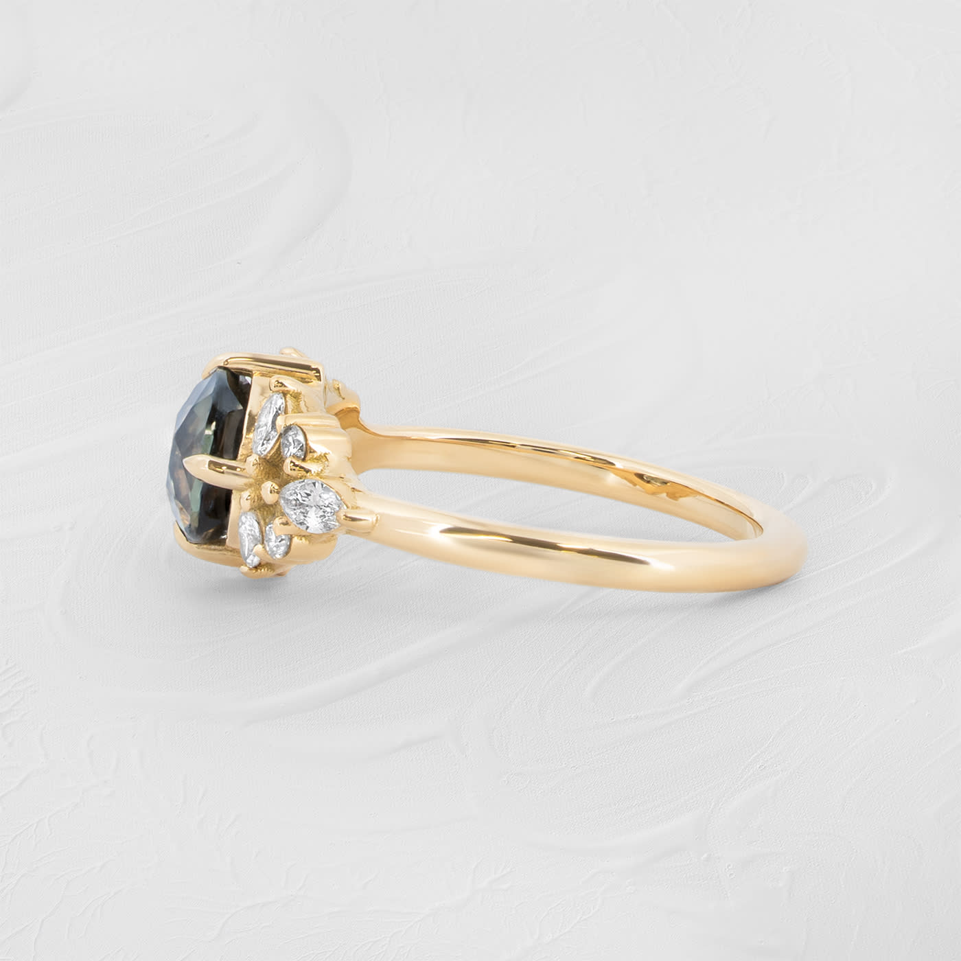 Framing this unique centrepiece, marquise and round brilliant lab grown diamonds are delicately arranged in a floral-inspired design, evoking the timeless beauty of nature. The setting, crafted in warm 18ct yellow gold, enhances the sapphire’s rich tones while adding a touch of vintage elegance.