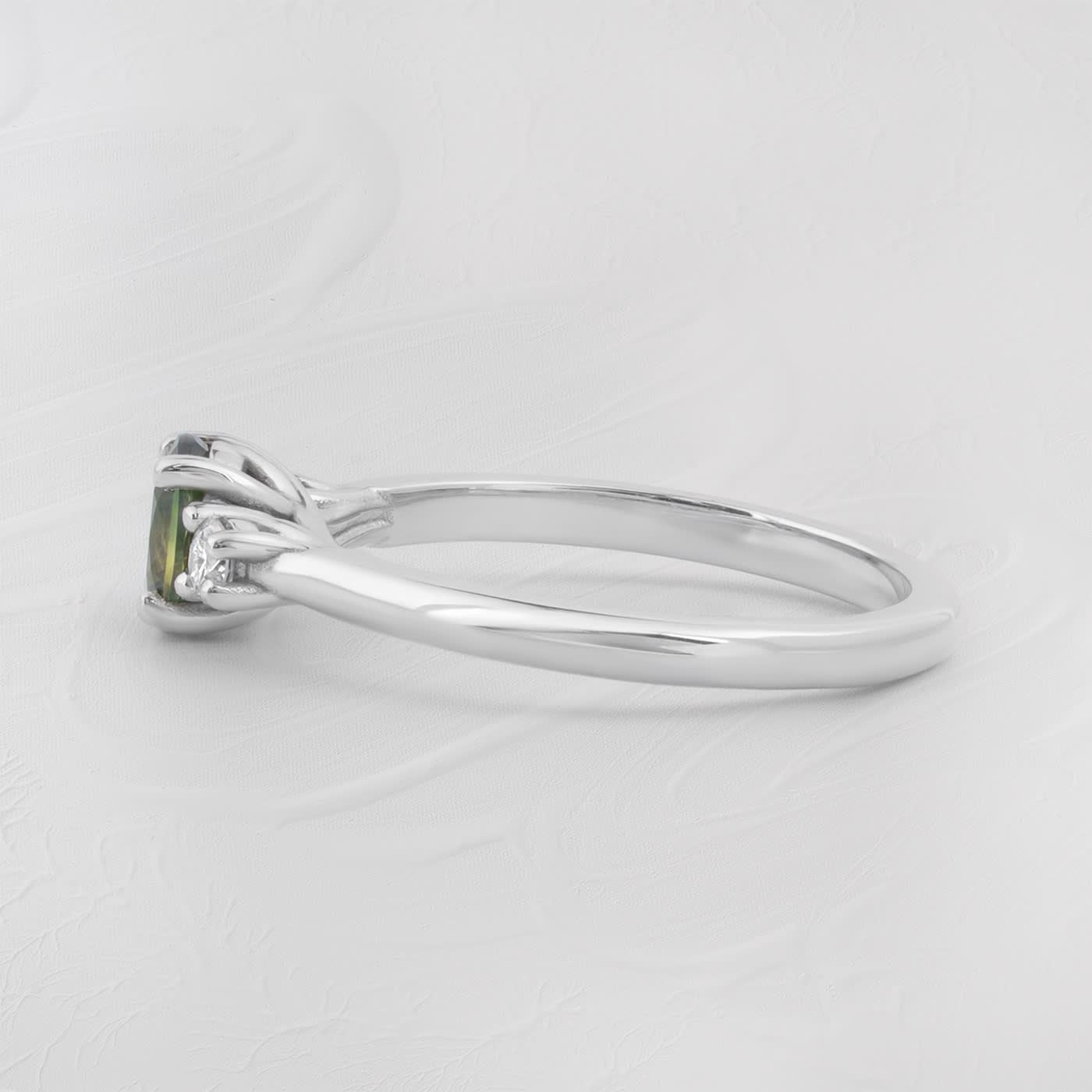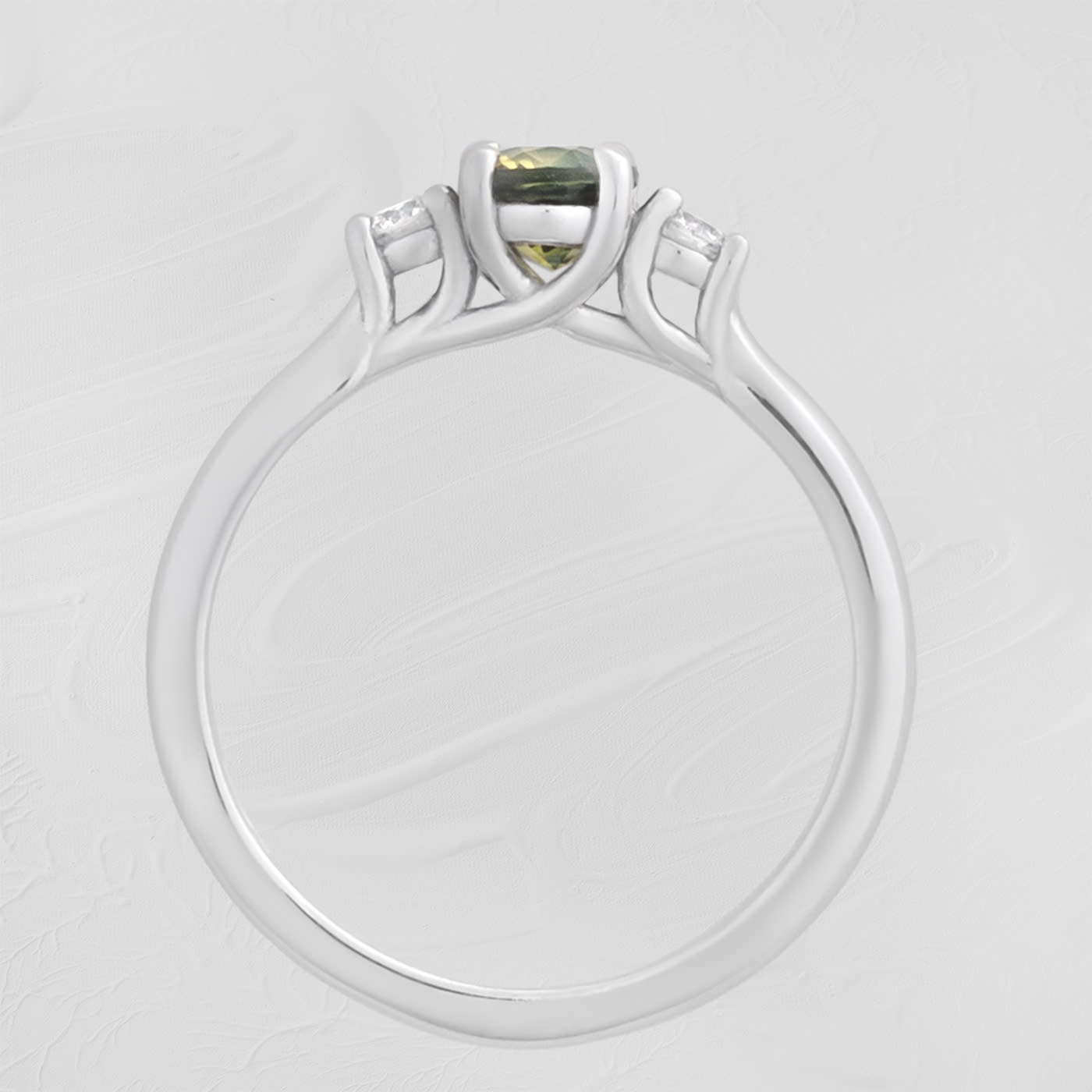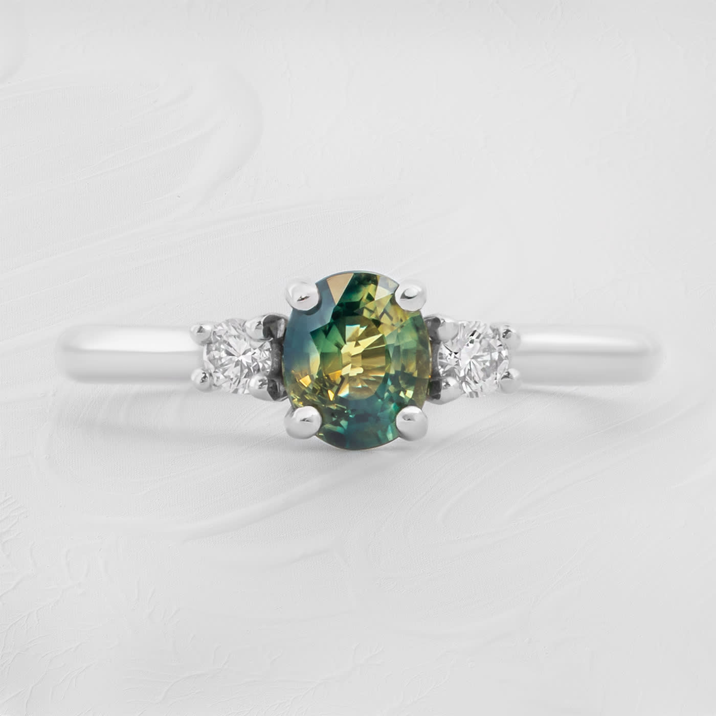 This trilogy engagement ring features a 0.73ct oval cut natural parti sapphire as the centre stone, secured by prongs in a trellis setting. The central sapphire is flanked by two lab-grown round accent diamonds. The design balances secure stone setting with an elegant profile.