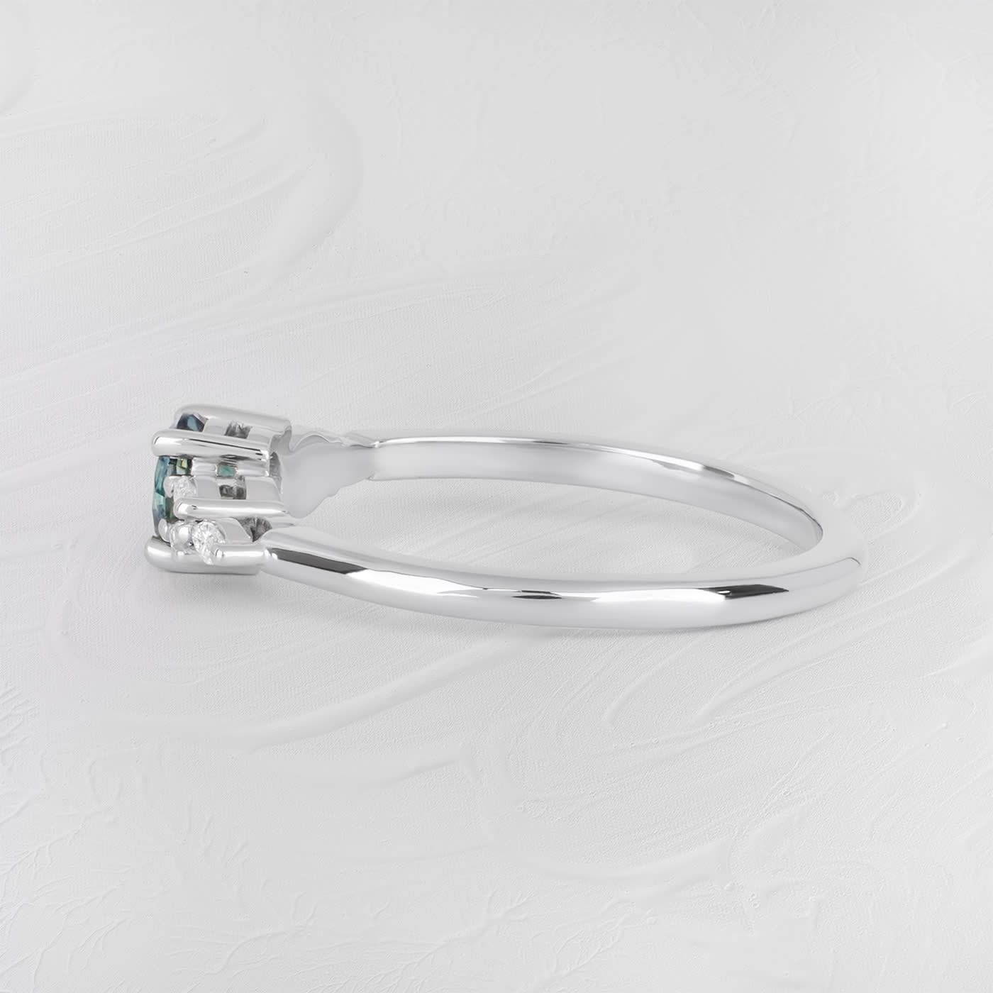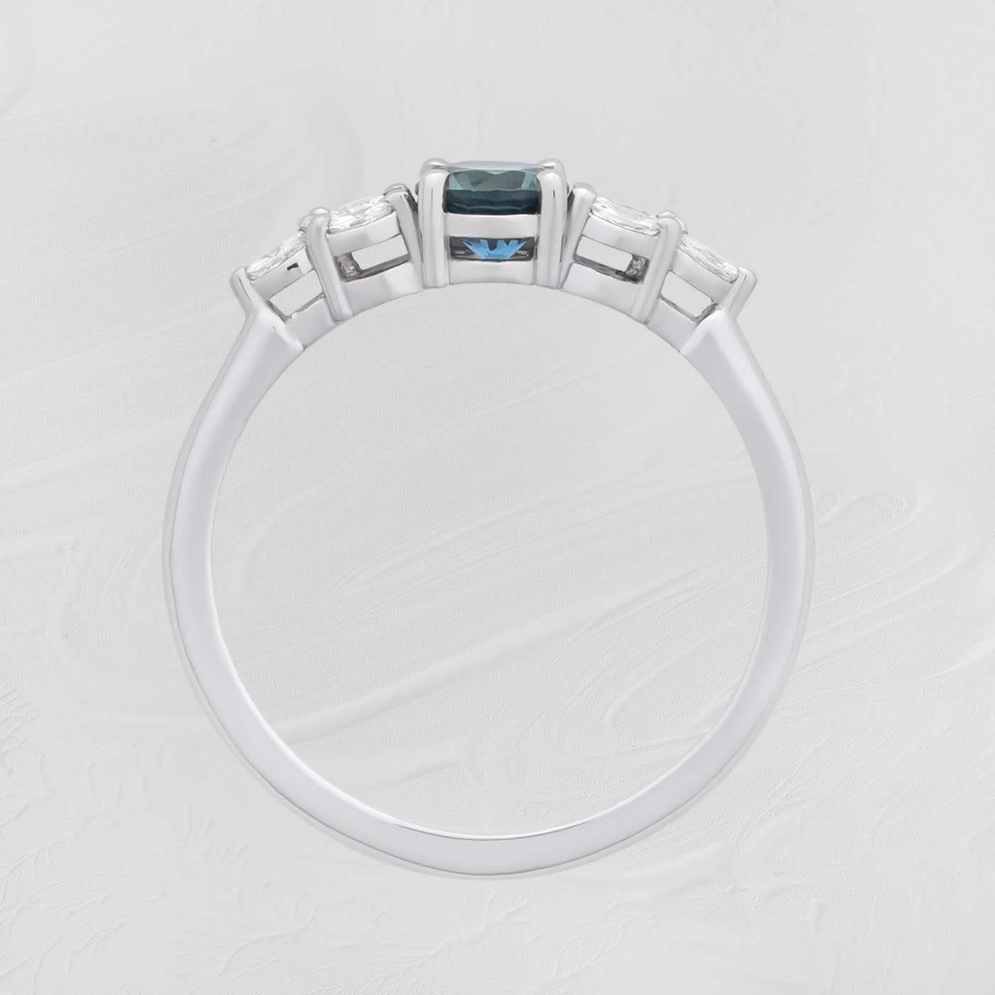 This brand new stunning ring features a central, natural, peacock blue sapphire. It has been set in a stunning 4 prong delicate mount, with 6 accent marquise cut white diamonds in platinum!