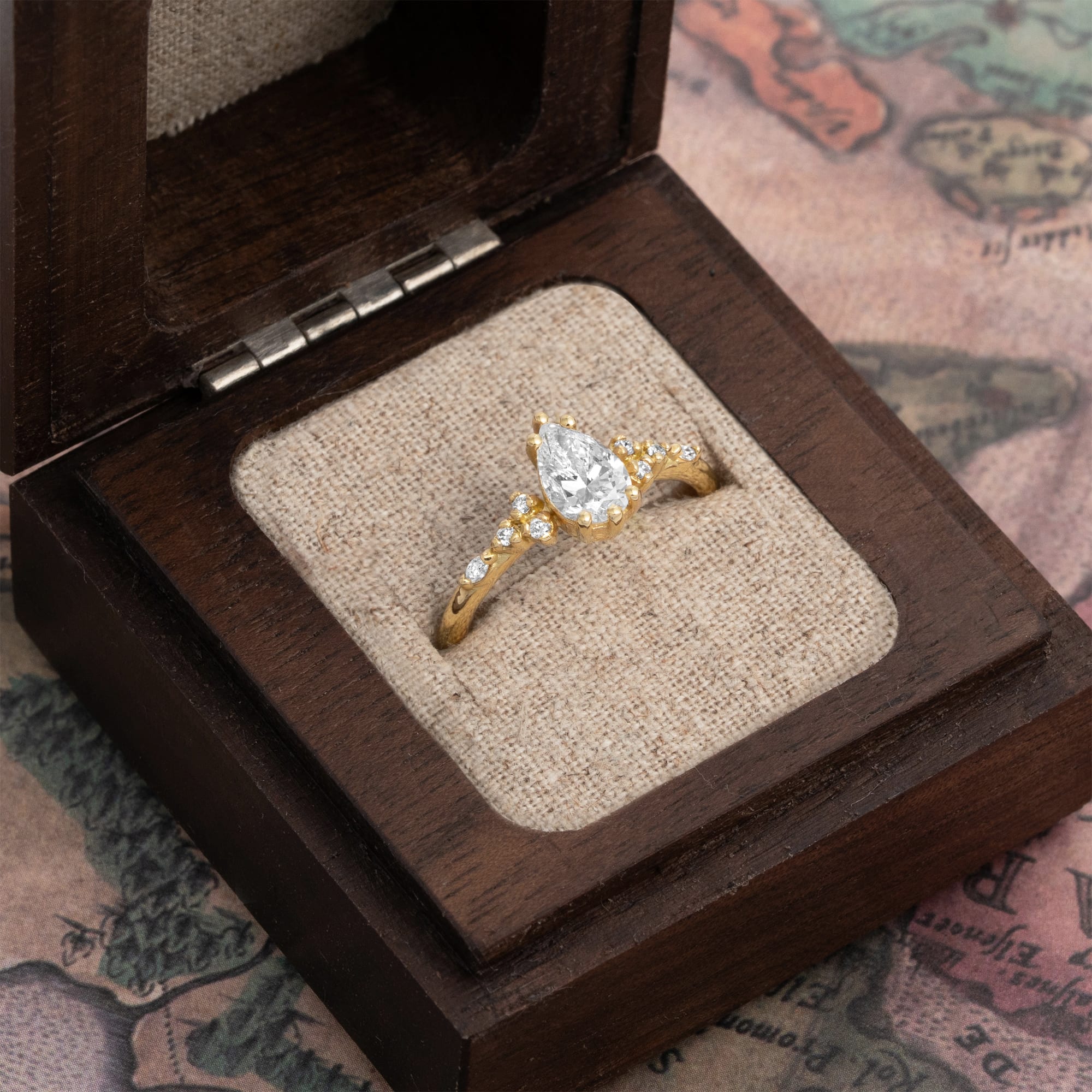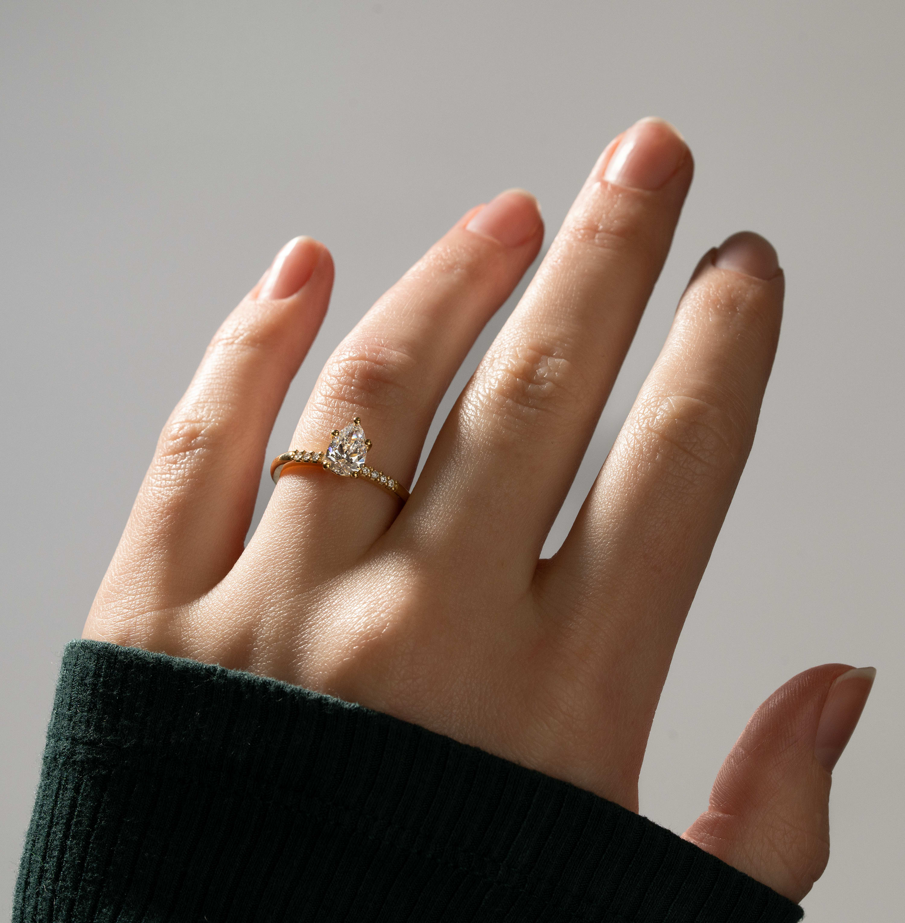 Description: This luxury engagement ring features a central 0.8 carat lab-grown pear cut diamond set in a floral-inspired low profile cluster setting. Accent diamonds include two marquise and six round lab-grown diamonds, totalling 0.1 carats, positioned as shoulder stones. The band has a thickness of 1.7 mm for a refined profile.