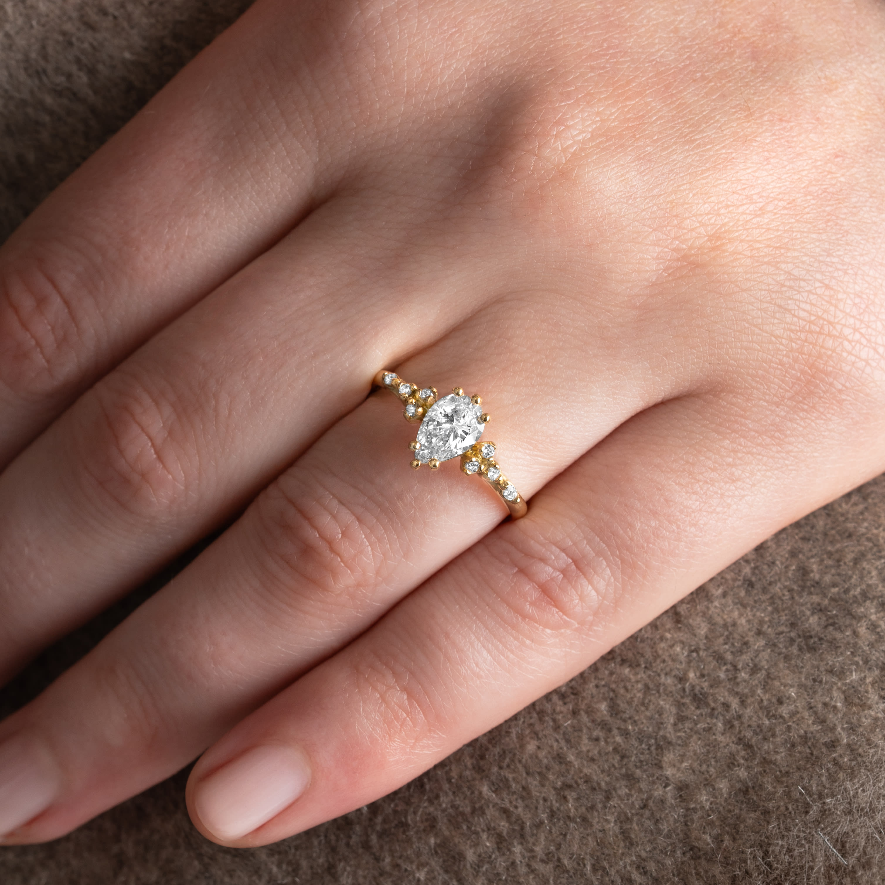 Description: This luxury engagement ring features a central 0.8 carat lab-grown pear cut diamond set in a floral-inspired low profile cluster setting. Accent diamonds include two marquise and six round lab-grown diamonds, totalling 0.1 carats, positioned as shoulder stones. The band has a thickness of 1.7 mm for a refined profile.