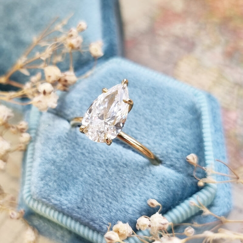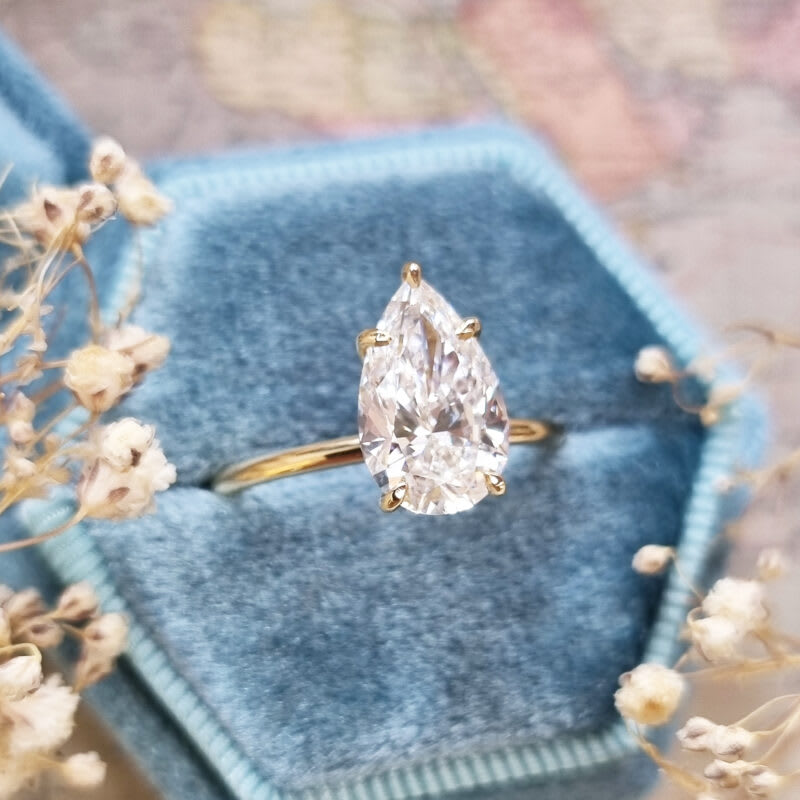 This brand new ring features a central stunning 2.5ct pear cut lab grown diamond. It has been 5 talon set in a sleek slim style 18ct yellow gold band!