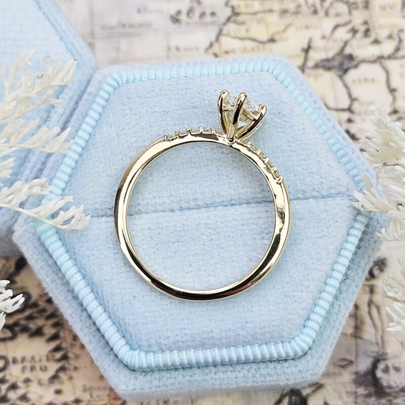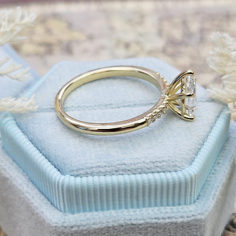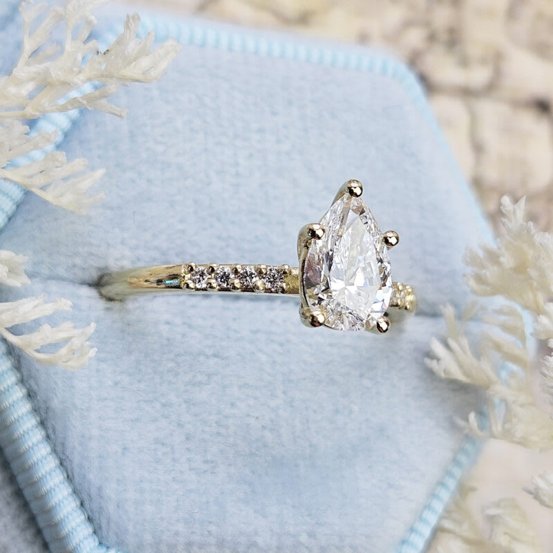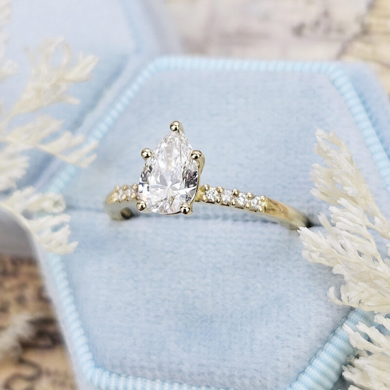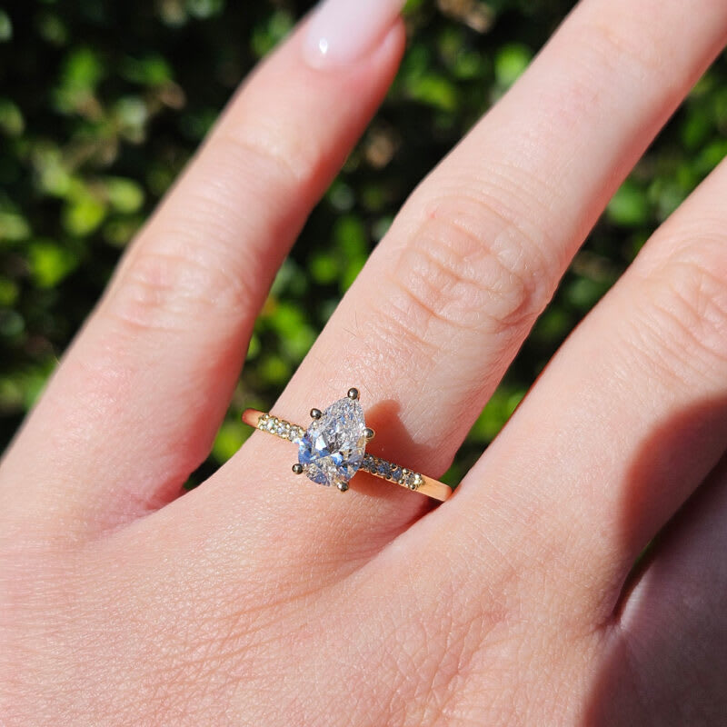 This brand new ring features a central stunning 1ct pear cut lab grown diamond. It has been 5 prong set in a sleek slim style 18ct yellow gold band that has been studded with 8 matching lab diamonds!