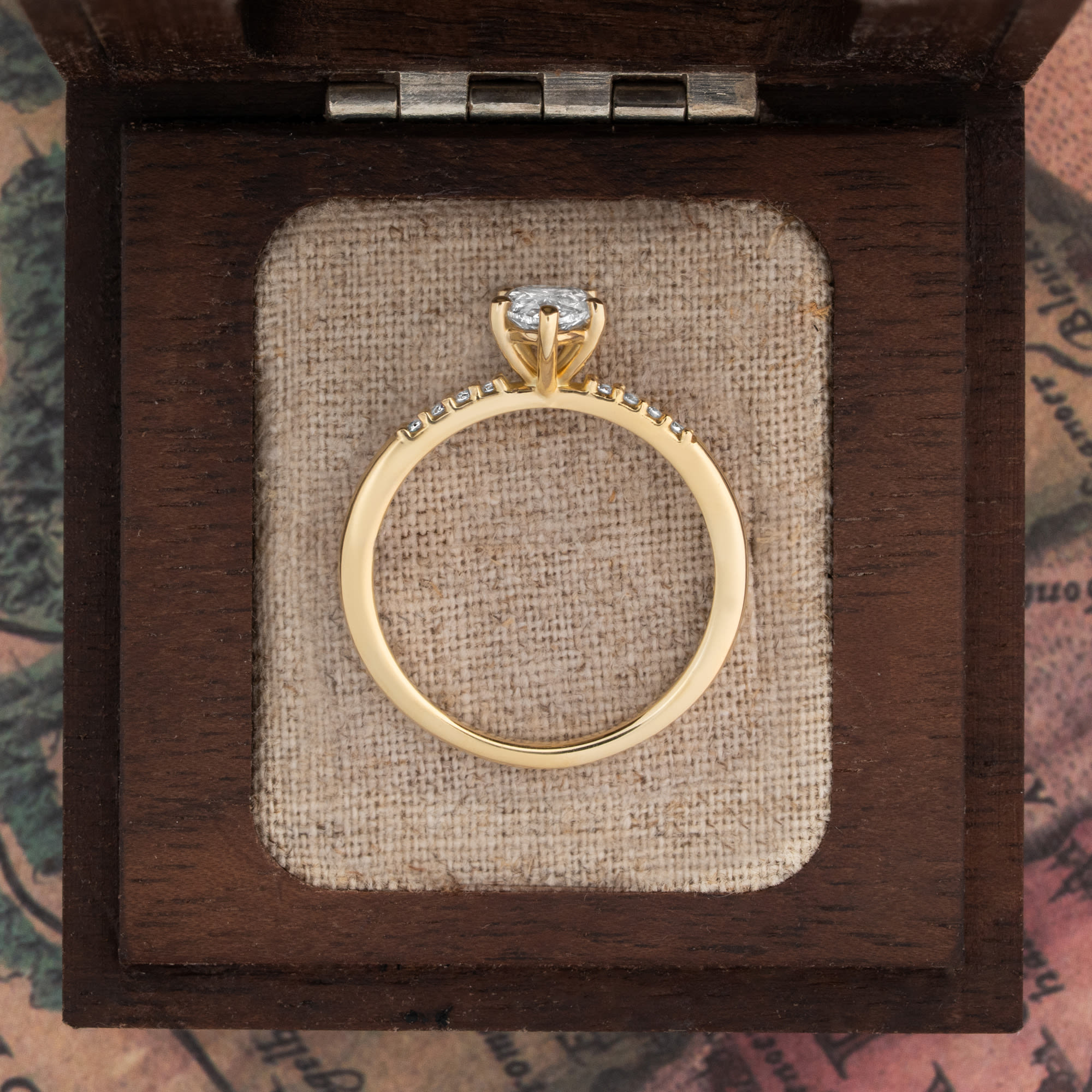 Description: This solitaire engagement ring features a 1.00ct pear cut lab-grown diamond set with five prongs. The slim band is crafted in 18ct yellow gold and is accented with eight matching round lab-grown diamonds set into the shoulders. This design provides a secure setting for the center stone while maintaining a sleek profile.