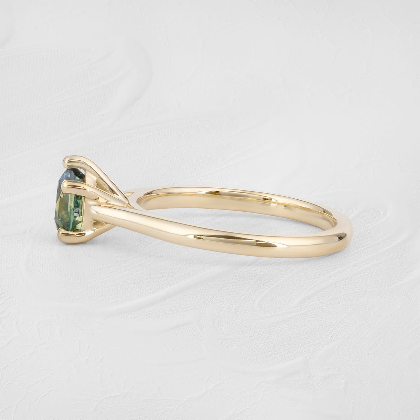 This beautiful new ring features a central 1 carat parti colour sapphire. It has been 5 prong set in a classic 14ct yellow cathedral style setting.