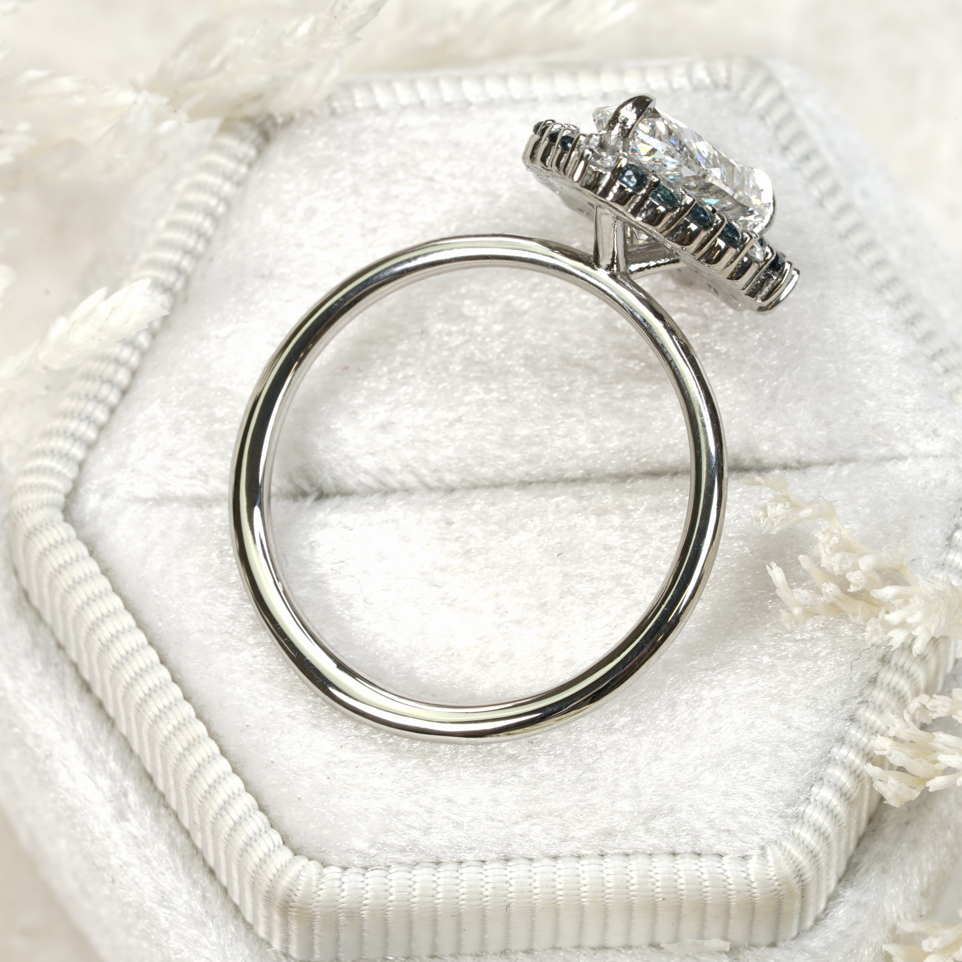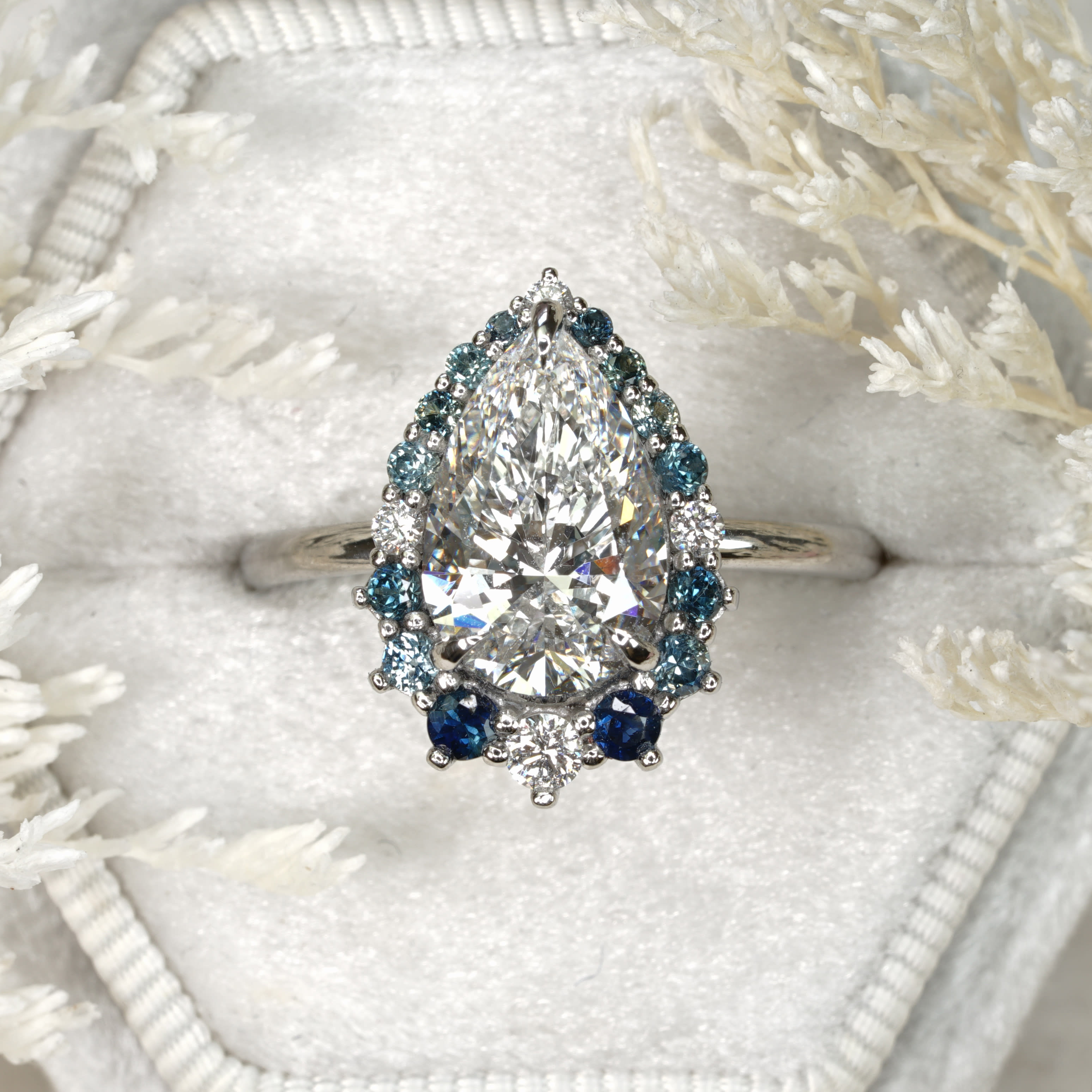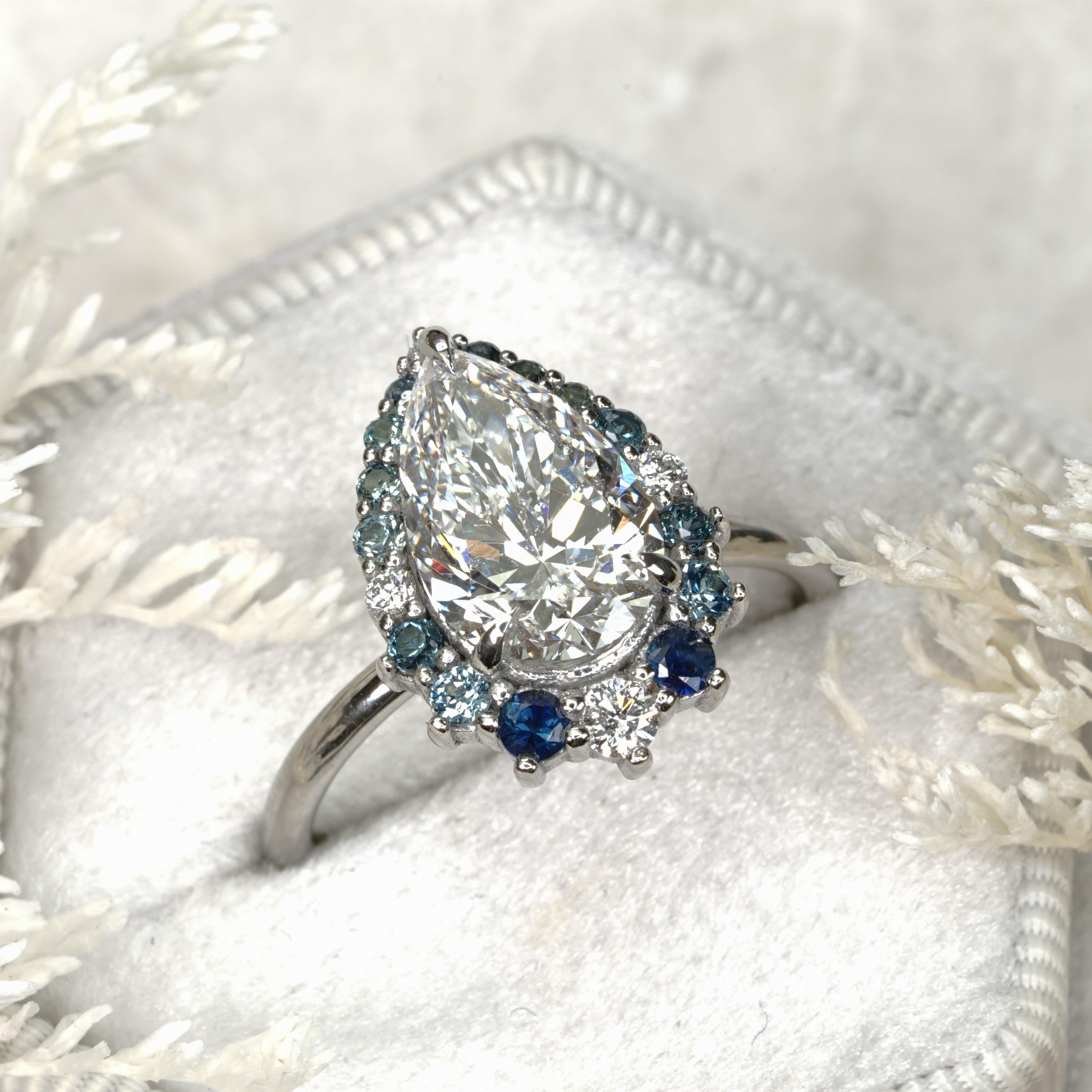 This beautiful new ring features a stunning 2.78ct pear cut lab grown diamond. It is talon set within a halo of gorgeous mixed colour teal/blue sapphires and diamonds, all in platinum!