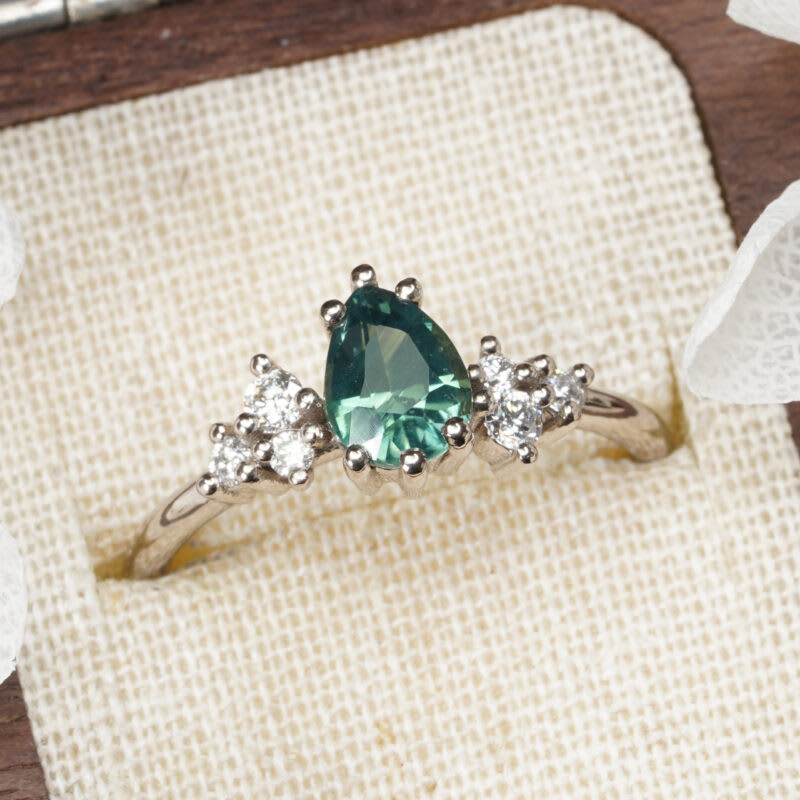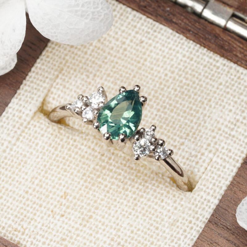 This brand new stunning ring features a central natural pear cut green Sapphire. It has been prong set with 6 brilliant cut diamonds, in a sleek and elegant low floral inspired mount. For this ring we have opted for un-plated 18ct white gold. This gives a beautiful off-white antique colour to the ring.