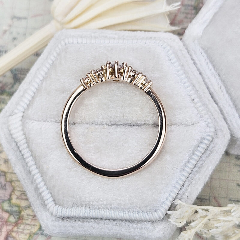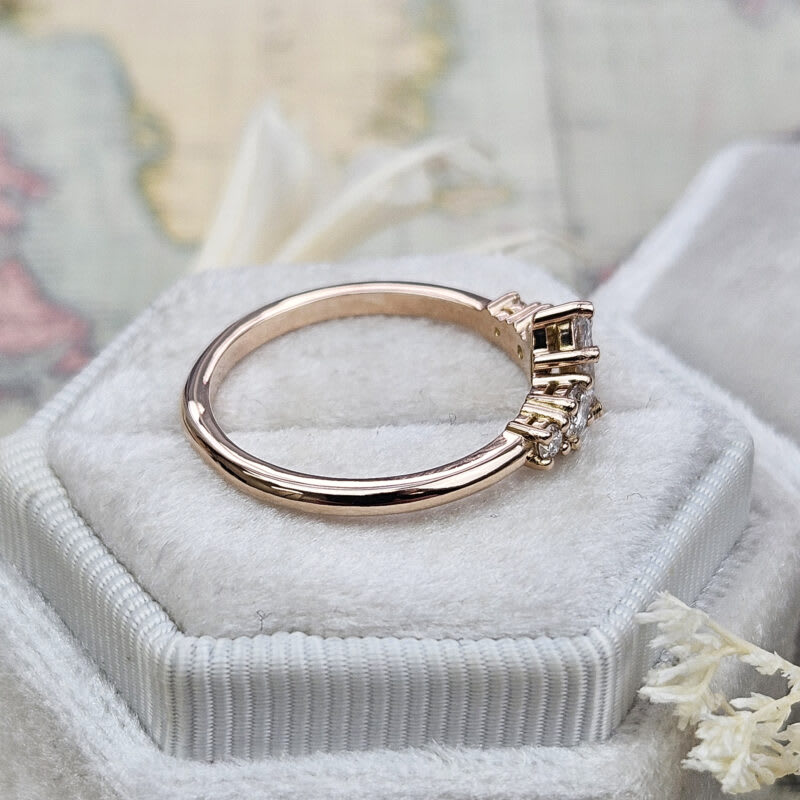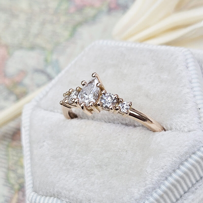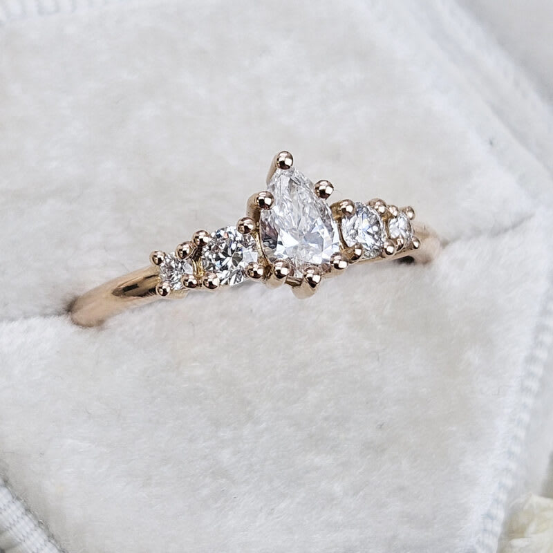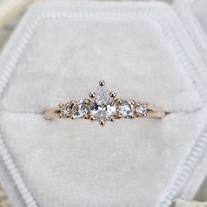 This elegant ring features a central 6x4mm pear cut lab grown diamond, that has been set with matching lab grown round brilliant cut diamonds in a low profile 18ct rose mount!