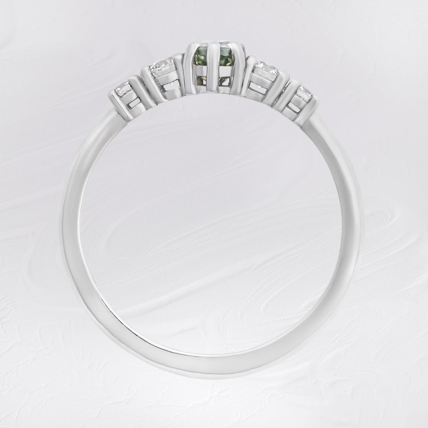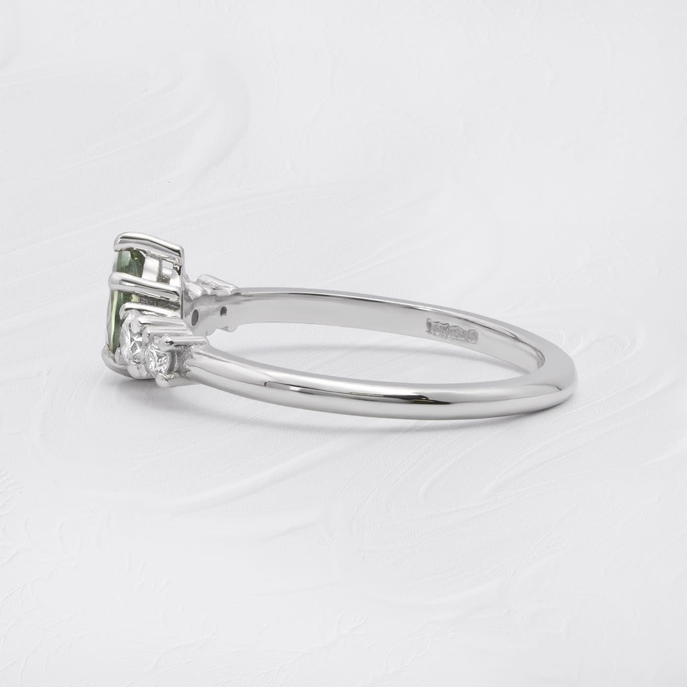 This stunning engagement ring features a central pear cut lab grown seafoam green sapphire. Set with 5 prongs with 4 graduated brilliant cut lab grown diamonds, it has a sleek and elegant low profile mount.