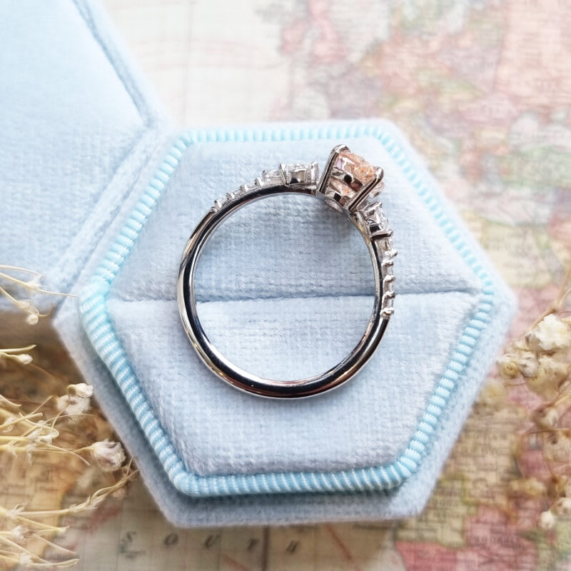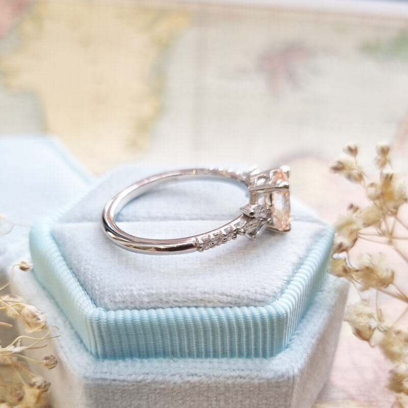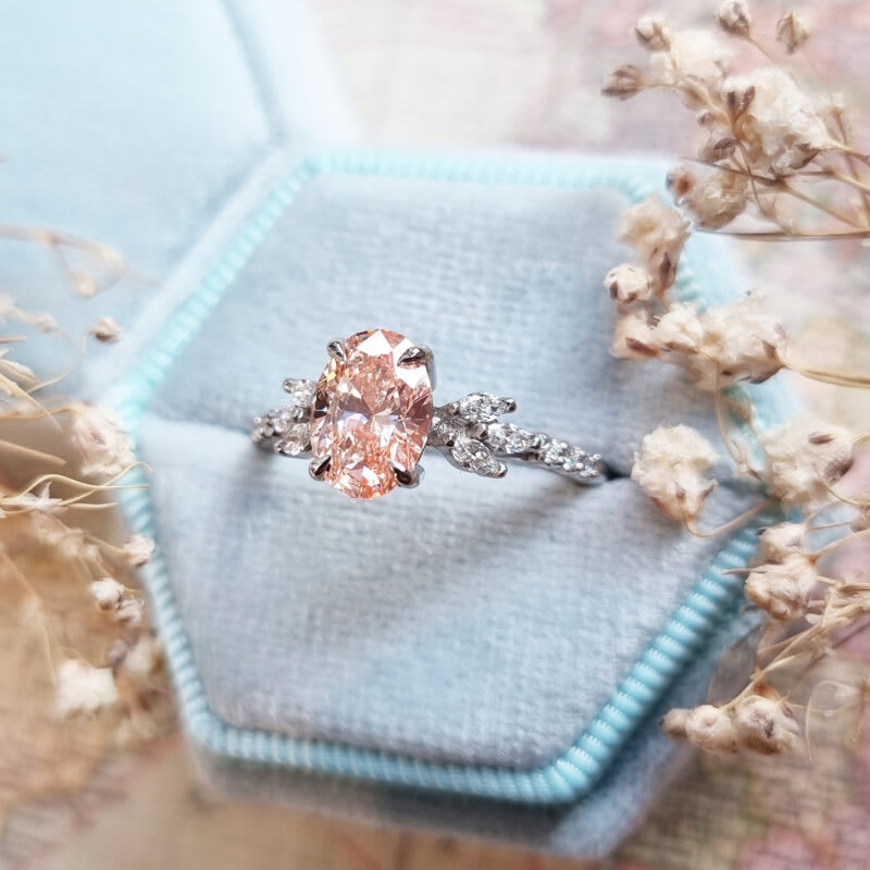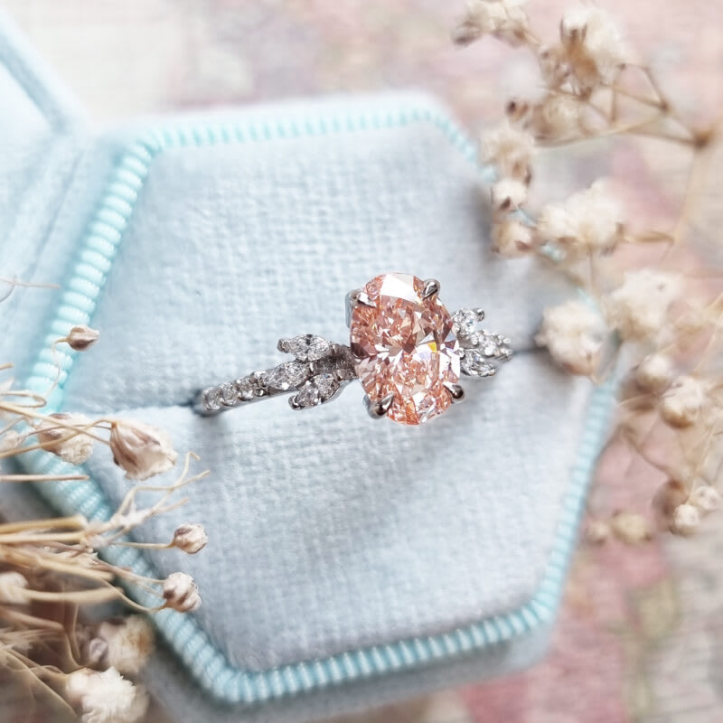 This brand new stunning ring features a central lab grown oval pink diamond. It has been talon set with 6 marquise cut diamonds, and a further 6 round brilliant cut diamonds in a beautiful floral inspired platinum mount!
