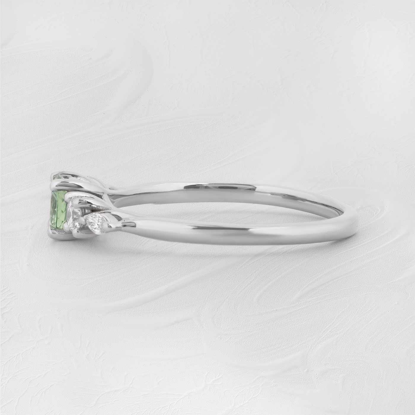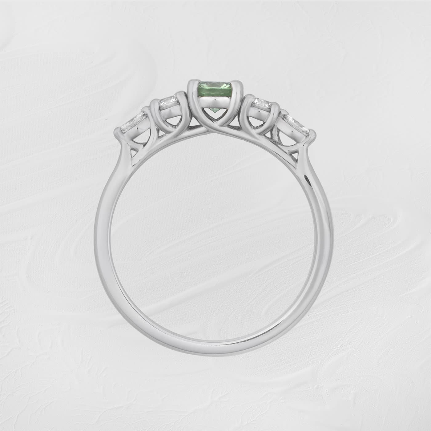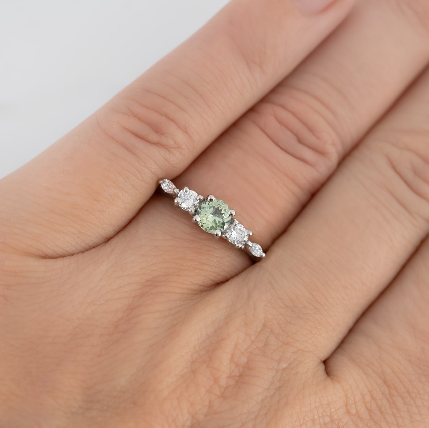 A gorgeous new teal sapphire and diamond ring in our stunning trellis detail setting, featuring a central 0.6ct natural precision cut seafoam green sapphire, flanked with round and marquise diamonds all in 9ct white gold.