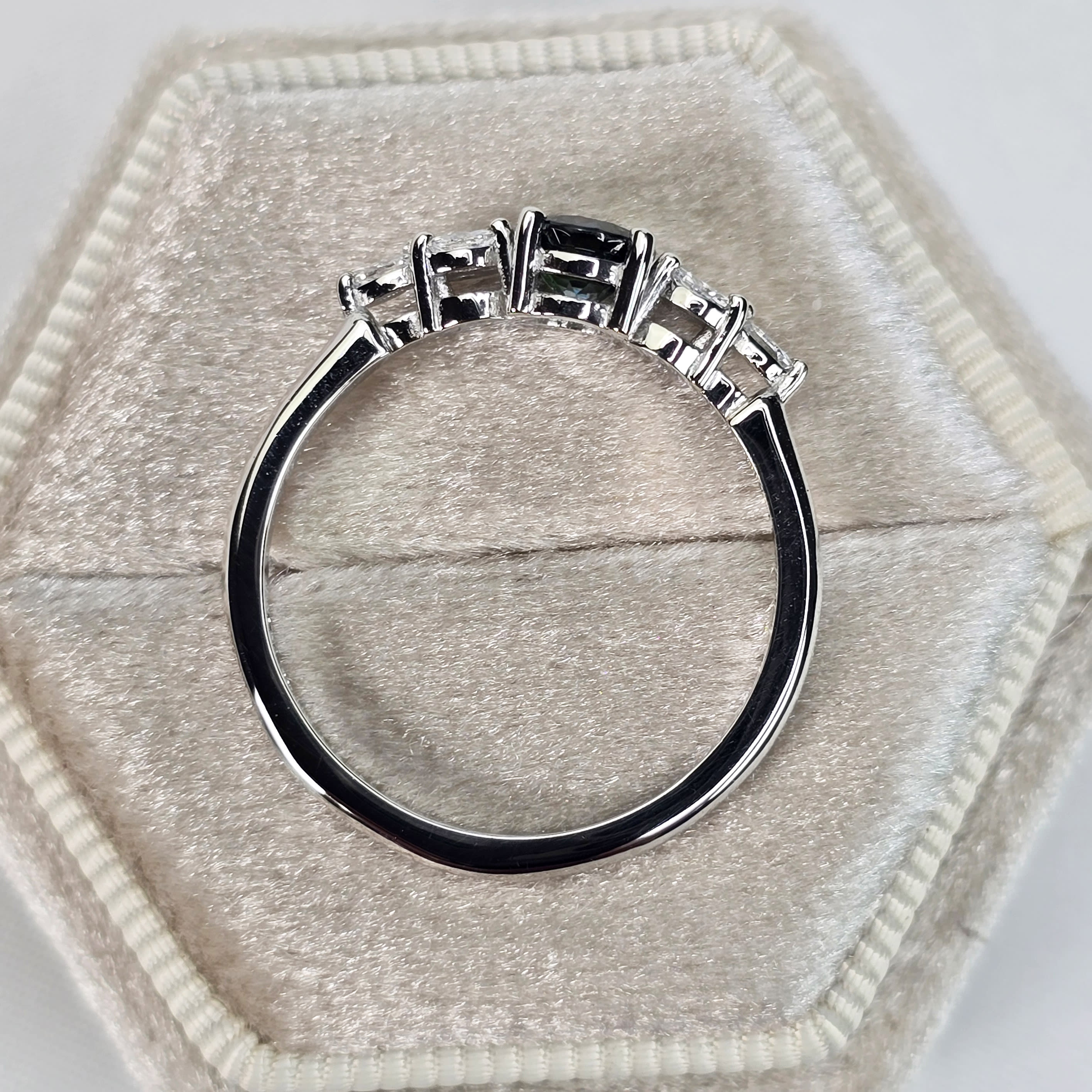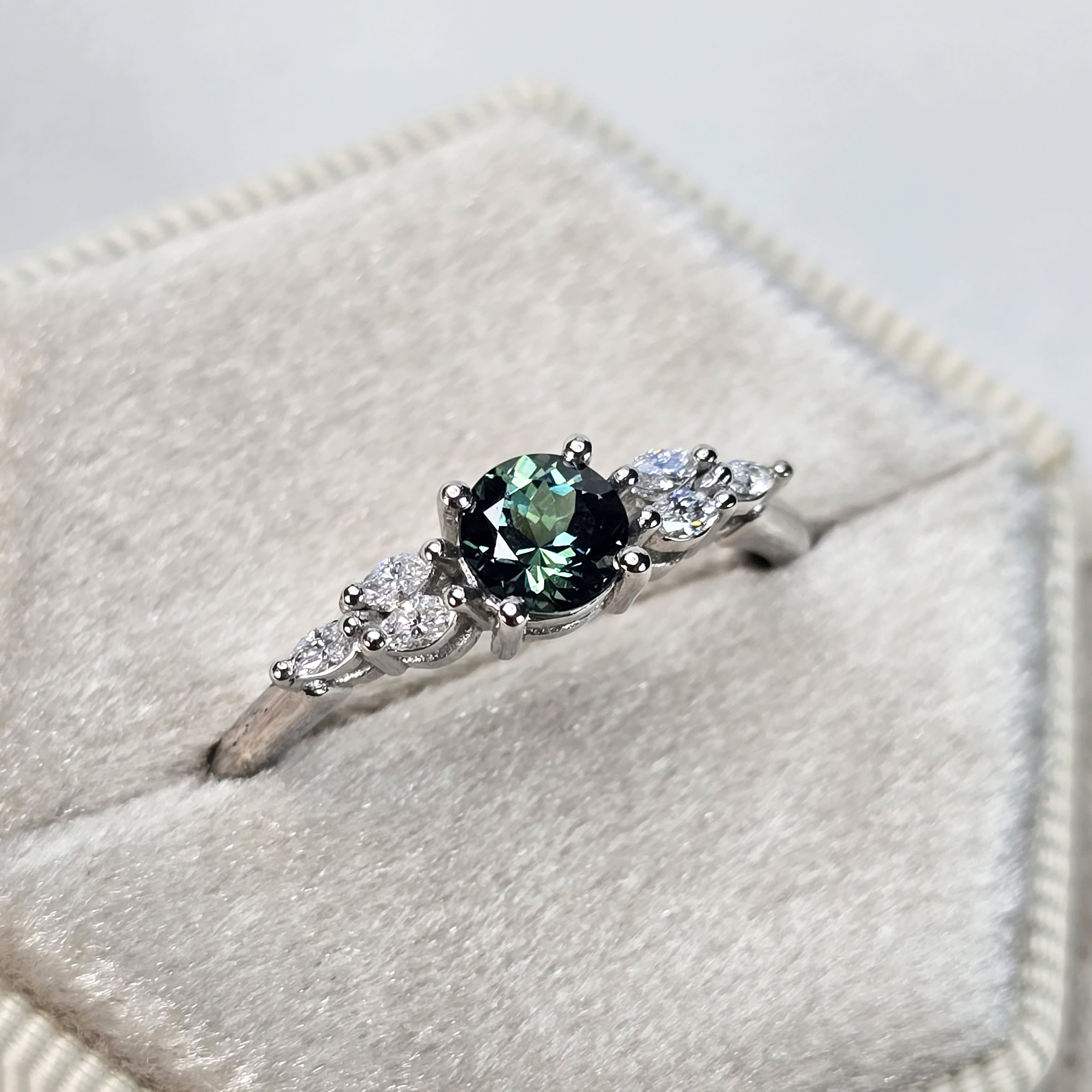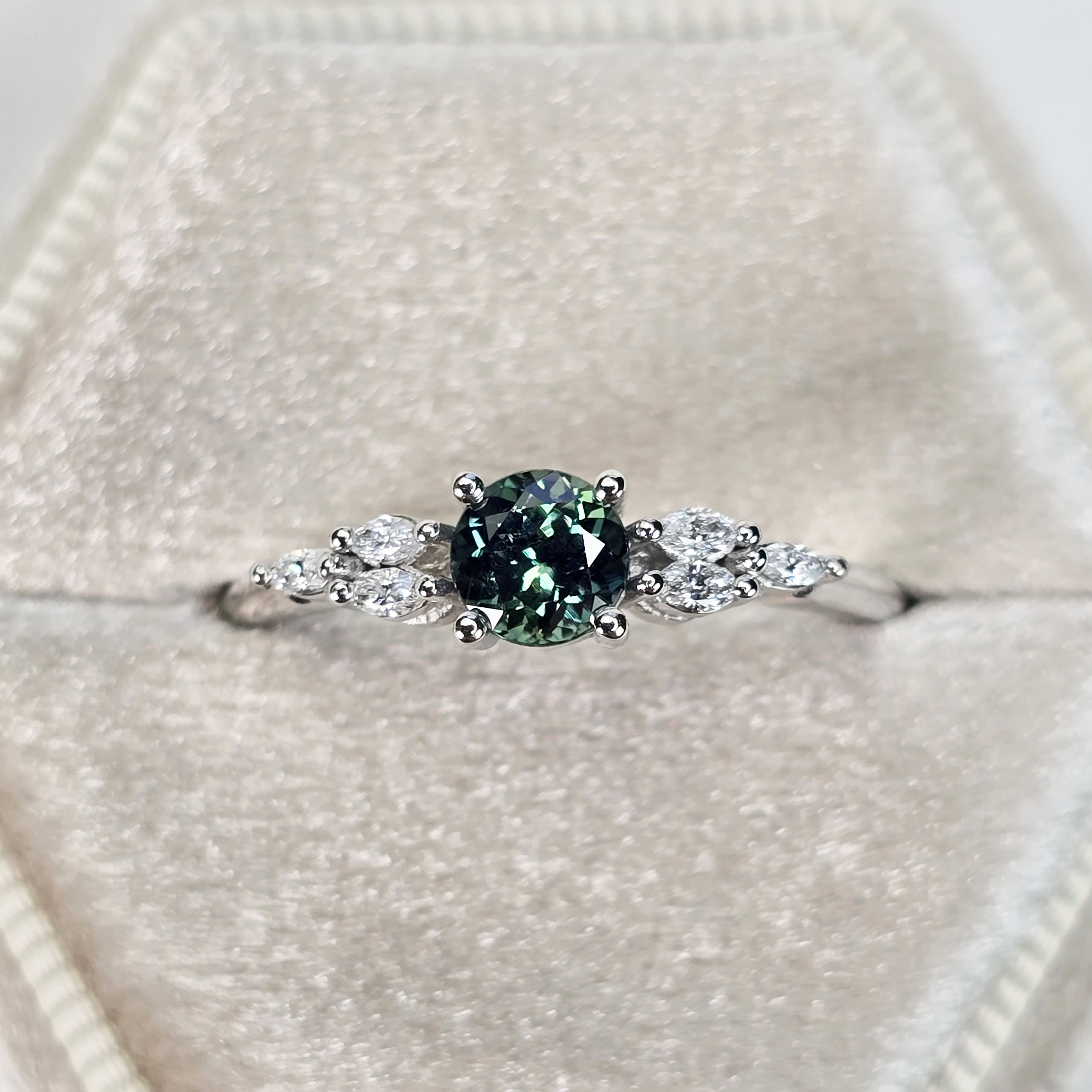 This brand new stunning ring features a central, natural, precision cut teal sapphire. It has been set in a stunning 4 prong delicate mount, with 6 accent marquise cut white diamonds in platinum!