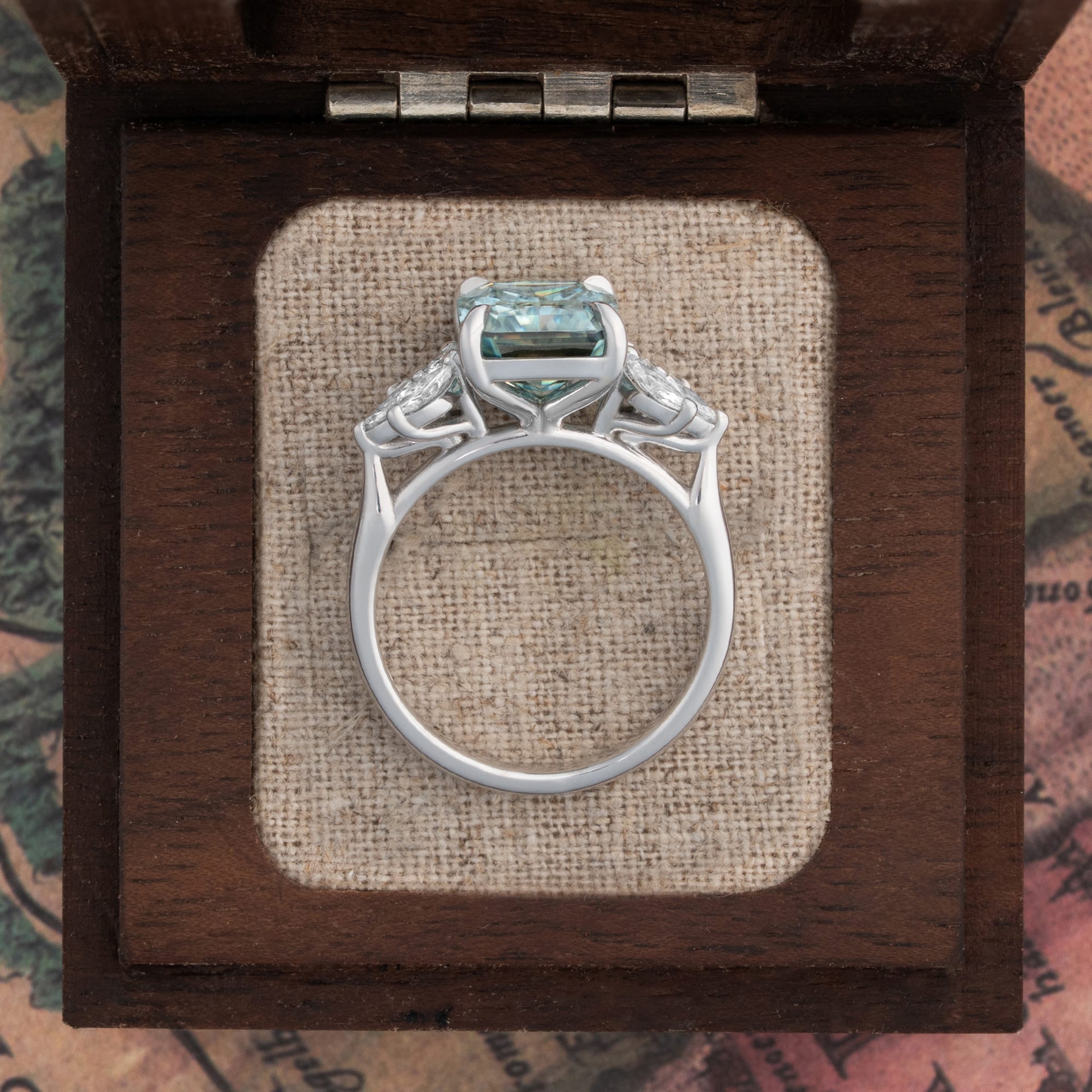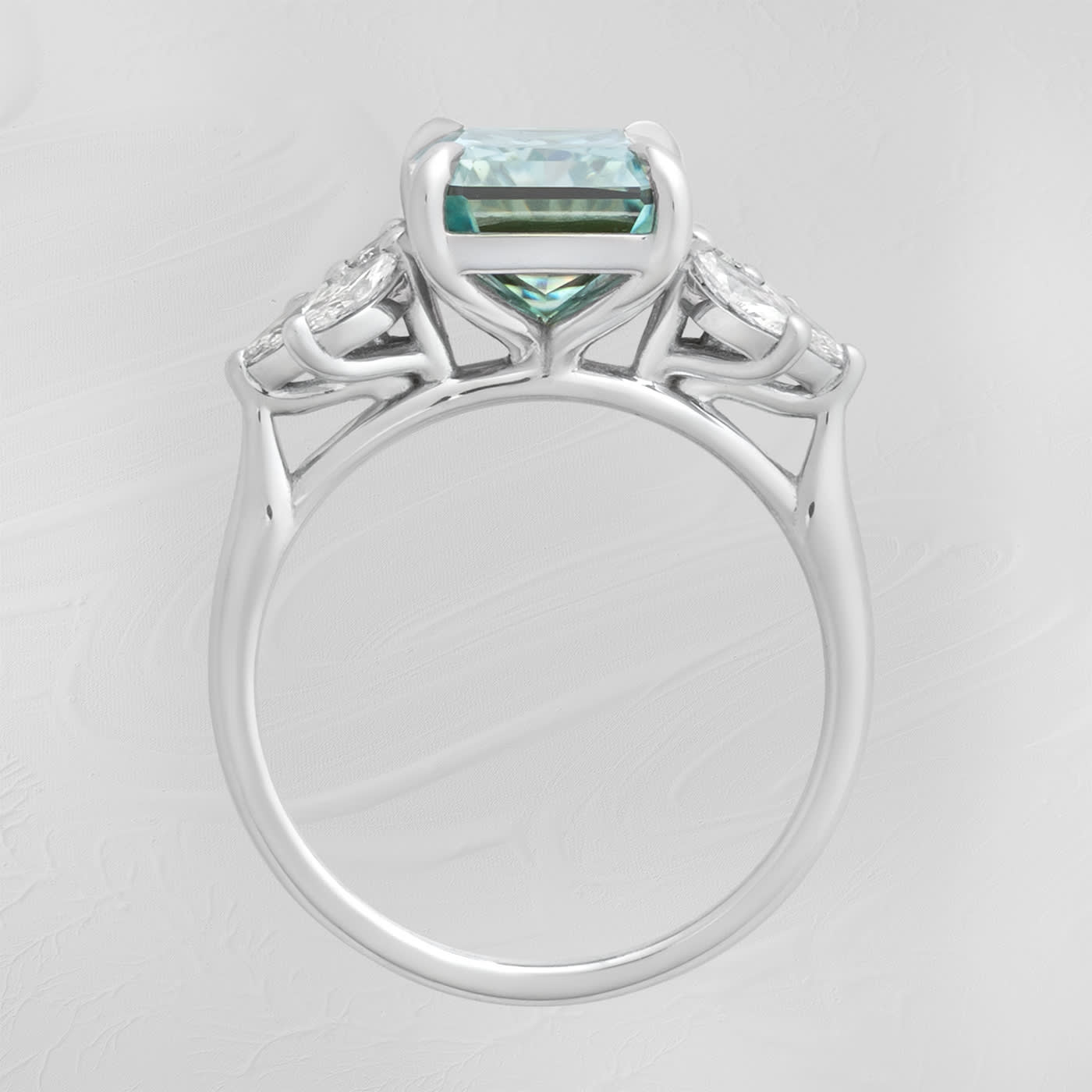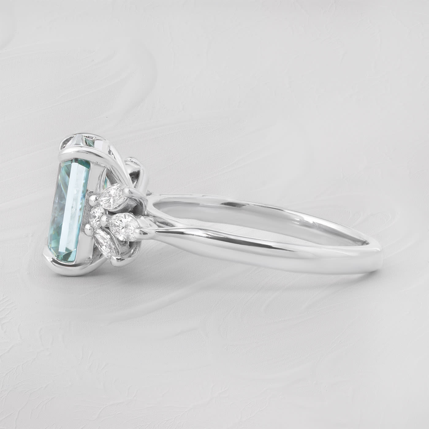 Description: This luxury engagement ring features a central radiant cut, fancy light blue moissanite. The center stone is talon set within a cluster of accent diamonds, comprised of six marquise and two round brilliant cuts totaling 0.45ct. The accent stones form a floral arrangement around the primary stone, all set within an ornate 9ct white gold fine jewellery setting.
