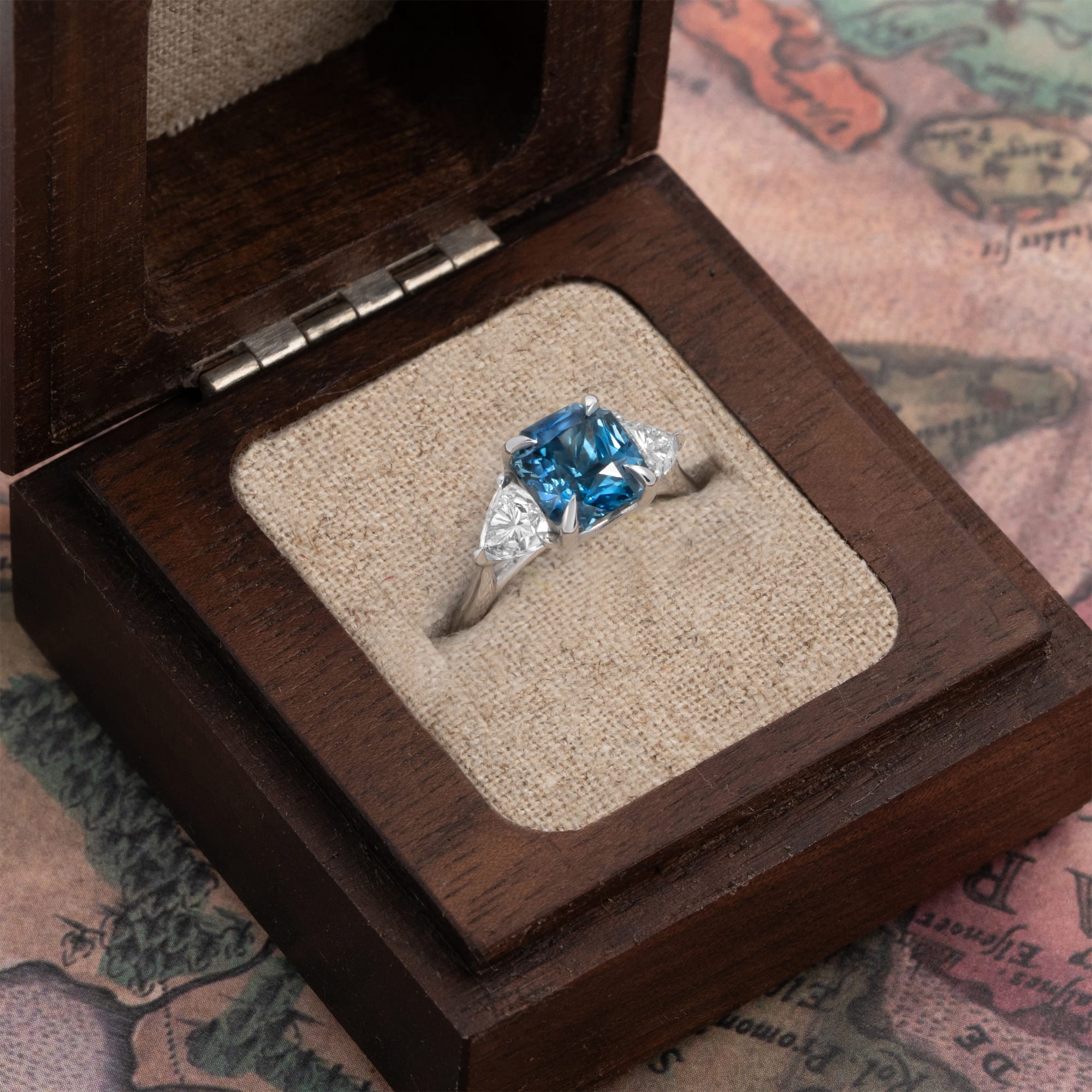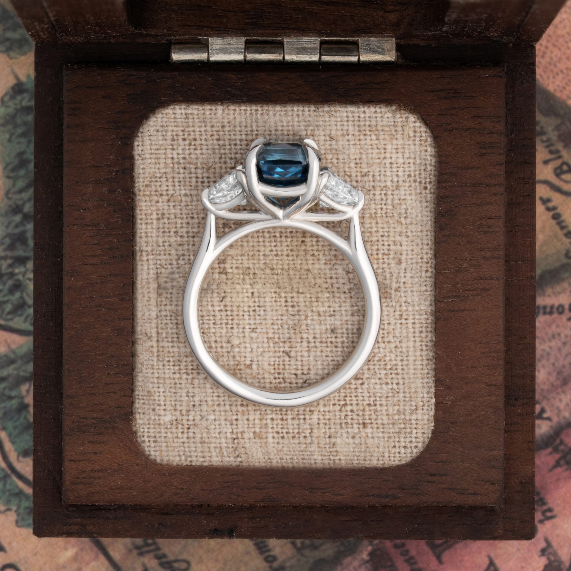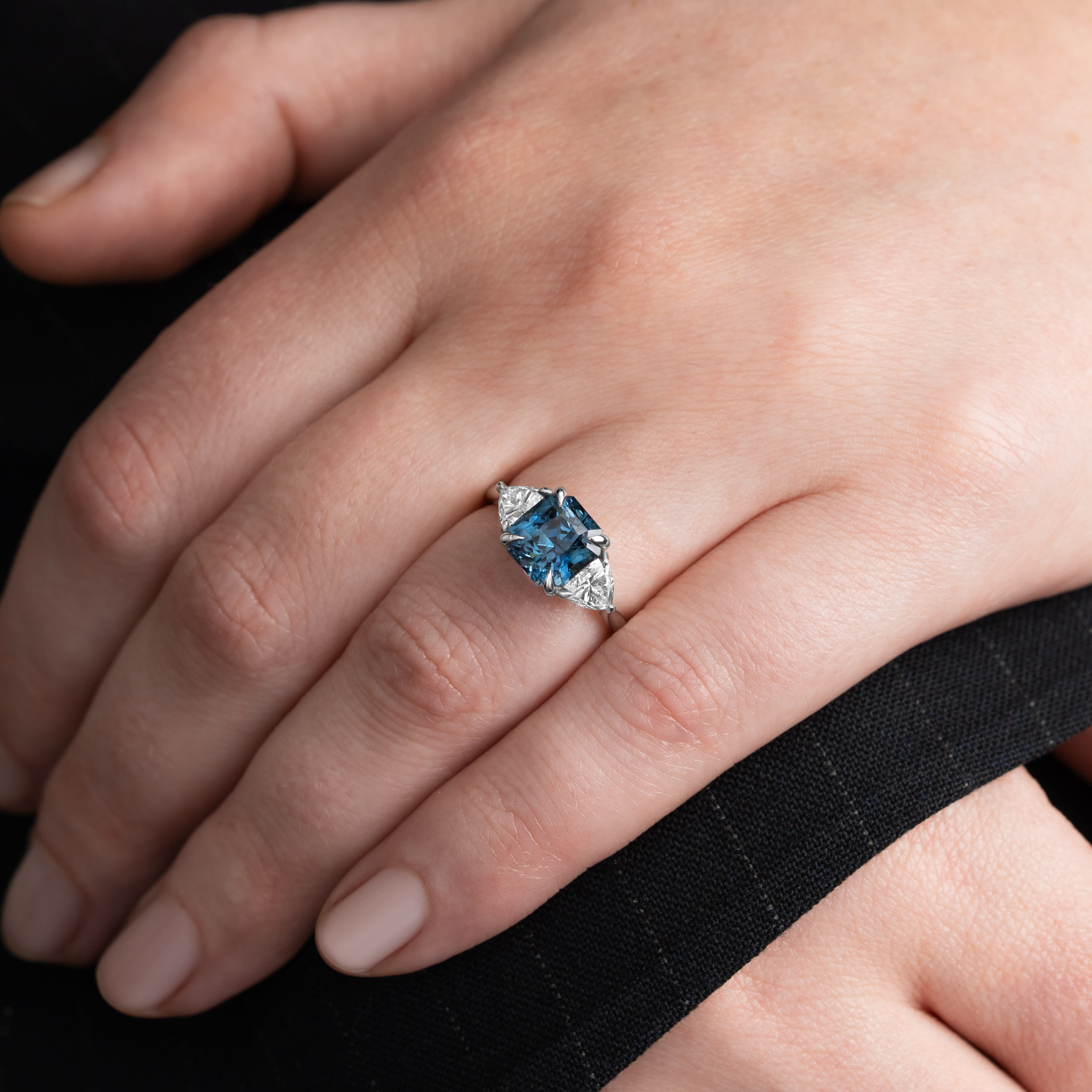 Description: This trilogy engagement ring features a 3.06ct radiant-cut natural blue sapphire as the centre stone, set in a flowing three-stone platinum mount. The sapphire is flanked by two trilliant-cut lab-grown diamonds, which complement the central stone. The setting is designed for a secure, low-profile fit.