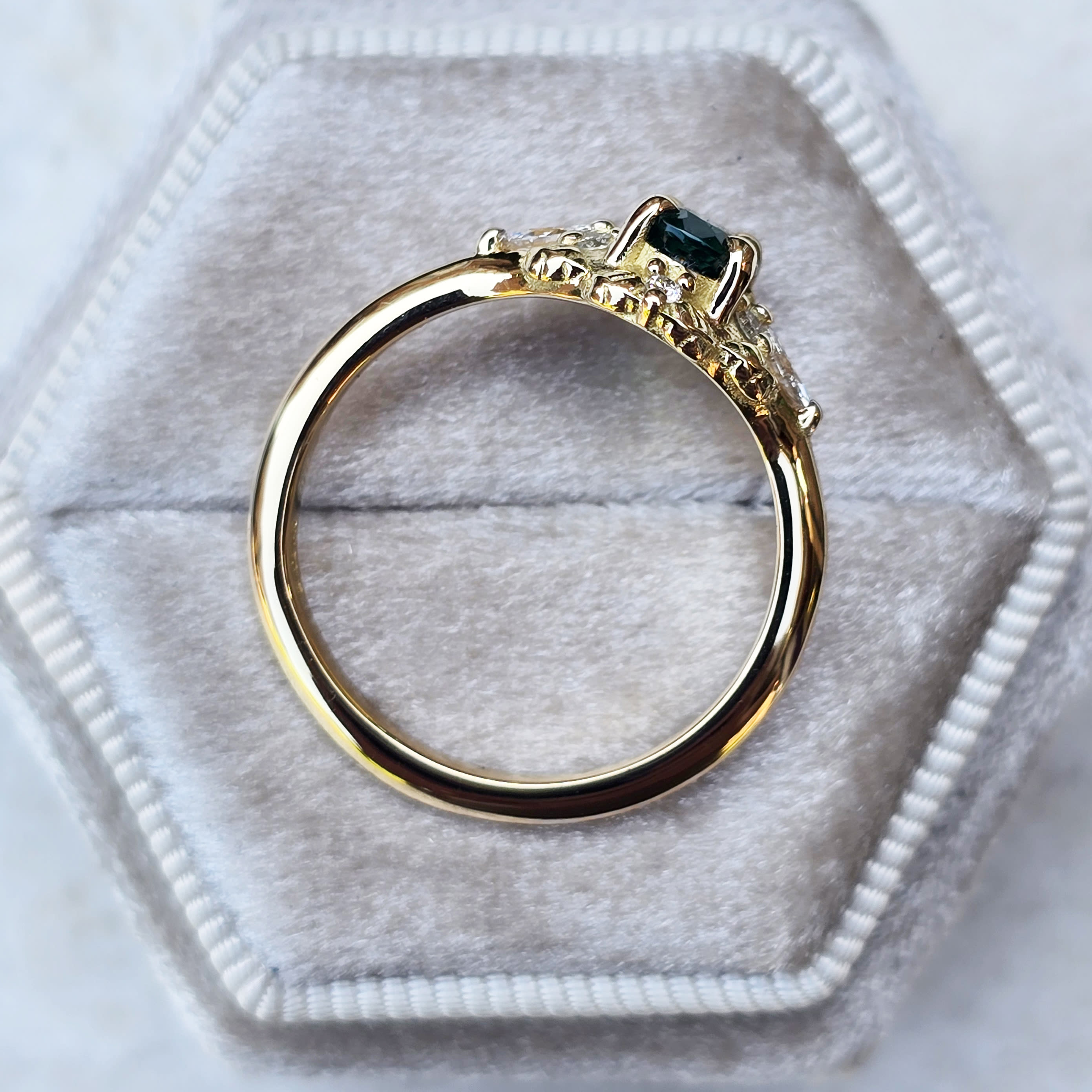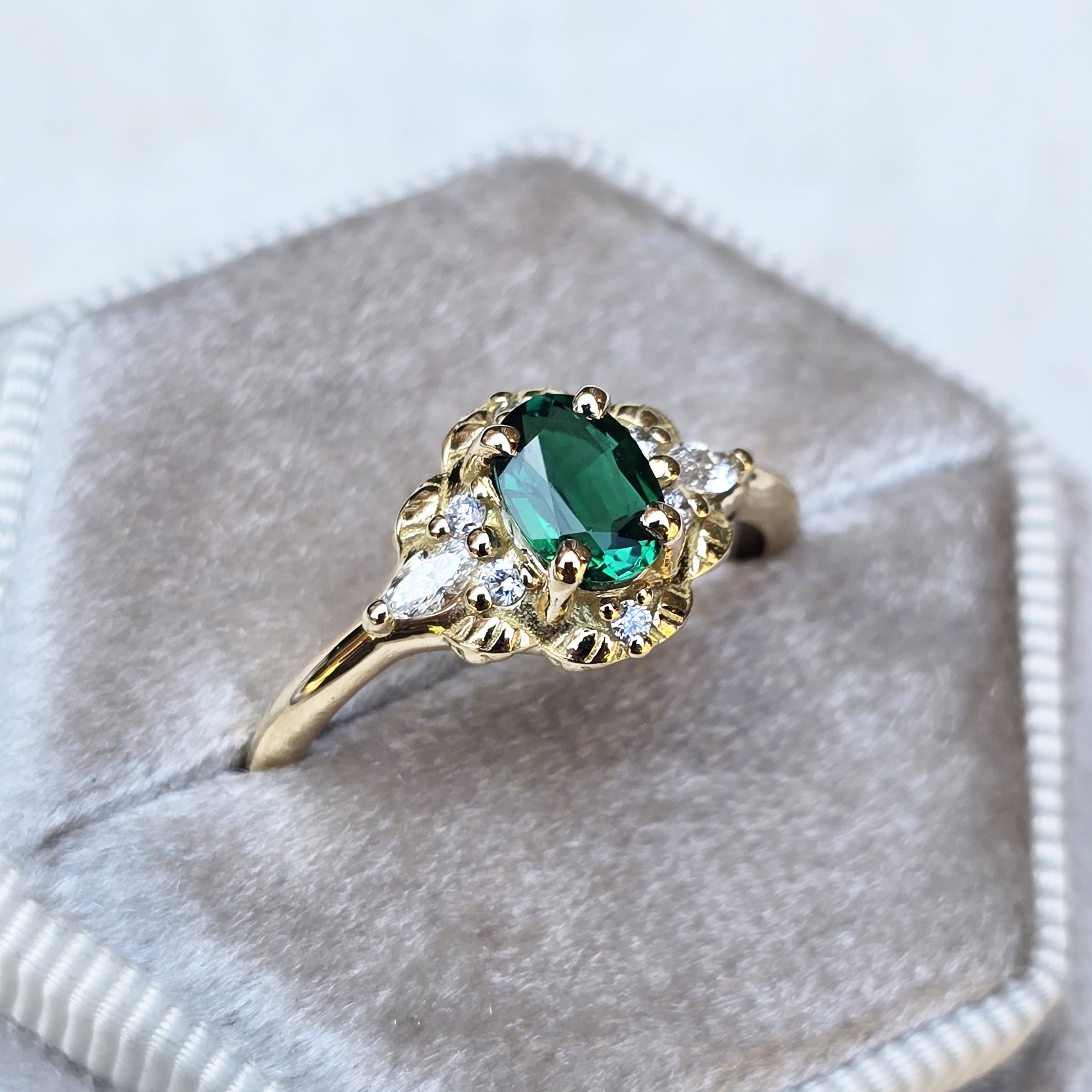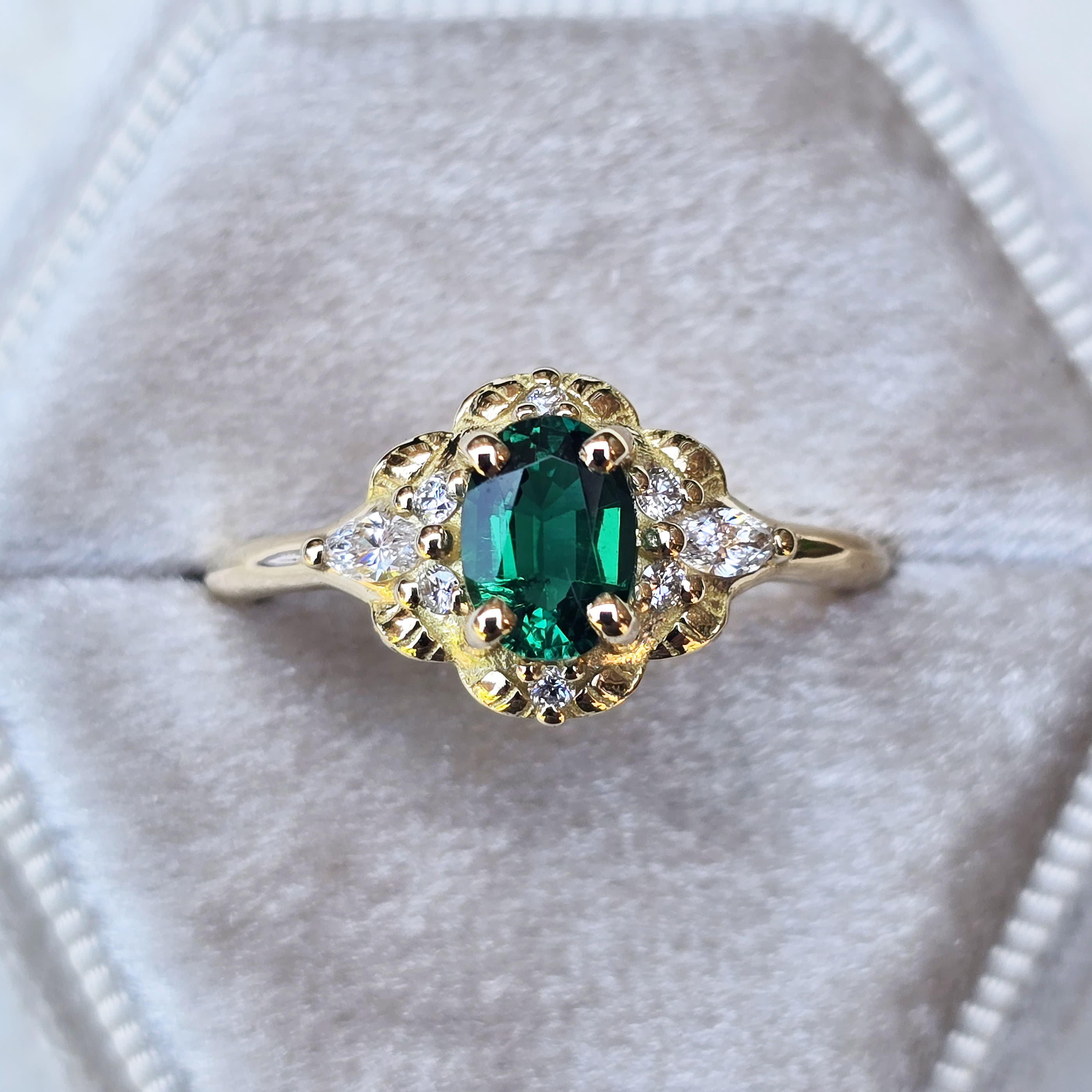 At the centre, an oval lab-grown emerald takes the spotlight, encircled by a delicate halo of round and marquise diamonds that shimmer like dewdrops at dawn. A wreath of tiny sculpted leaves, all in warm 18ct yellow gold, completes the design — a timeless symbol of growth, love, and beauty.