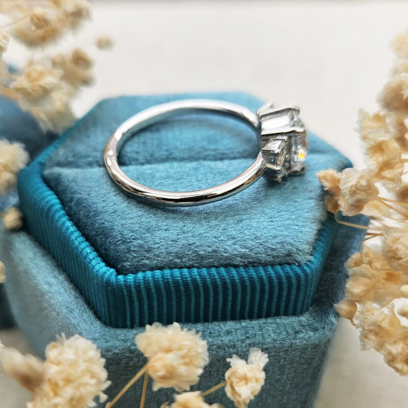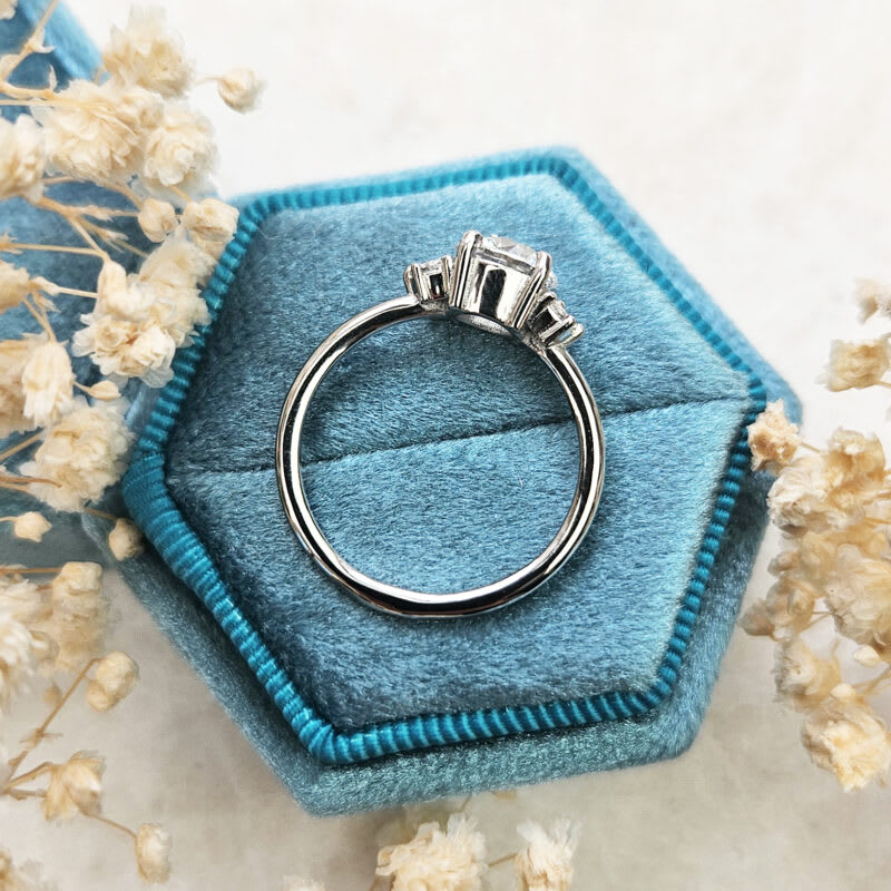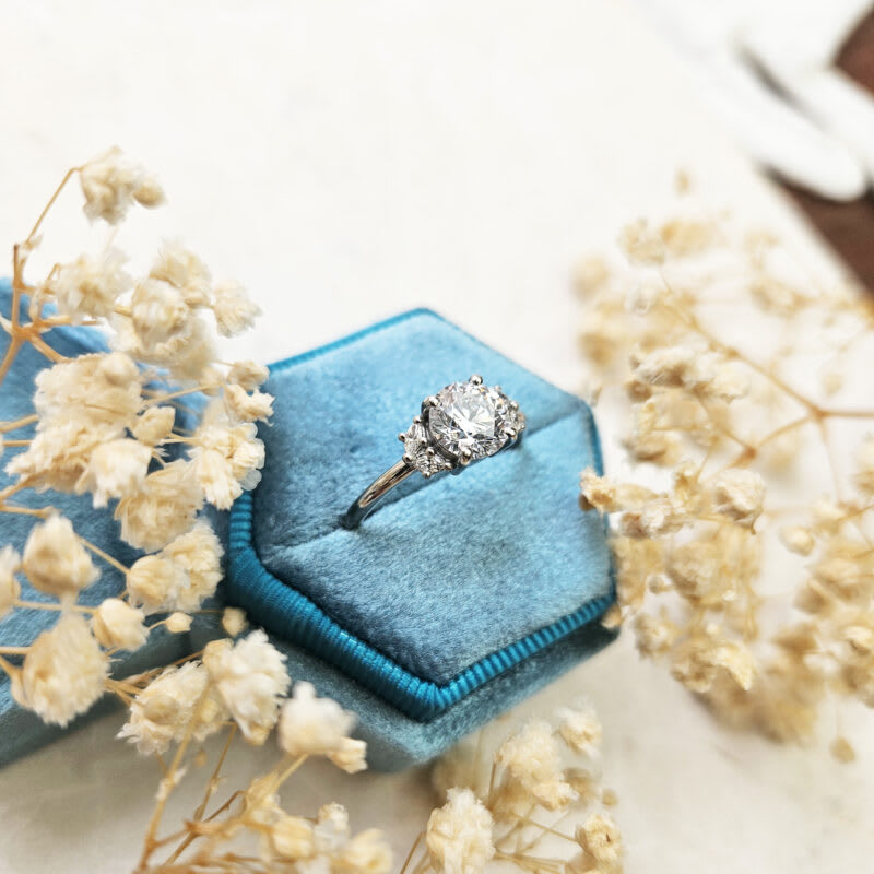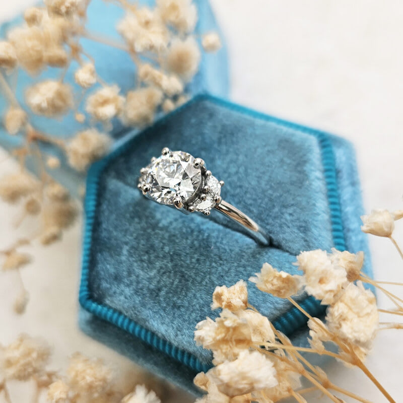 This brand new ring features a central stunning 1.3ct round brilliant cut lab grown diamond. It has been prong set in a classic low profile basket setting with four accent marquise diamonds to give a delicate floral vibe to the ring!