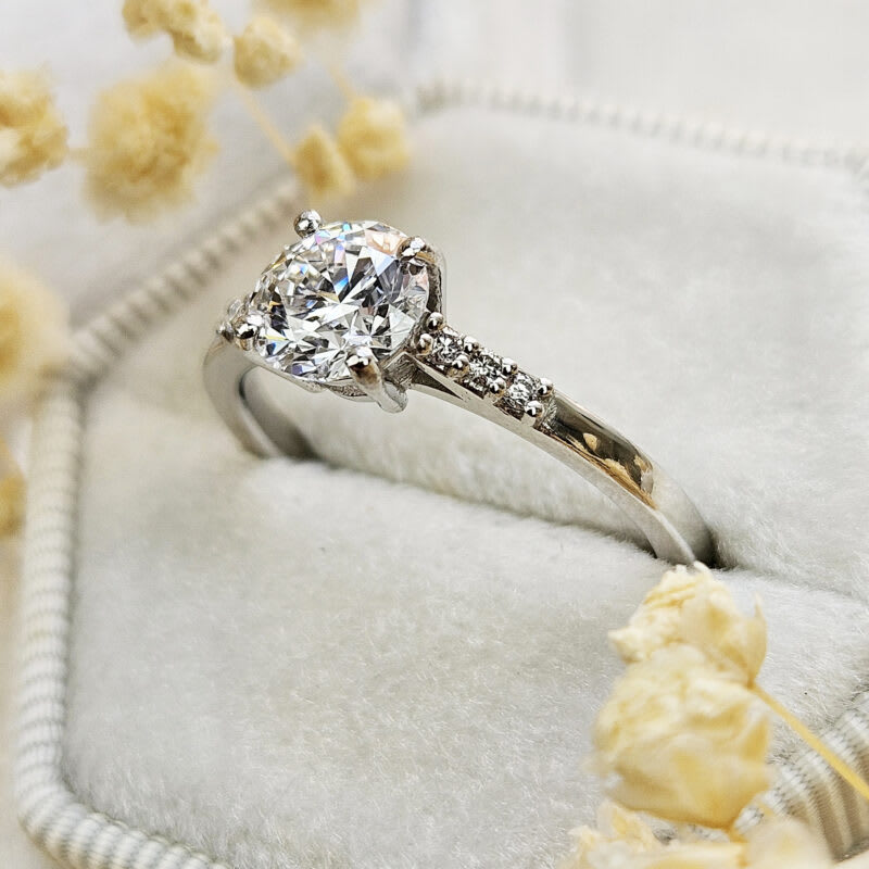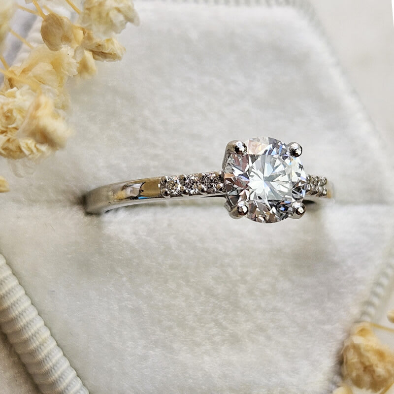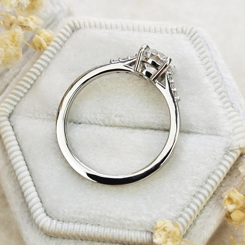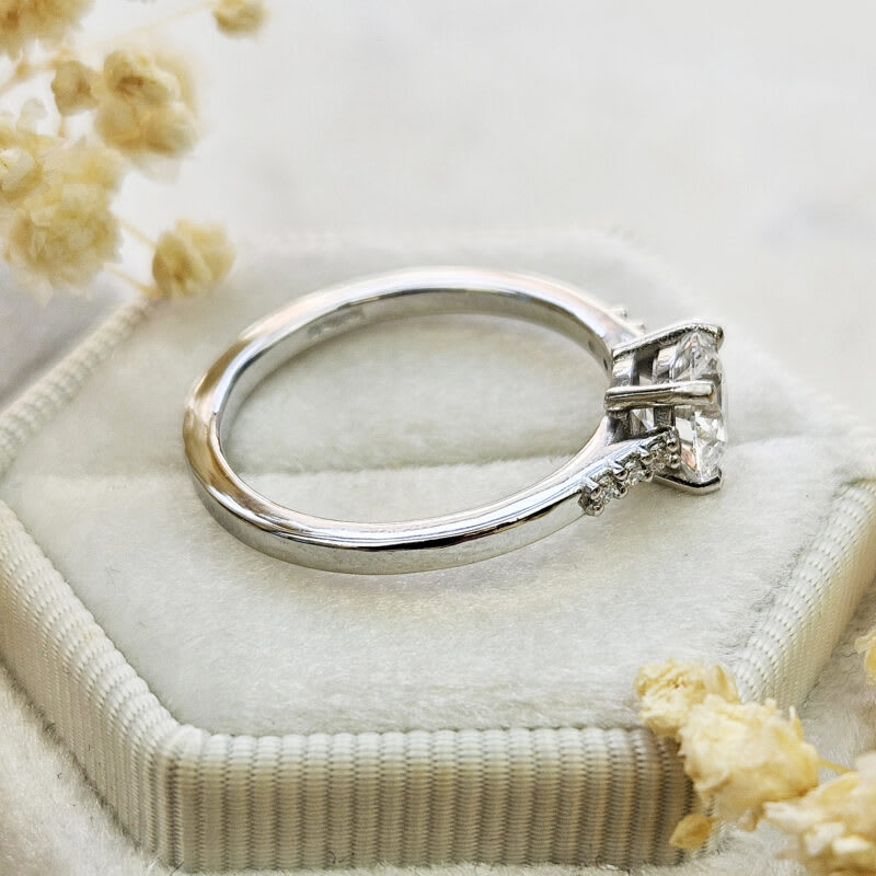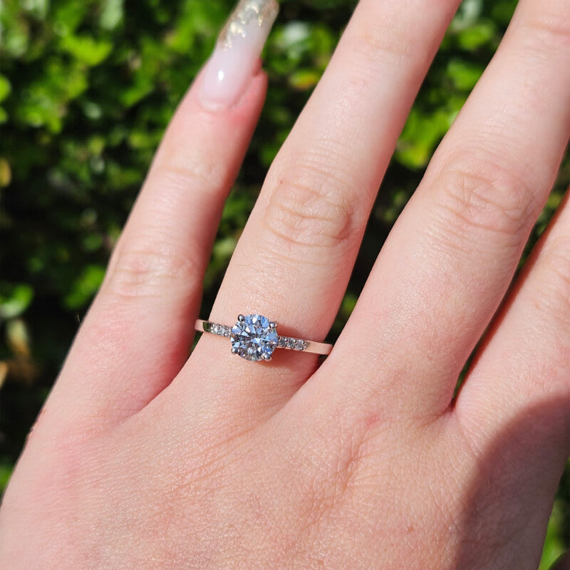 This brand new ring features a central stunning 1ct round brilliant cut lab grown diamond. It has been prong set in a classic low profile basket setting with a square shape cathedral style band, that has been studded with 6 small accent diamonds for an additional subtle sparkle!