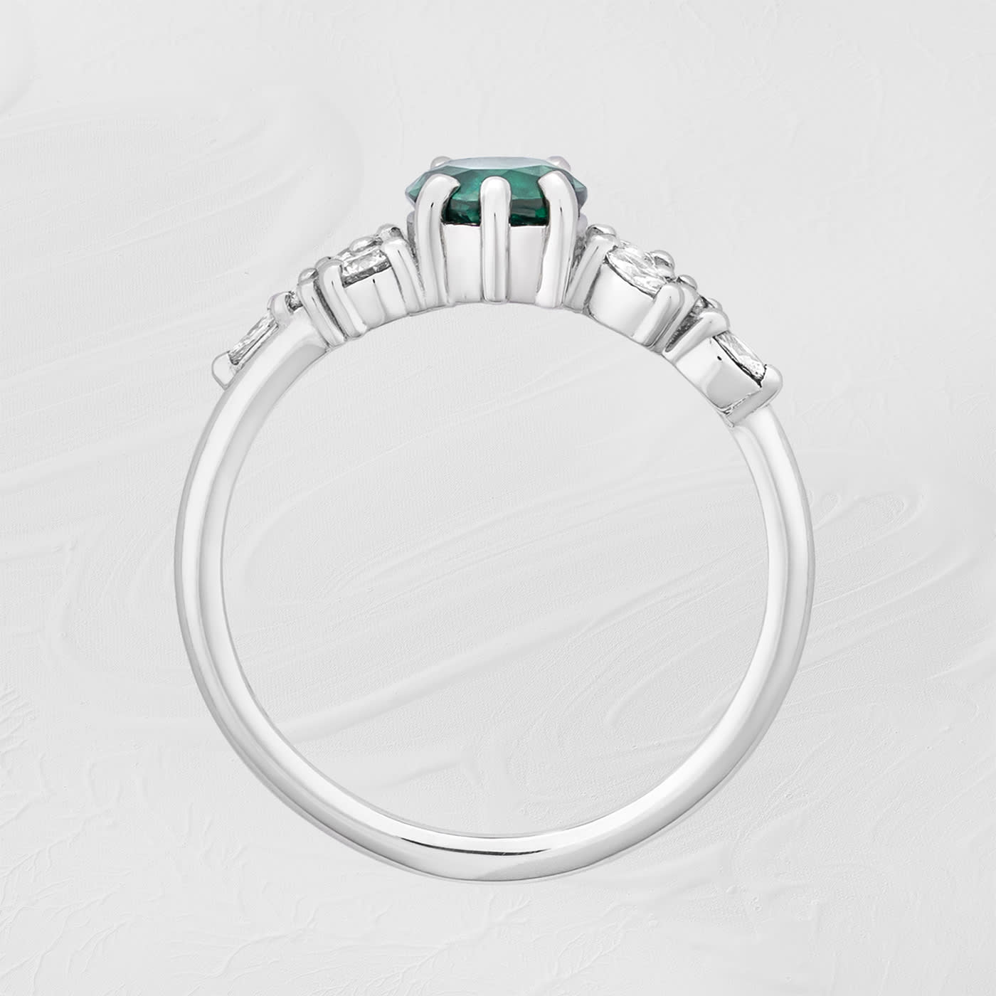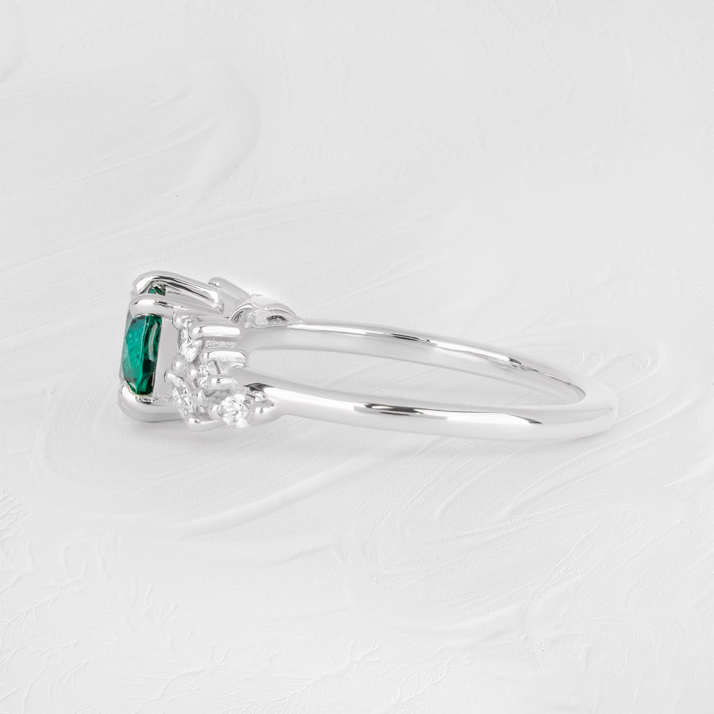 This brand new ring features a mesmerizing round cut lab grown emerald, set with a mixture of marquise and round cut diamonds in a flowing, floral inspired pattern. The ring is designed to be low profile from the finger.