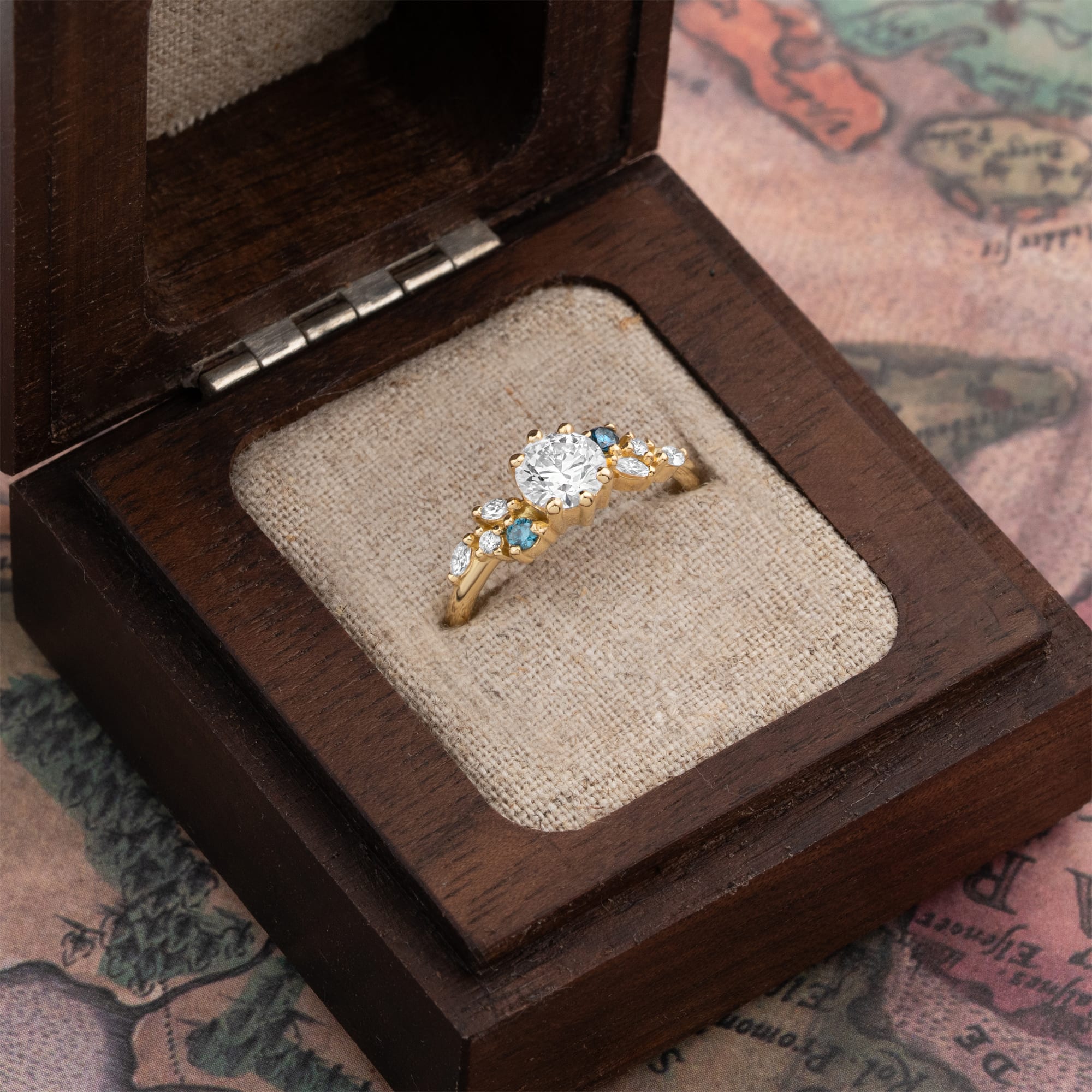 Description: This diamond engagement ring features a central 0.85 carat lab-grown round brilliant cut diamond set in a low-profile, floral-inspired cluster mount. The central stone is accented by a combination of natural round and marquise cut diamonds totalling 0.20 carats, creating an asymmetric look. This fine jewellery piece is designed with a unique setting for a distinctive appearance and includes a substantial total carat weight.