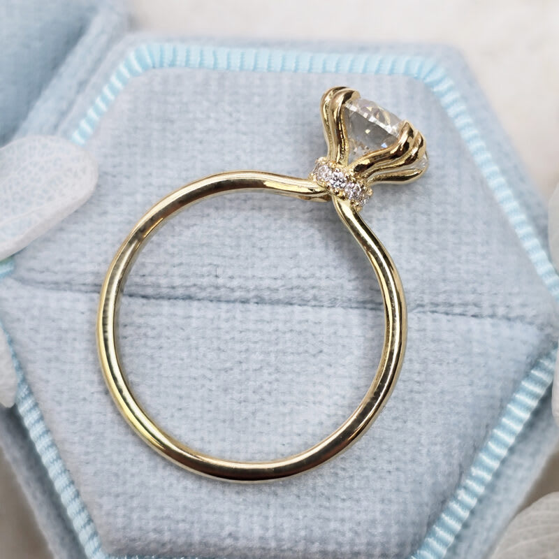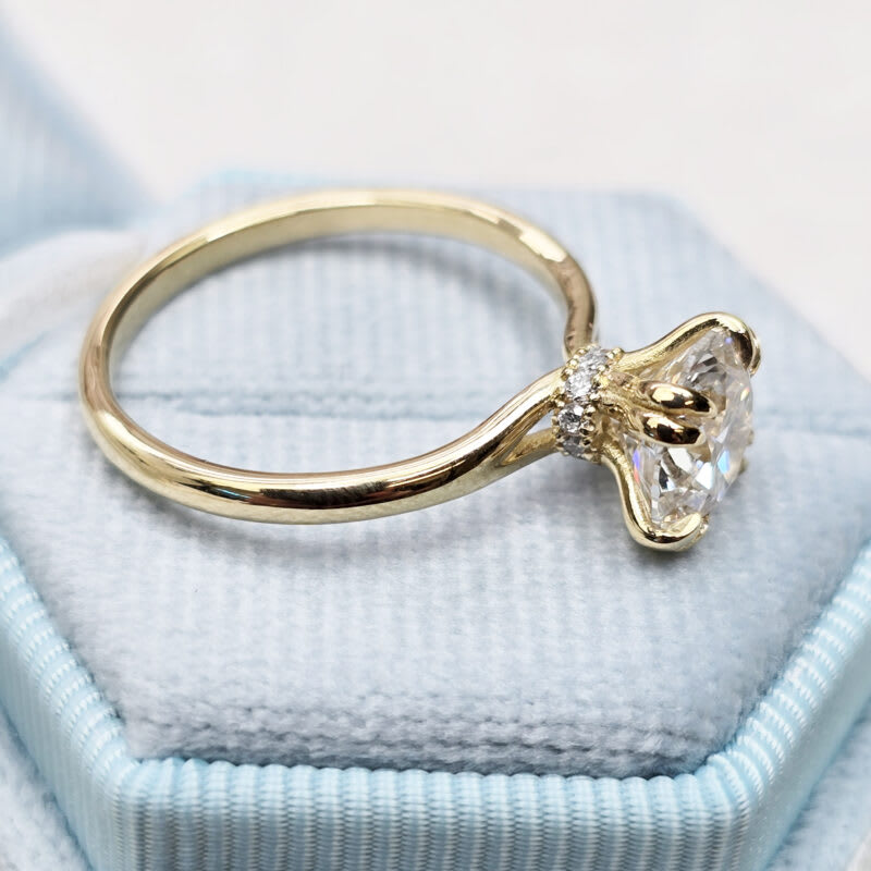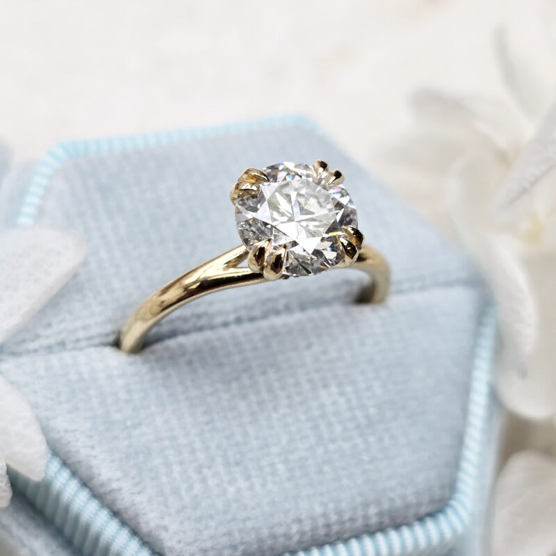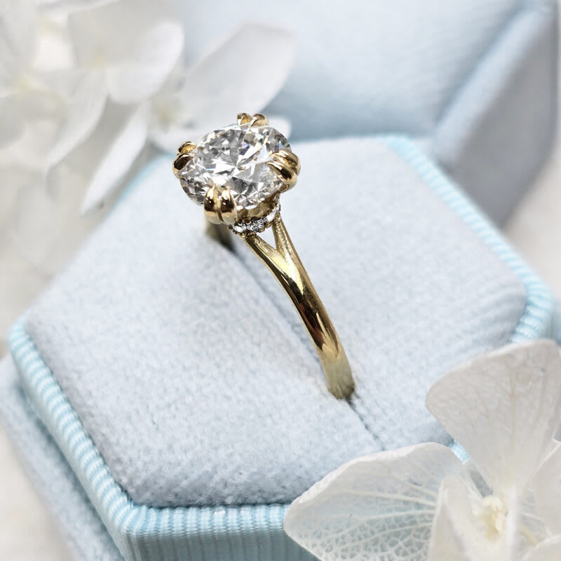 This stunning ring features a central 2ct round brilliant cut lab grown diamond that has been double talon set. The ring features a subtle hidden halo collar of diamonds that wrap around the base of the central diamonds setting, with a split shank style band that ties into the collar, all in 18ct yellow gold!