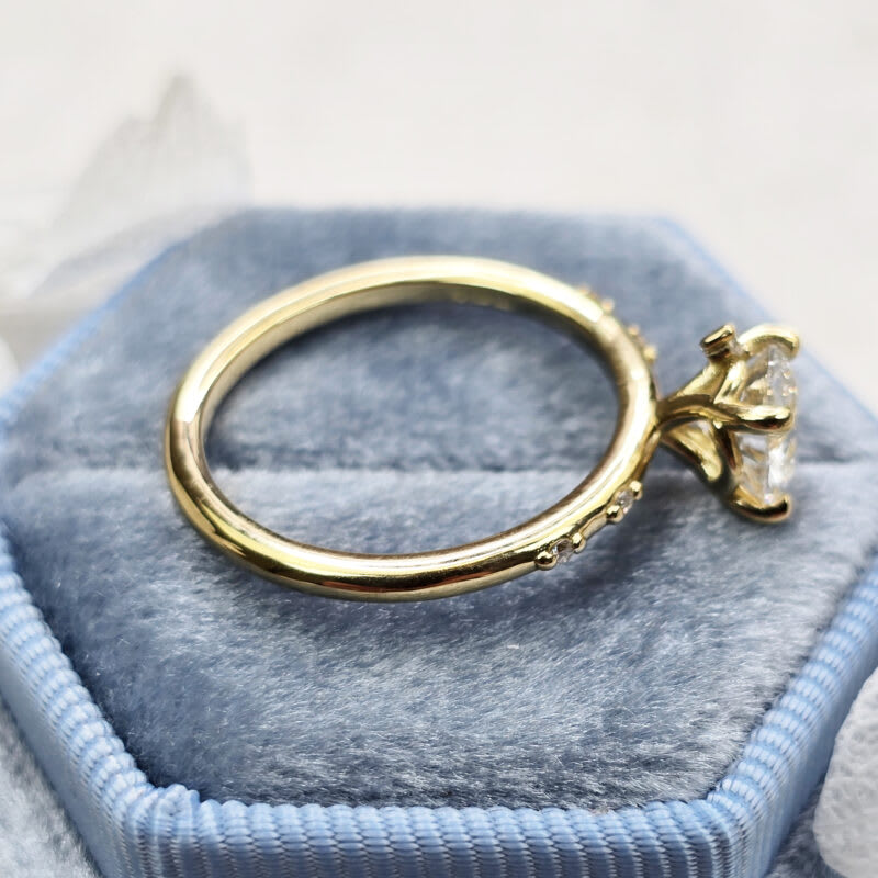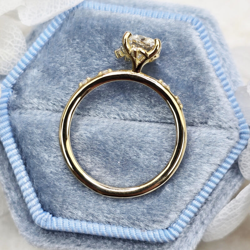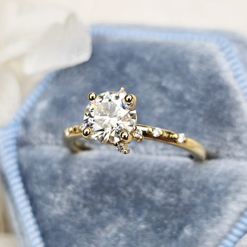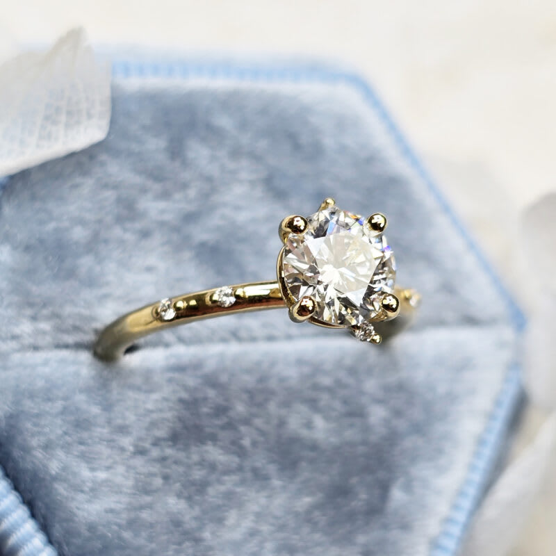 This elegant ring features a central 1ct round brilliant cut lab grown diamond, in a 4 prong setting. The ring has been dotted with an asymmetric array of miniature round brilliant cut diamonds, all in 18ct yellow gold!