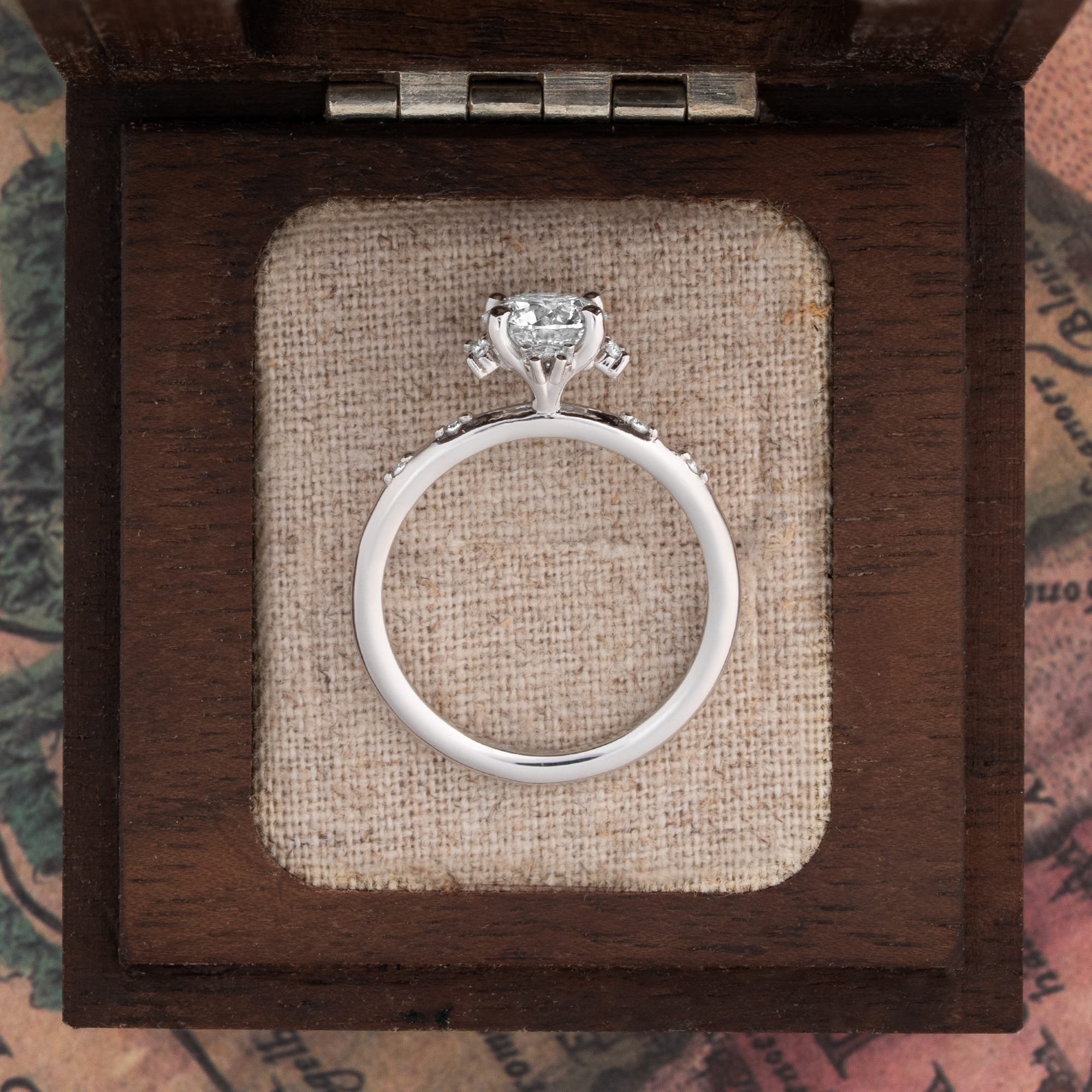 Description: This diamond engagement ring features a central 1.00ct round brilliant cut lab-grown diamond secured in a four-prong setting. The centre stone is surrounded by a halo of miniature accent diamonds, with additional accent stones set along the platinum band. This fine jewellery design incorporates a cluster of diamonds for enhanced visual impact.