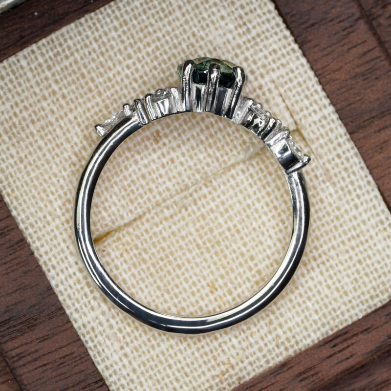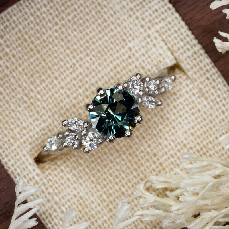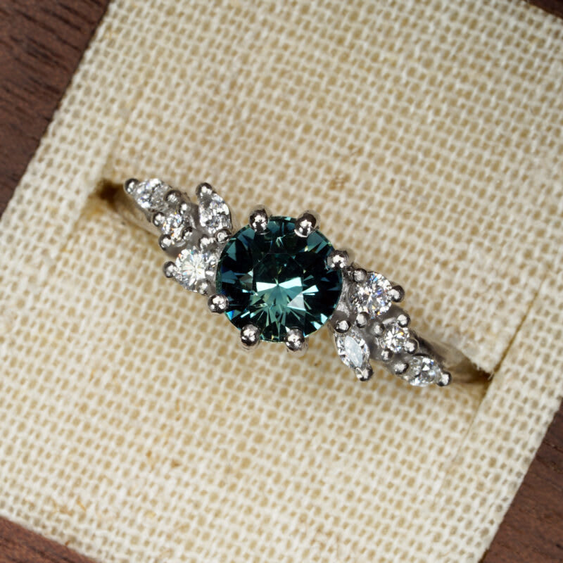 This brand new ring features a central stunning 1.55ct natural teal round cut sapphire, that has been set with a floral mixture of marquise and round cut diamonds, in a platinum, low profile mount!