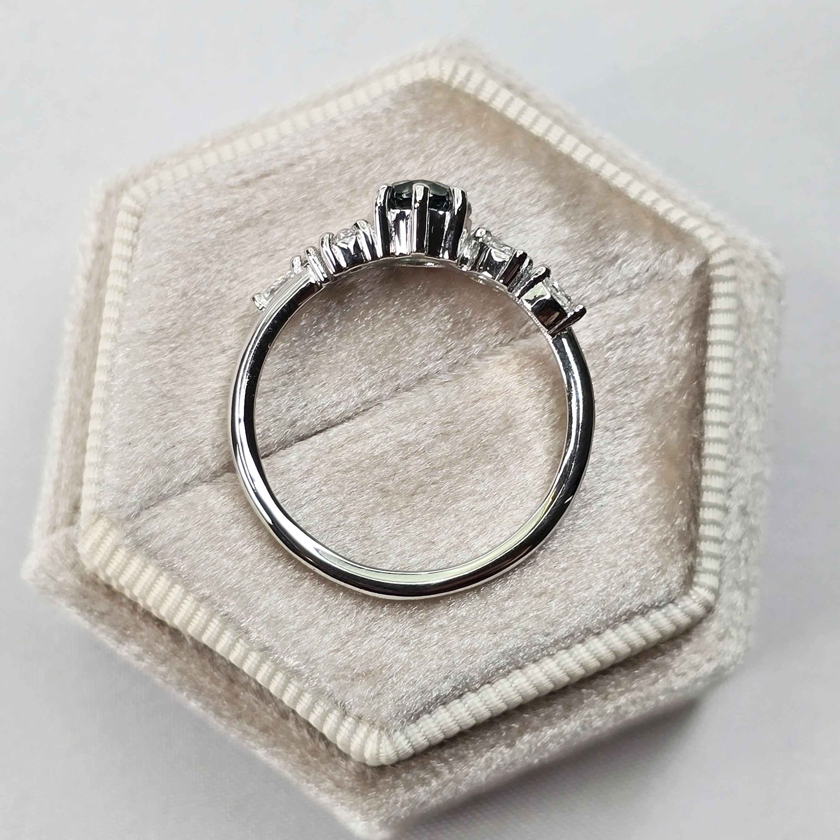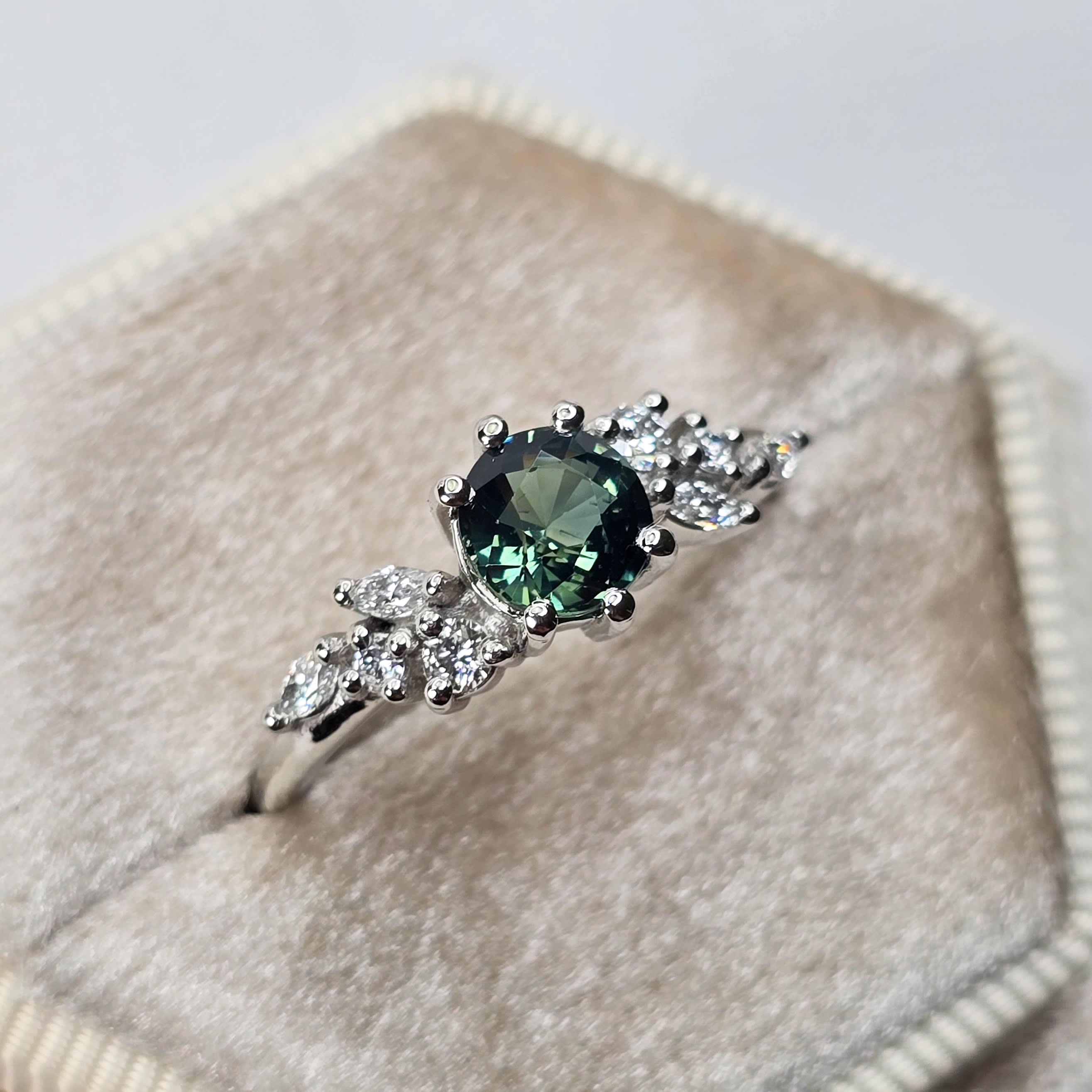 This brand new ring features a central stunning 1.13ct natural teal round cut sapphire, that has been set with a floral mixture of marquise and round cut diamonds, in a platinum, low profile mount!
