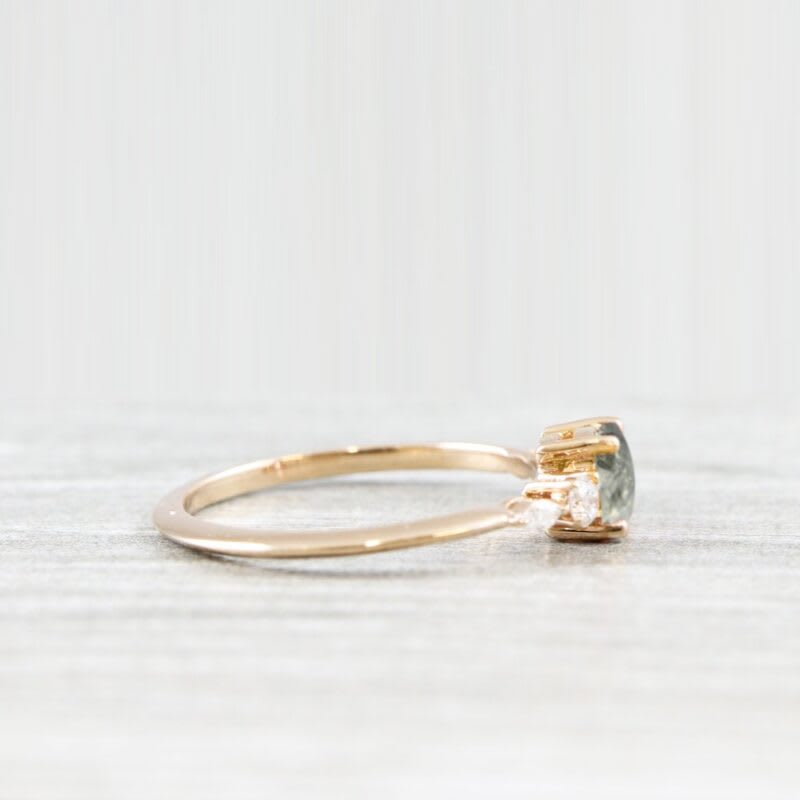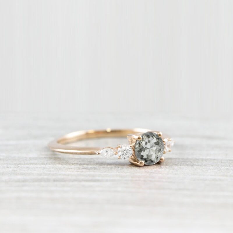 This brand new stunning ring features a central rose cut salt and pepper diamond, set with 4 marquise and round shape lab grown diamonds in a petite style mount!