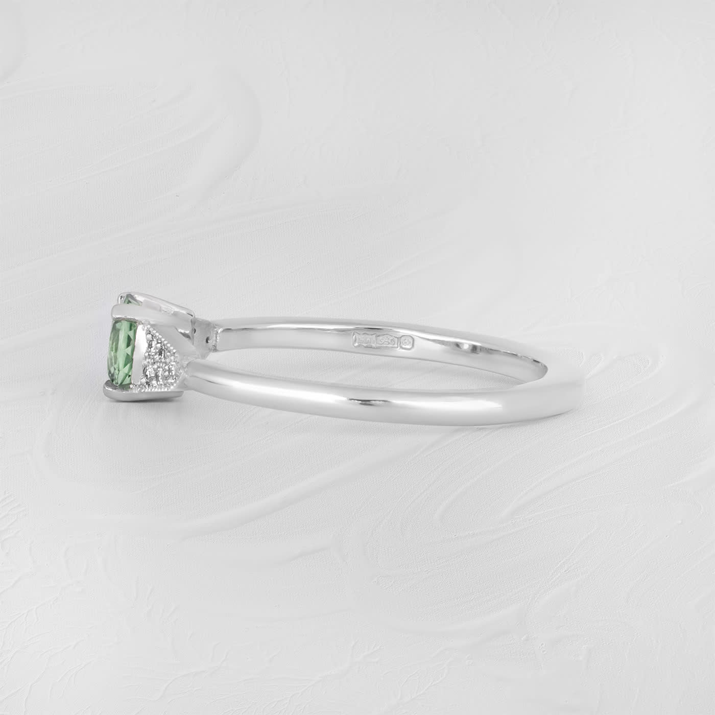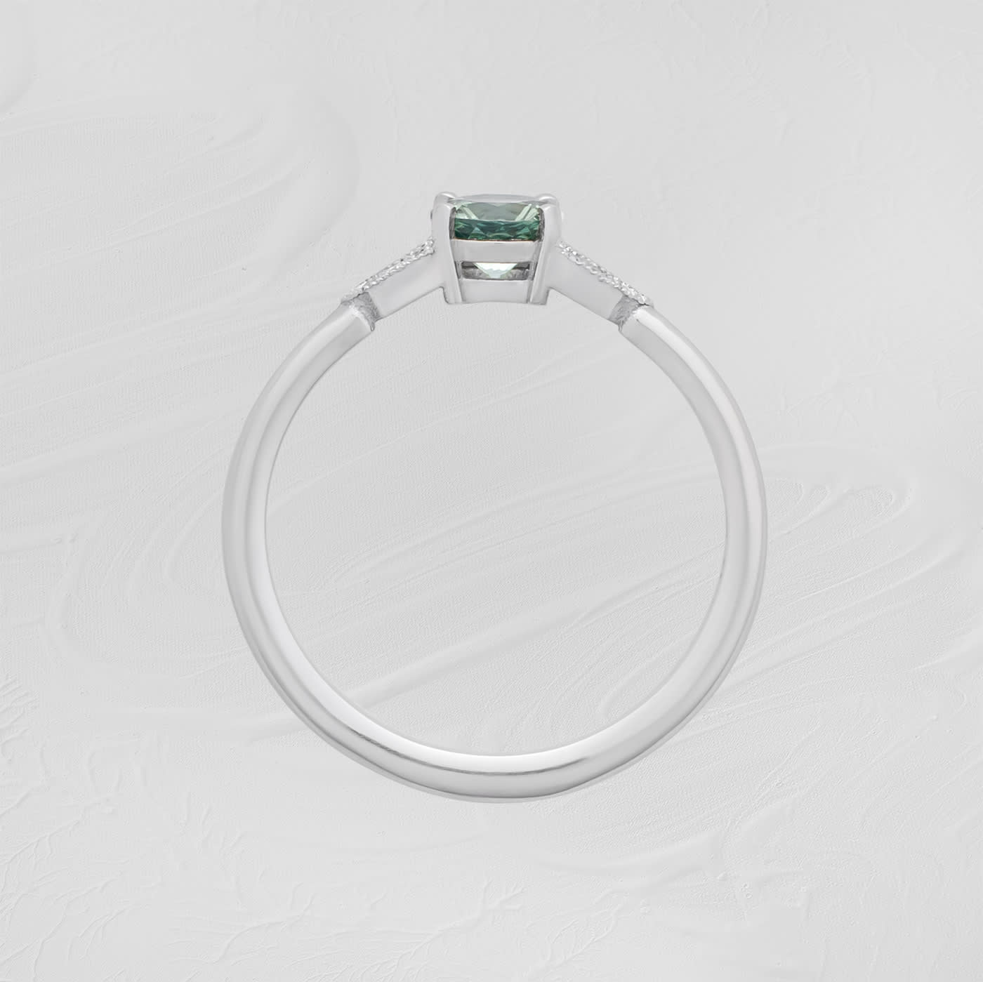 This brand new stunning ring features a central round precision cut seafoam green sapphire, set in a stunning antique 1920s inspired mount, with accent lab grown diamonds.